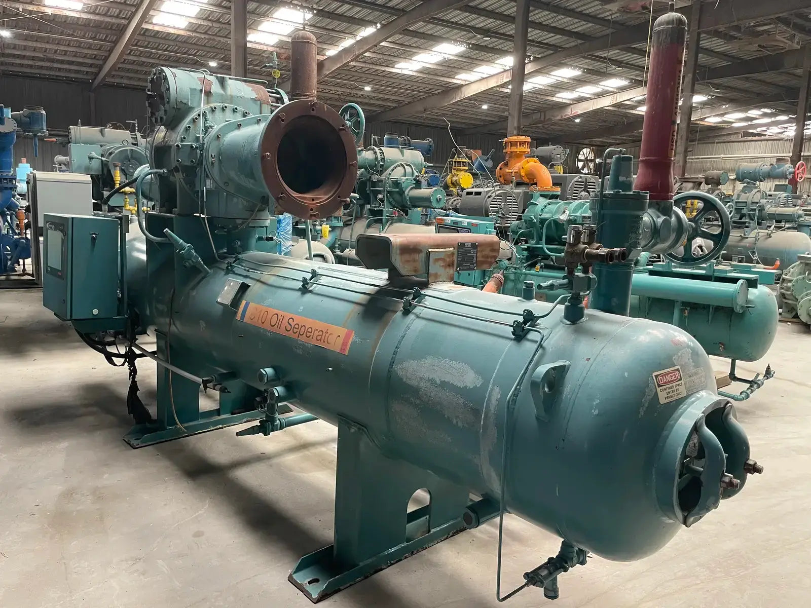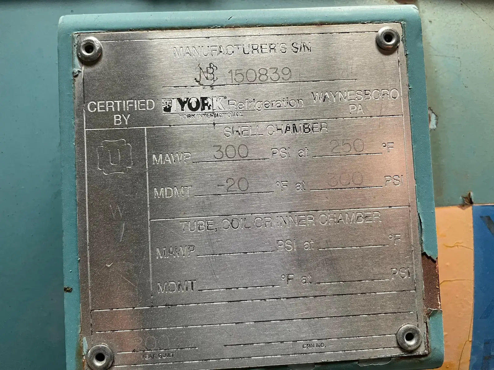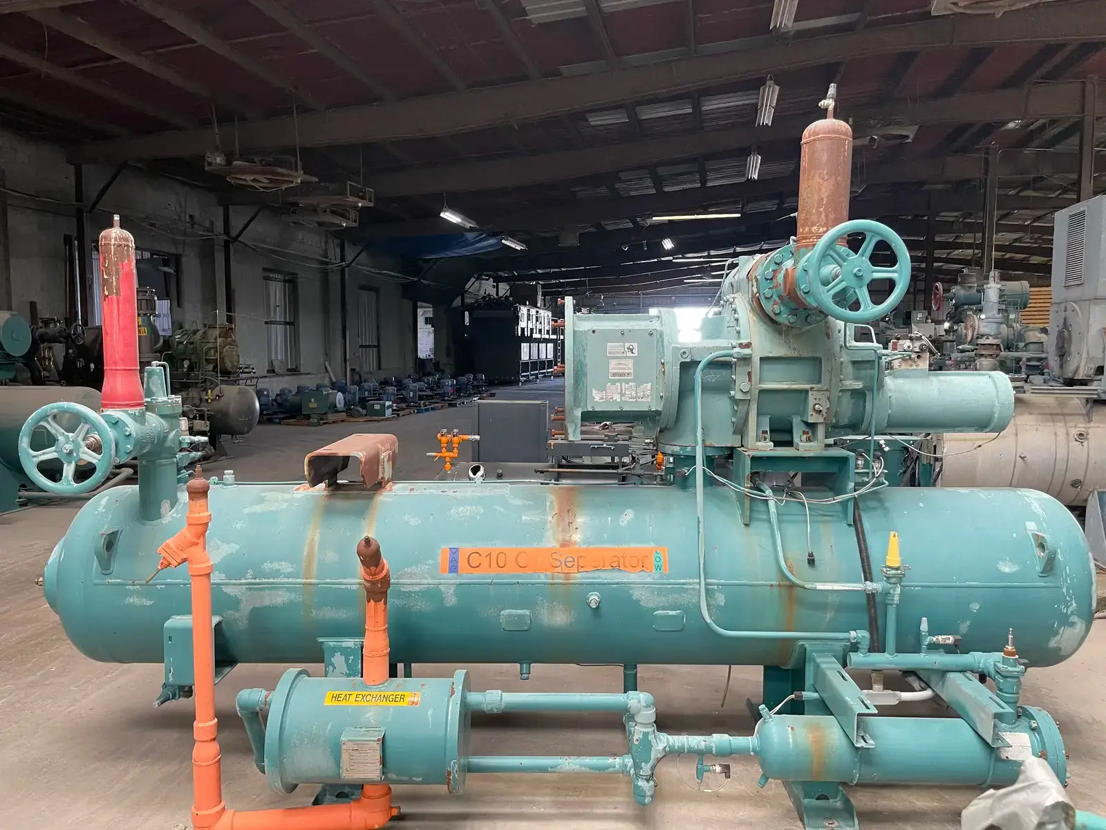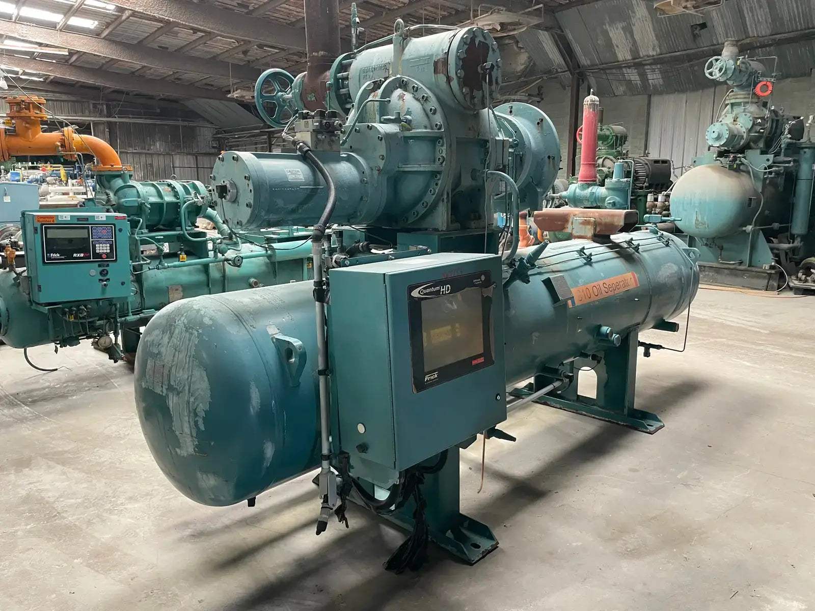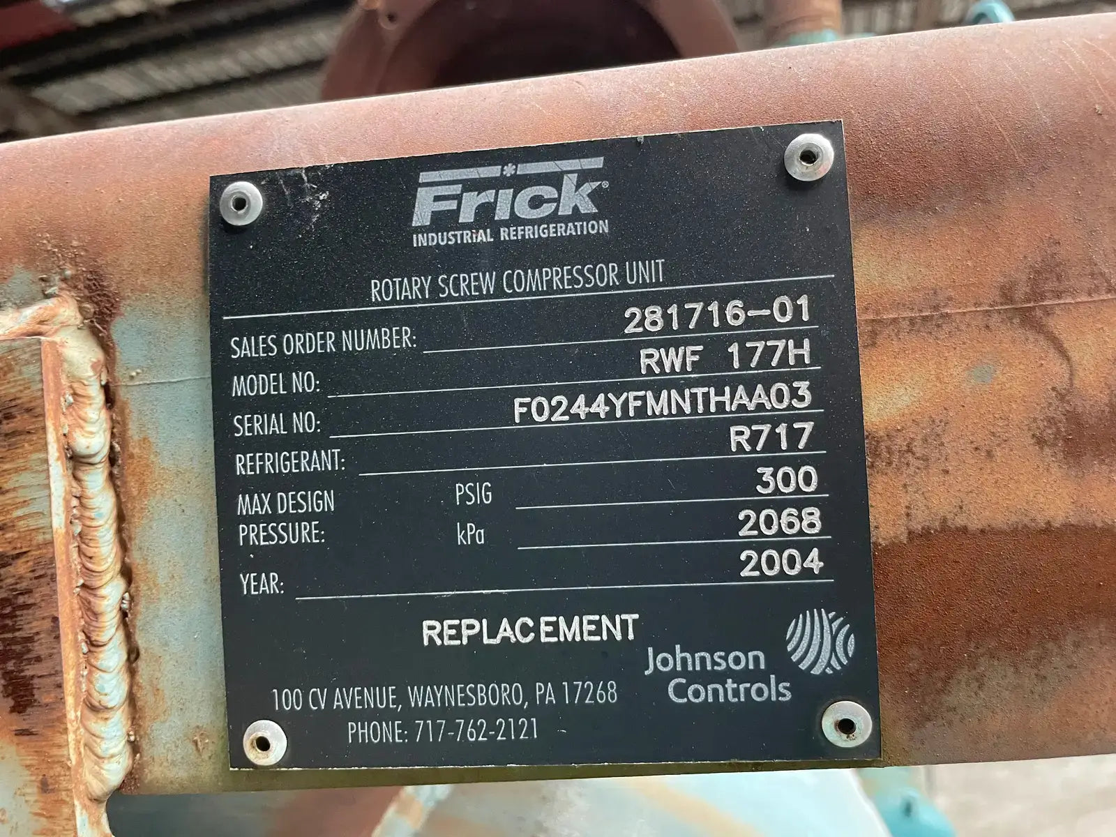 Frick RWF Series Package Rotary Screw Compressor Package. Model: RWF-177H. Serial No:F0244YFMNTHAA03. Sales Order No: 281716-01. Refrigerant: R-717. Max Design Pressure: 300. Year: 2004. Frick Bare Screw Compressor: SGC2313, Serial No: 0274, Refrigerant: R-717, Volume Ratio: 2.2-5.0, Max Rpm: 4500, Design Pressure: 400 PSI. Certified by York Refrigeration Oil Separator: National Board: 150839, MAWP: 300 PSI @ 250 F, MDMT: -20 F @ 300 PSI.