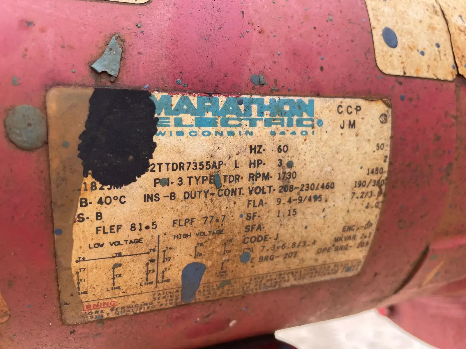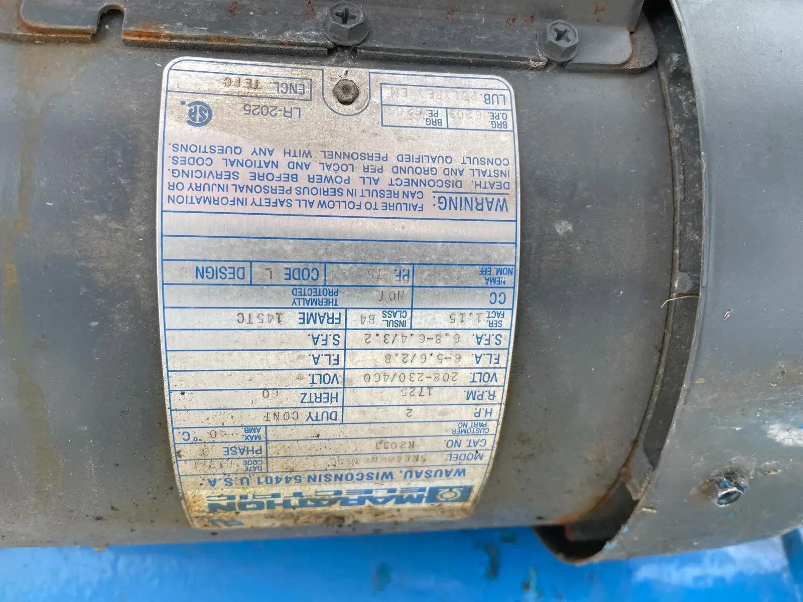 - Si hay varios motores, descripciones de motores frente a especificaciones: Grove FM232-2 Gear Drive with a 2 HP, 208-230/460 Volt Marathon electric motor. Bell & Gossett 2X2-1/2X80T Pump with a 3 HP, 208-230/460 Volt Marathon Motor.