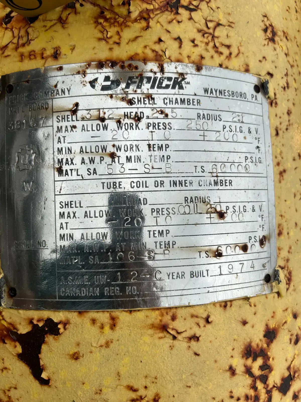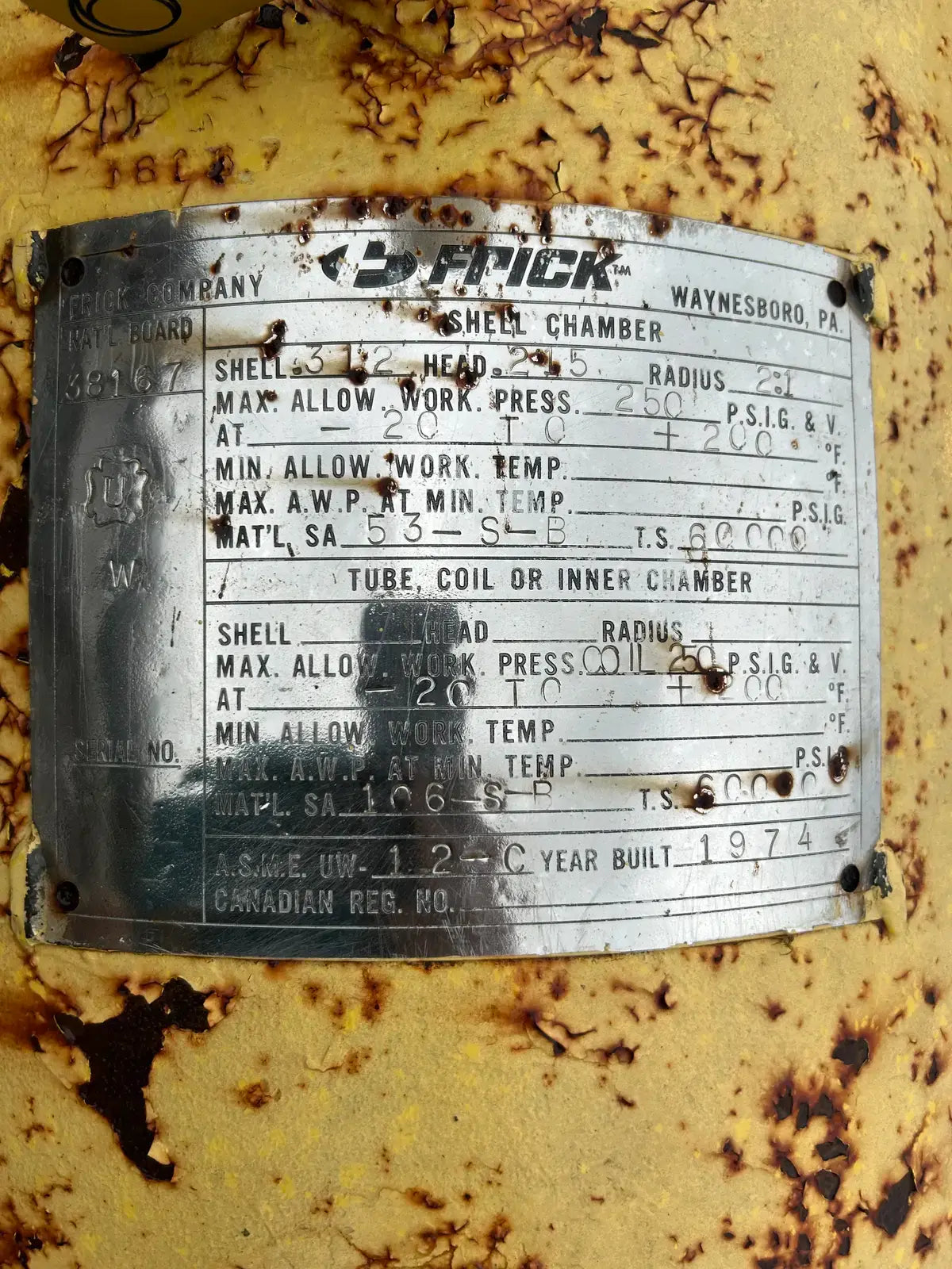 Certificado por Frick, acumulador vertical de amoníaco. Junta Nacional: 38167. Presión máxima de trabajo (MAWP): 250 PSIG a 200 °F. Presión mínima de trabajo (MDMT): -20 °F a 200 PSIG. Cámara interior del serpentín - Serpentín MAWP: 250 PSI y tensión a -20 a 200 °F. FASME UW: 12 °C. Año de construcción: 1974.