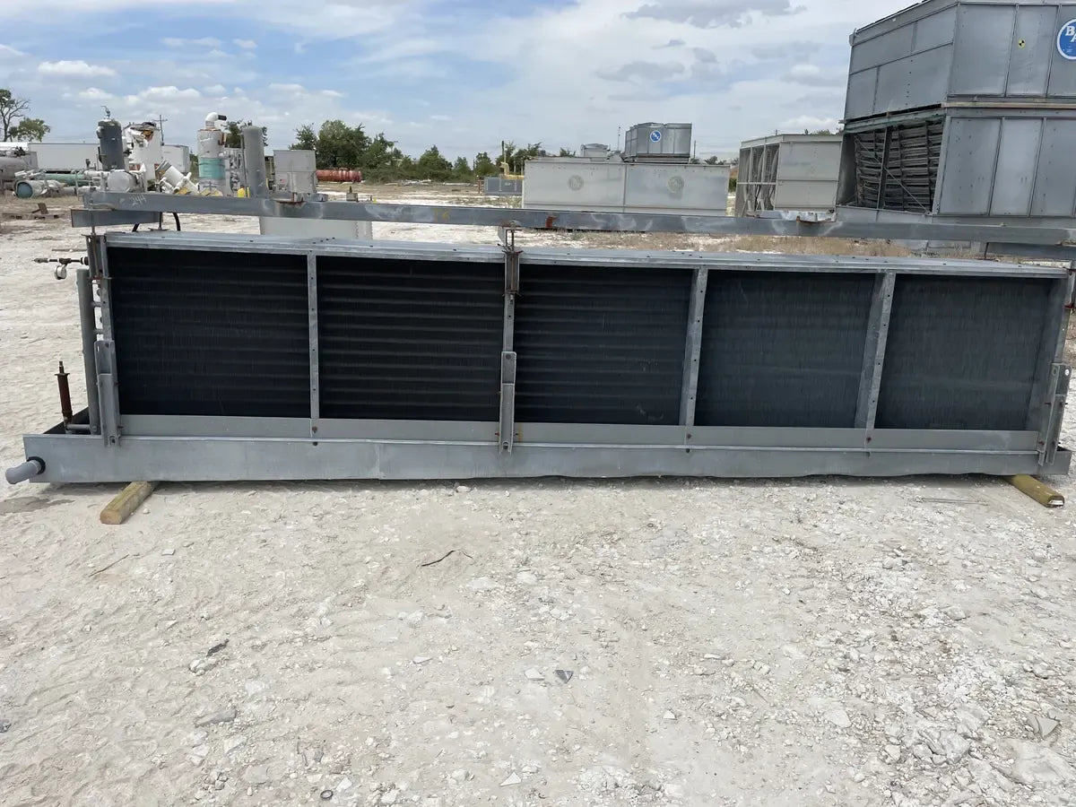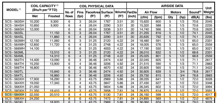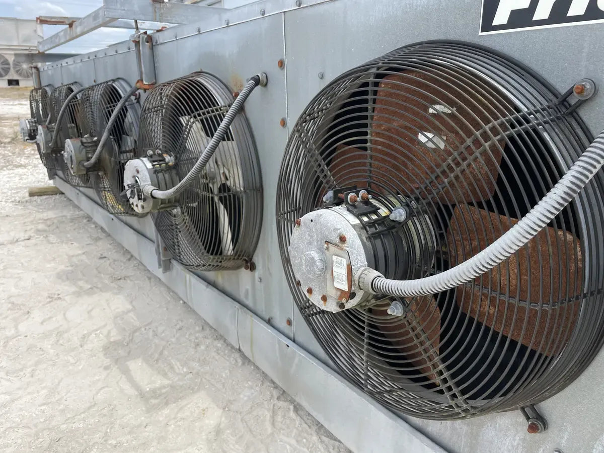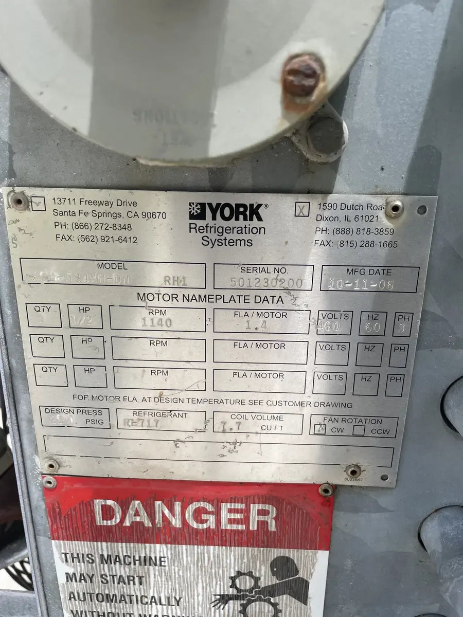 Serpentín evaporador Frick (York) SCS-584XH-DH - 28 TR, 5 ventiladores (temperatura baja/media) Esta unidad tiene compatibilidad con serpentines de temperatura baja o media. Esto le permite hacer funcionar el evaporador con serpentines húmedos o escarchados. Una capacidad húmeda de 22550 (BTUH / °F TD) con un tonelaje estimado de 28,1875 (TR) a 15TD. Una capacidad helada de 20510 (BTUH / °F TD) y un tonelaje estimado de 26 (TR) @15TD. Un flujo de aire que llega a 26160 CFM con una velocidad frontal de 598 FPM. Baterías de expansión directa alimentadas por el fondo con sistema de descongelación por gas. El refrigerante anterior era el amoníaco. Con la unidad se incluyen motores de 5,5 HP.