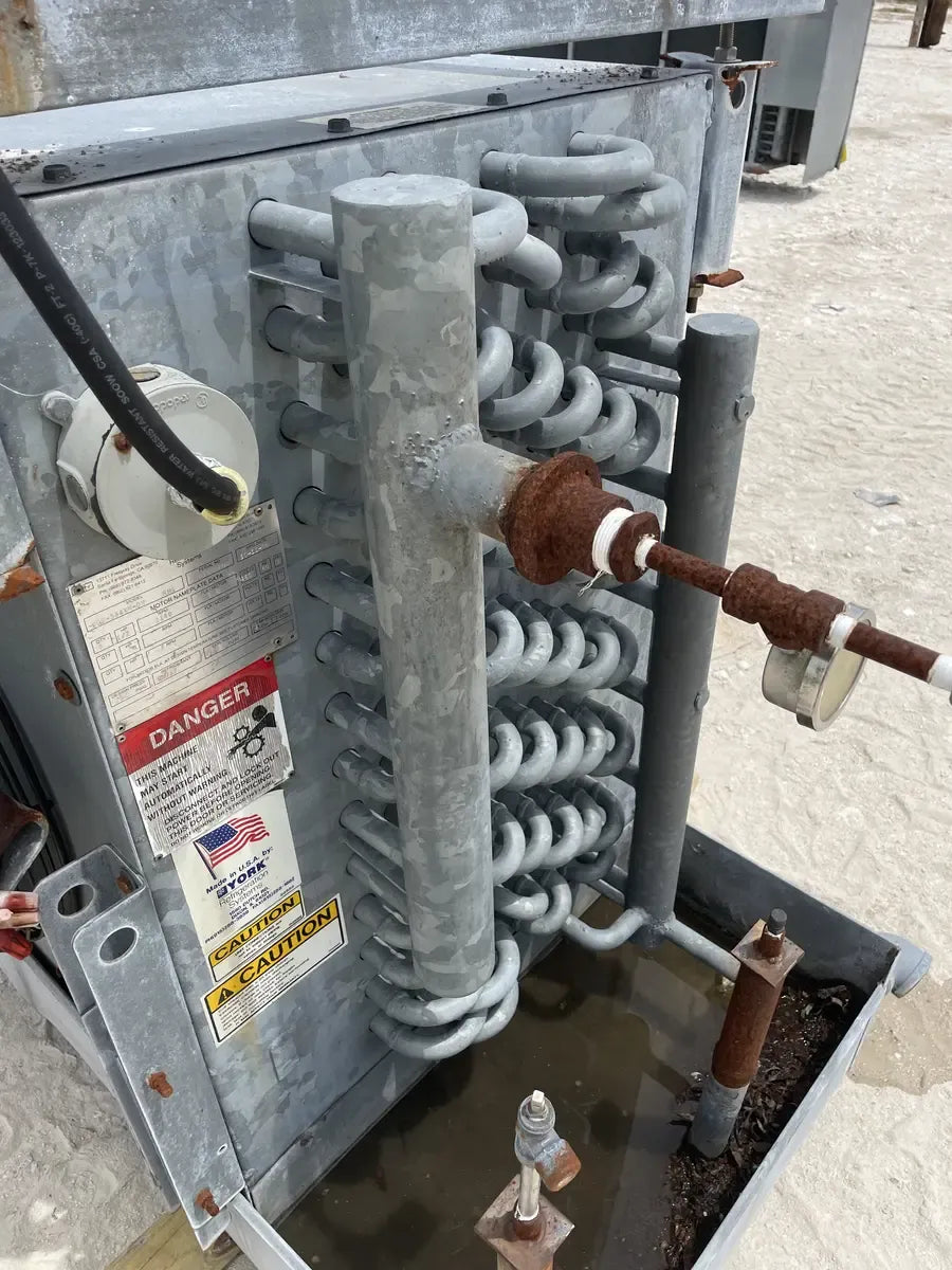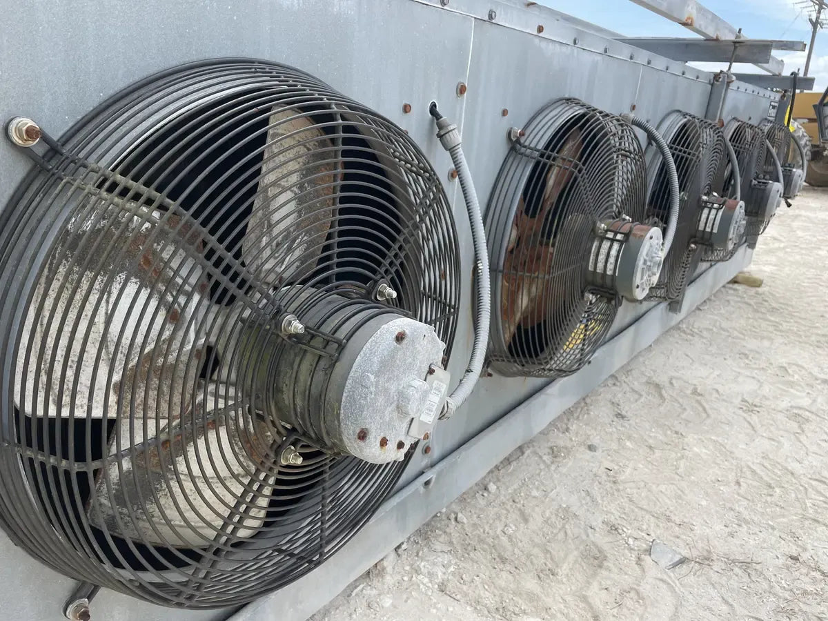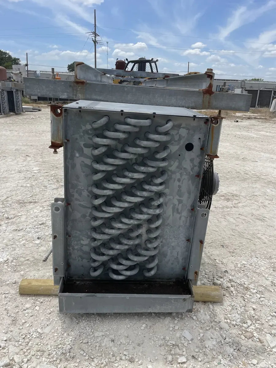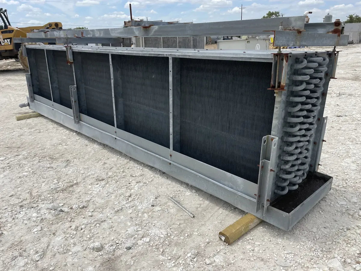 Serpentín evaporador Frick (York) SCS-584XH-DH - 28 TR, 5 ventiladores (temperatura baja/media) Esta unidad tiene compatibilidad con serpentines de temperatura baja o media. Esto le permite hacer funcionar el evaporador con serpentines húmedos o escarchados. Una capacidad húmeda de 22550 (BTUH / °F TD) con un tonelaje estimado de 28,1875 (TR) a 15TD. Una capacidad helada de 20510 (BTUH / °F TD) y un tonelaje estimado de 26 (TR) @15TD. Un flujo de aire que llega a 26160 CFM con una velocidad frontal de 598 FPM. Baterías de expansión directa alimentadas por el fondo con sistema de descongelación por gas. El refrigerante anterior era el amoníaco. Con la unidad se incluyen motores de 5,5 HP.