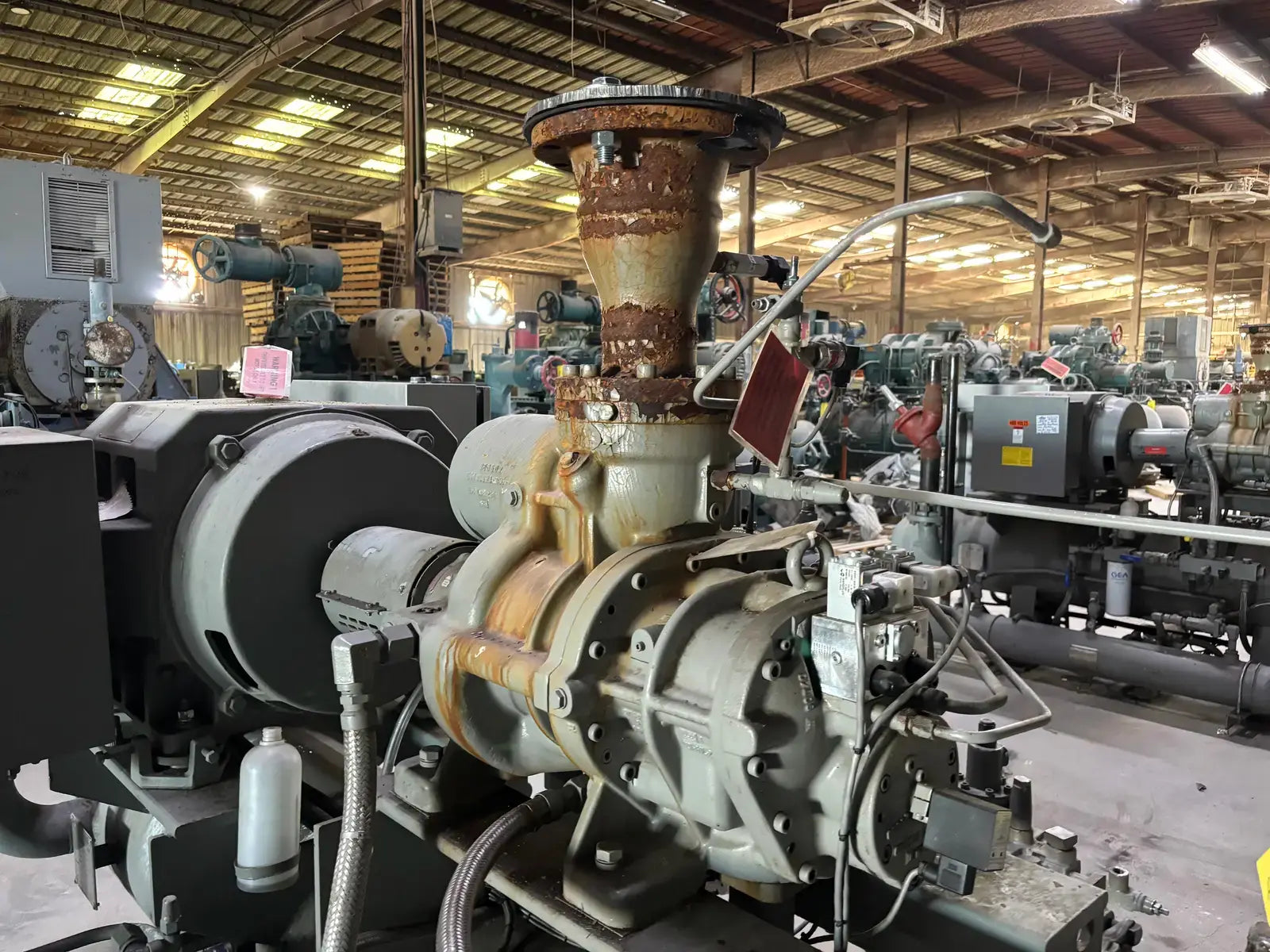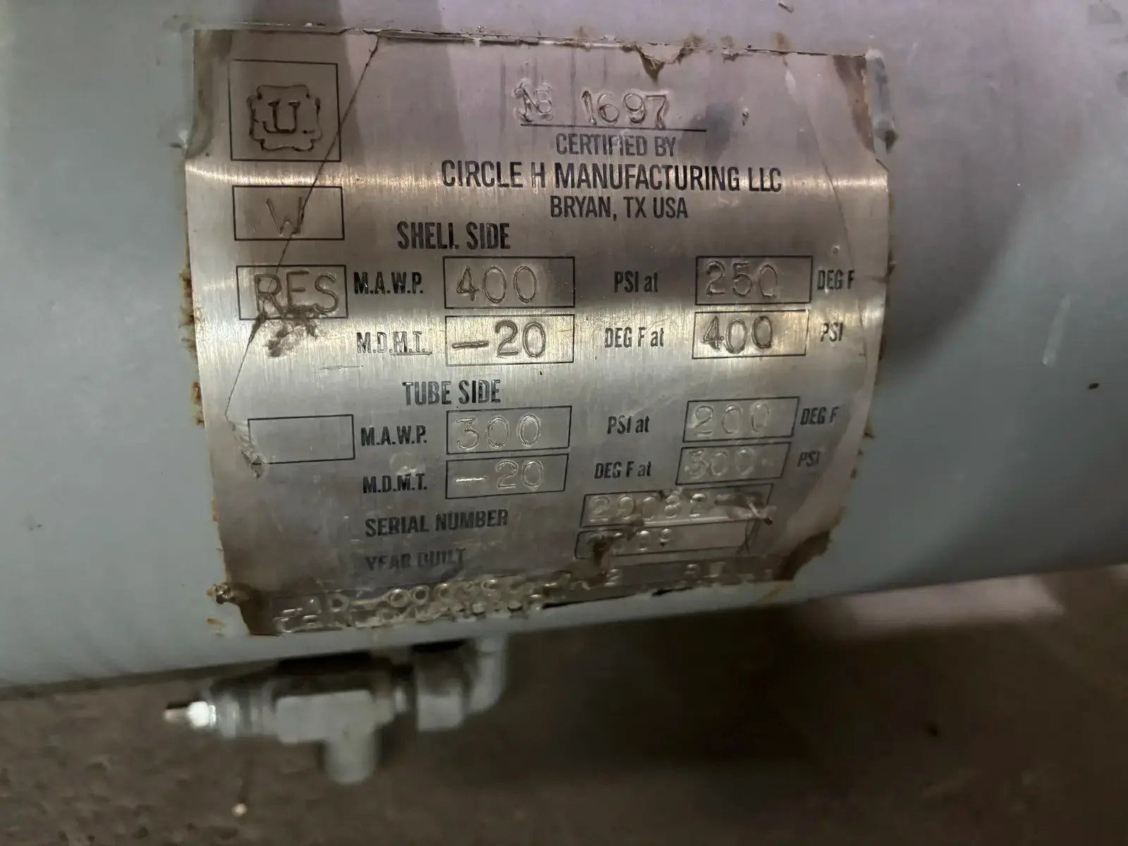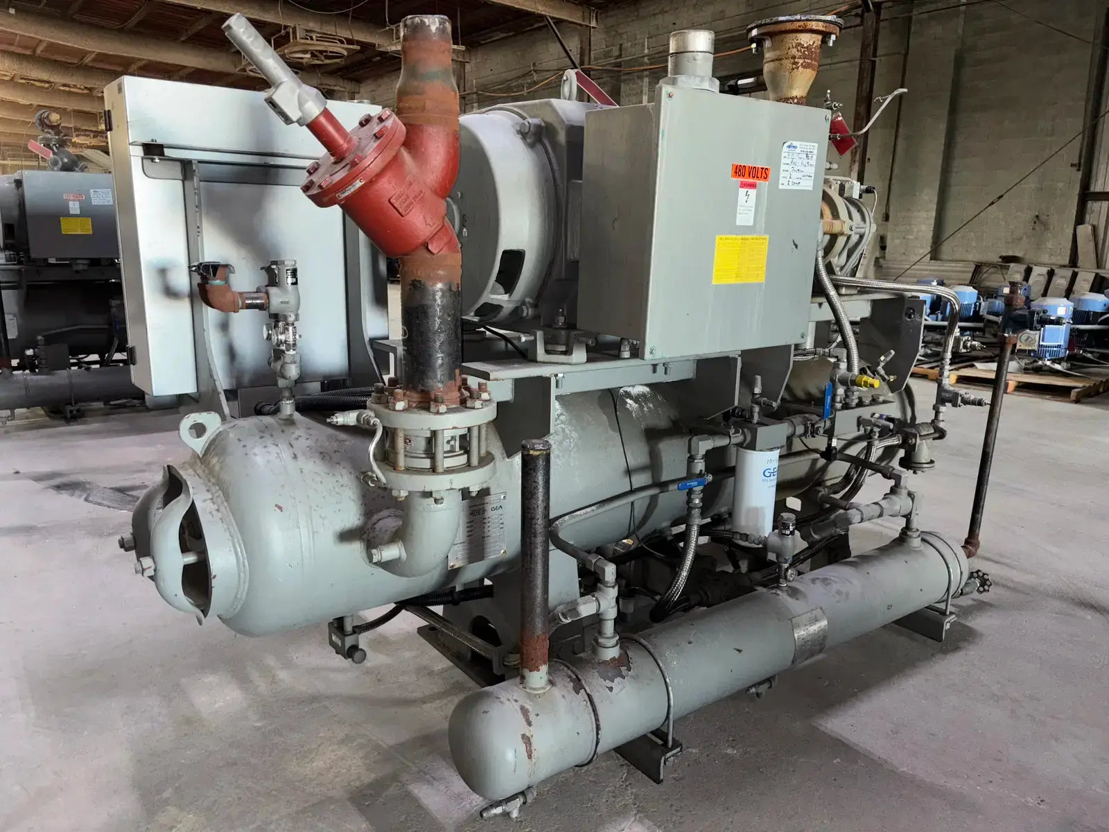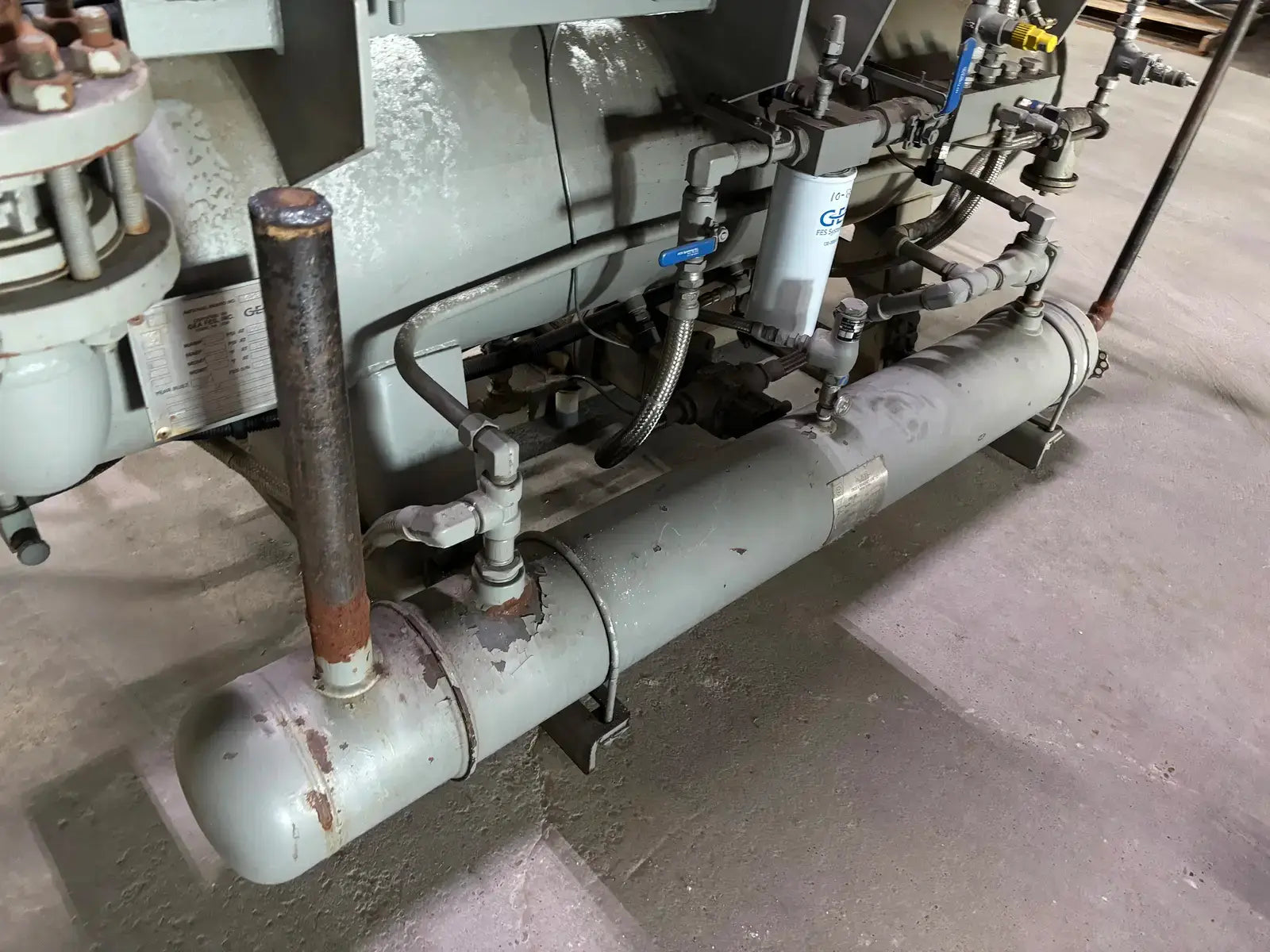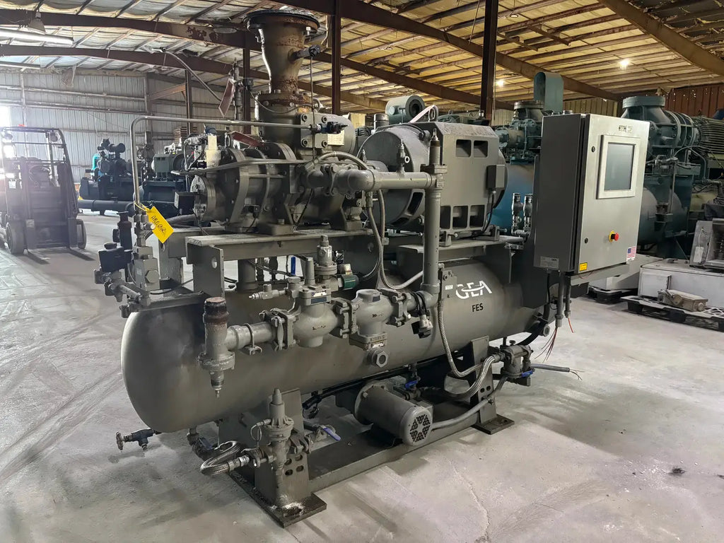 GEA/FES G Series Rotary Screw Compressor Package. Package Model: 110GME. Serial No: 09305011. Refrigerant: R-507. Cooling Type: Thermosiphon. GEA Bare Screw Compressor: Model: HR-H2655S-28, Serial No: H1056, Mark: 2, Year of Mfg: 2009, Hydraulic Test Pressure: 620 PSI, Max Design Working Pressure: 406 PSIG, Geometric Swept Volume @ 3550 RPM: 335 CFM. Refrigerant: R-507. Certified By GEA/FES Oil Separator: National Board: 6599, MAWP: 350 PSI @ 300F, MDMT: -20 F @ 350 F.