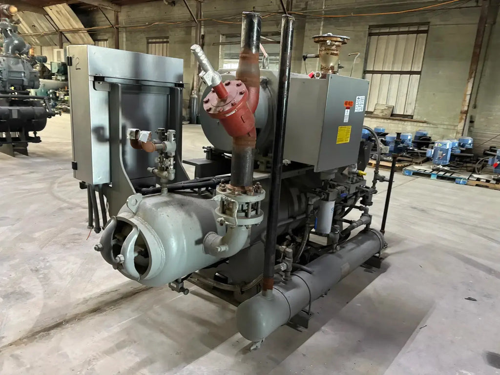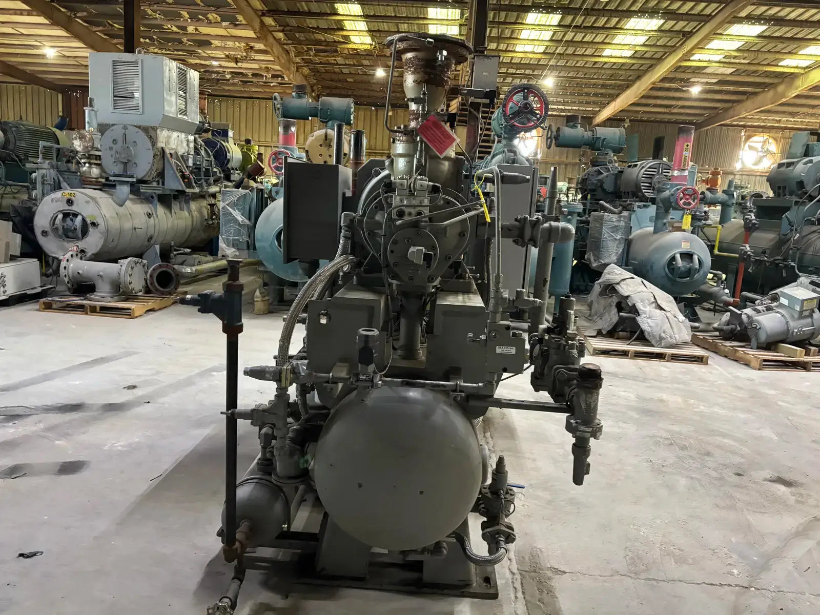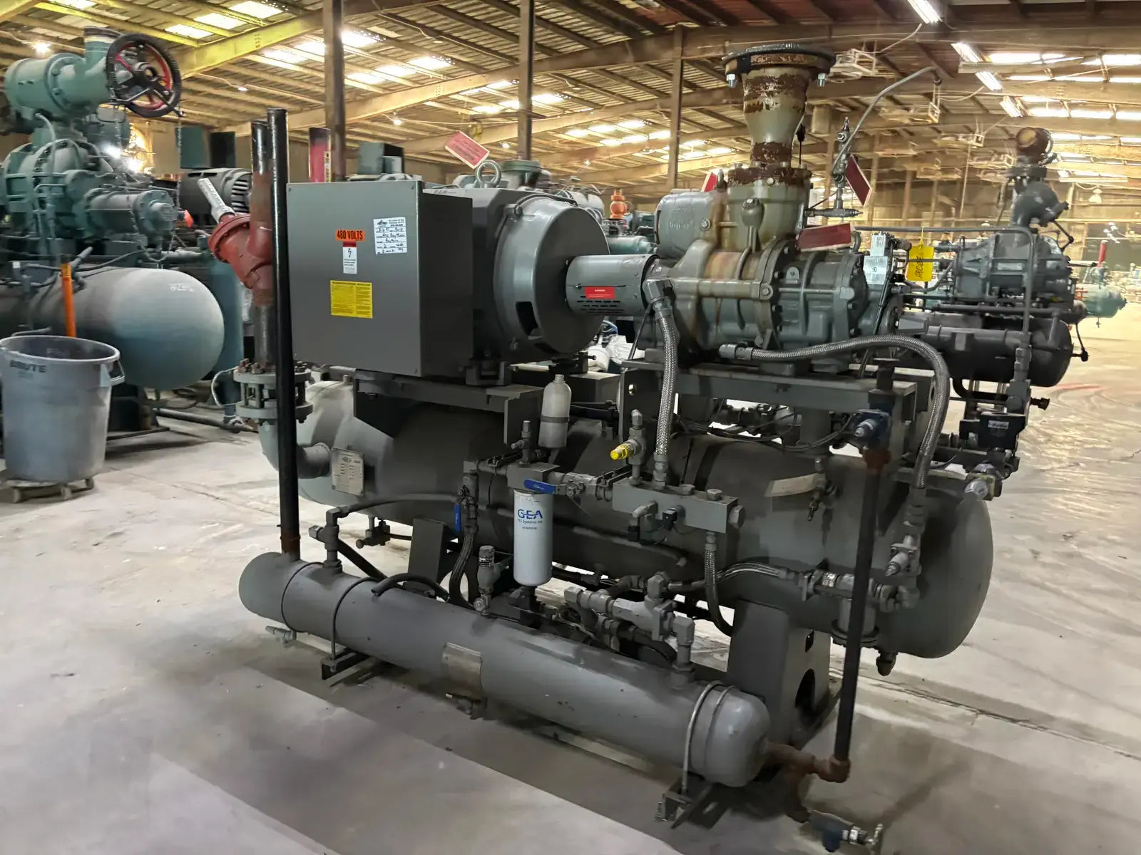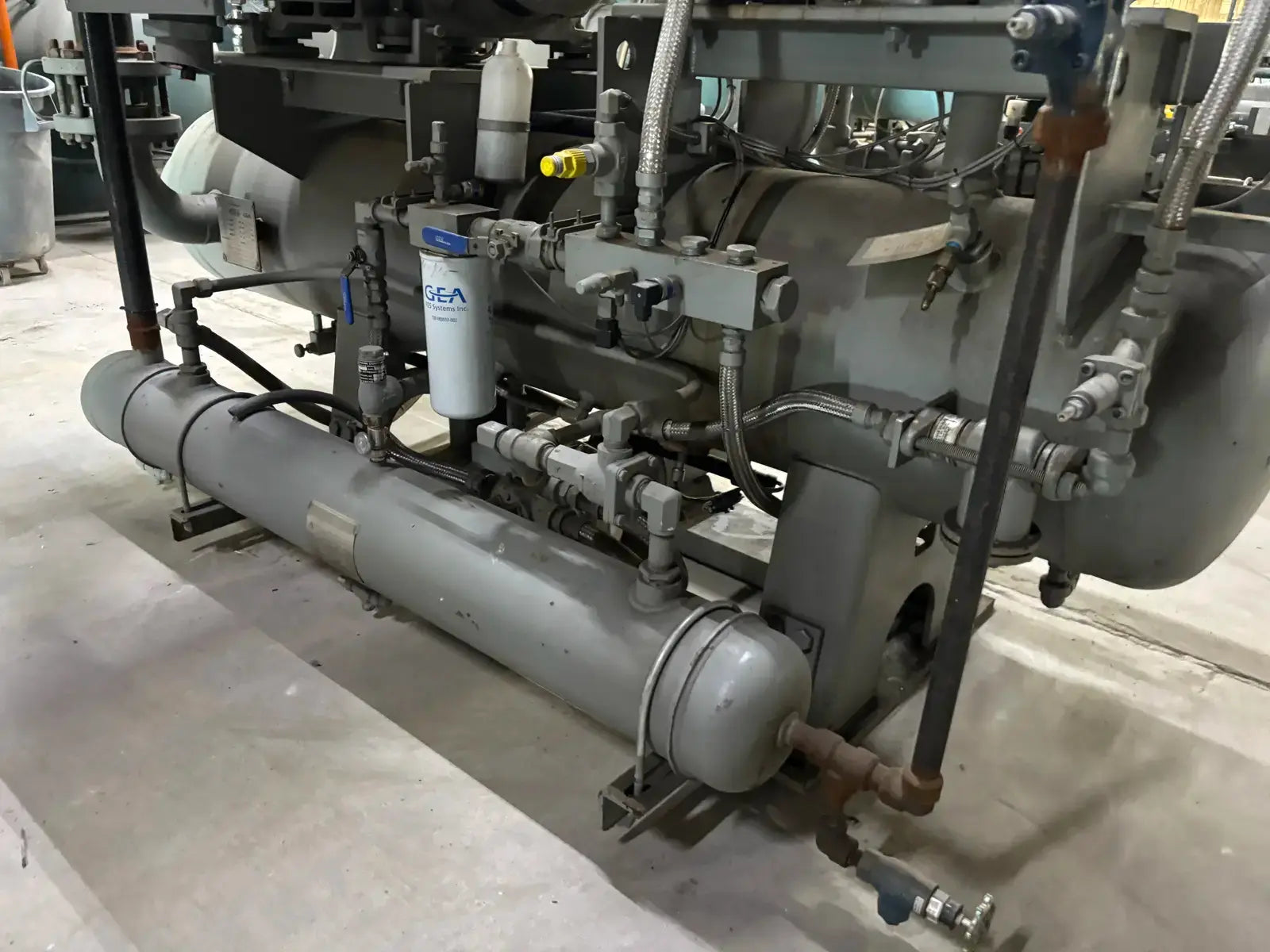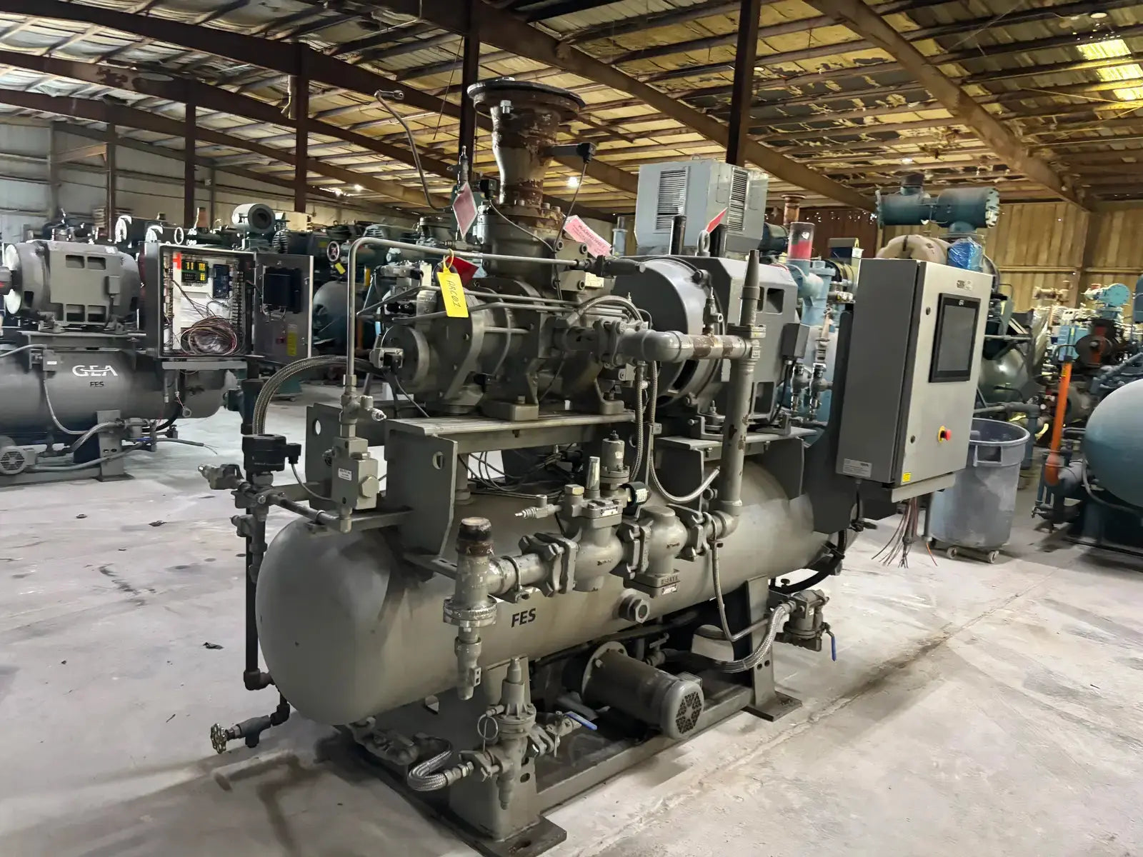 GEA/FES G Series Rotary Screw Compressor Package. Package Model: 110GME. Serial No: 09305012. Refrigerant: R-507. Cooling Type: Thermosiphon. GEA Bare Screw Compressor: Model: HR-H2655S-28, Serial No: H1065, Mark: 2, Year of Mfg: 2009, Hydraulic Test Pressure: 620 PSI, Max Design Working Pressure: 406 PSIG, Geometric Swept Volume @ 3550 RPM: 335 CFM. Refrigerant: R-507. Certified By GEA/FES Oil Separator: National Board: 6599, MAWP: 350 PSI @ 300F, MDMT: -20 F @ 350 F.