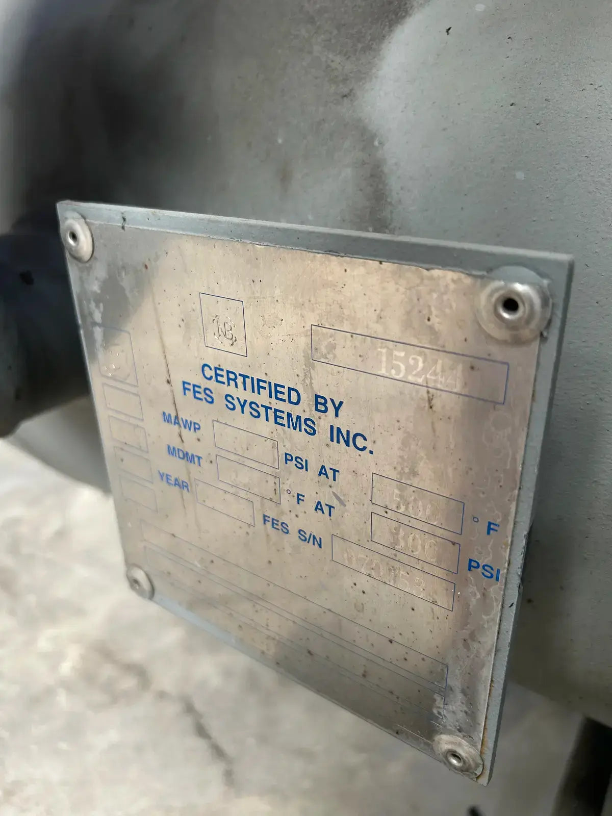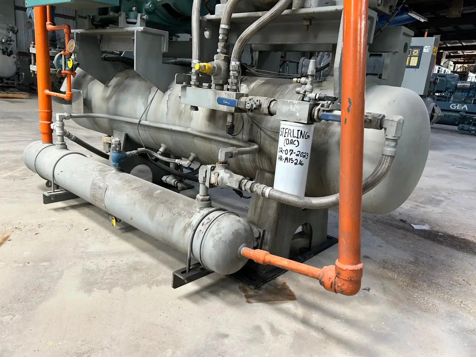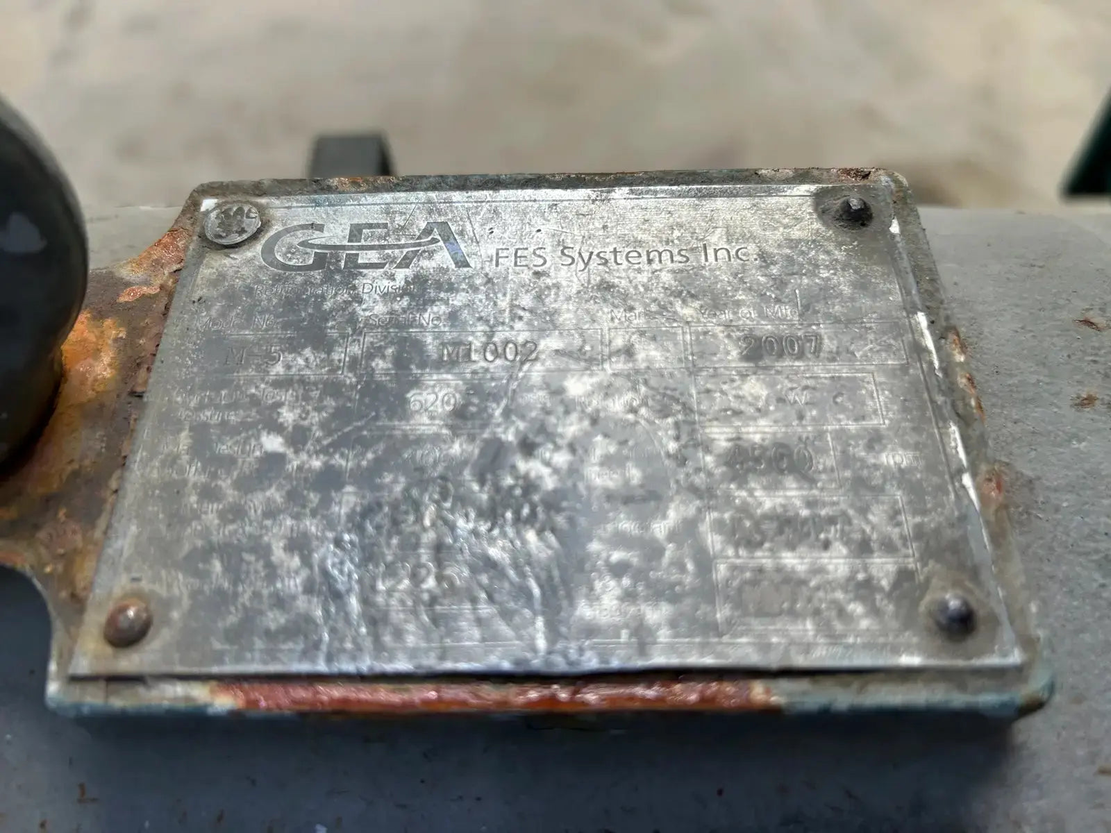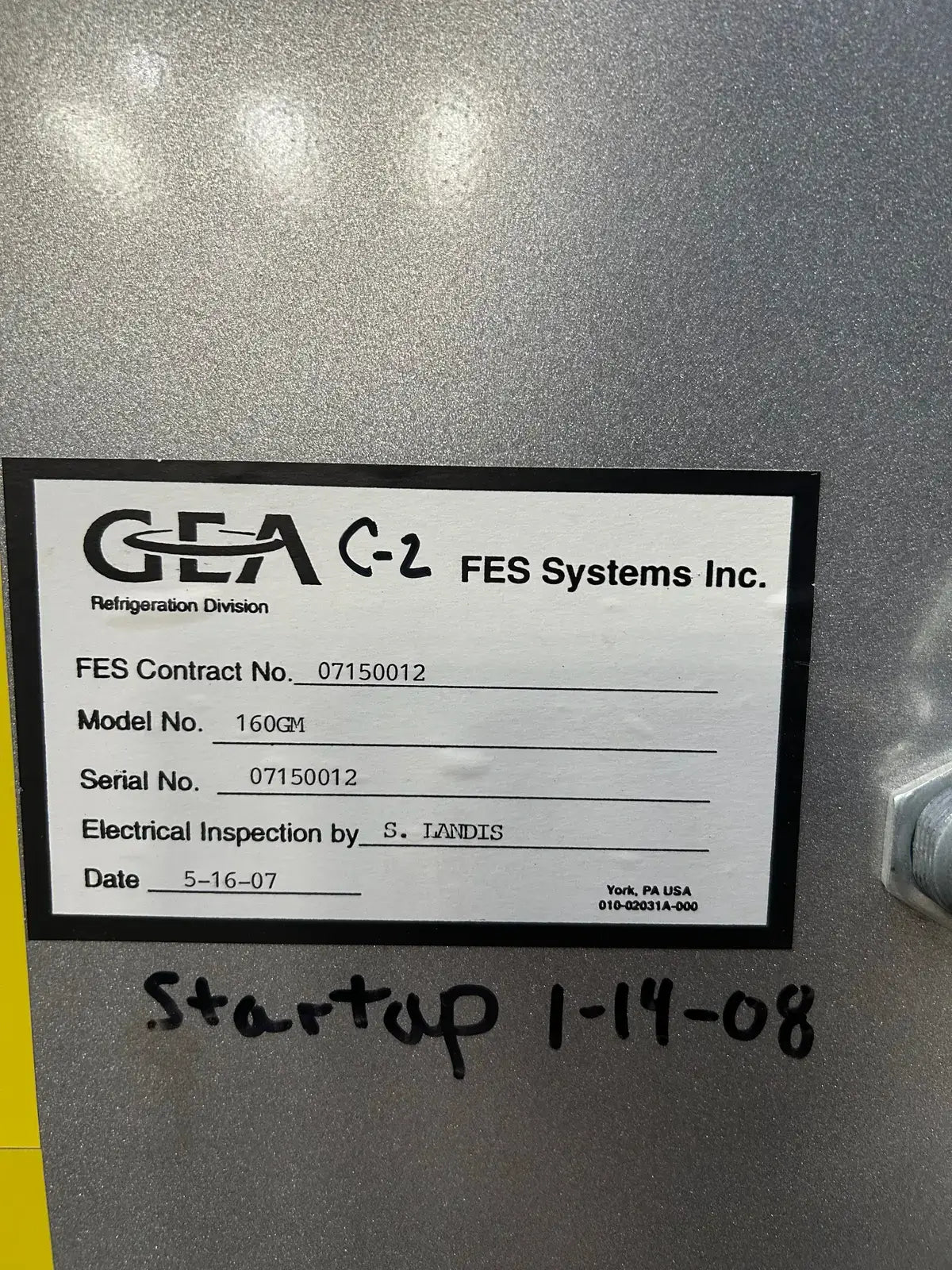 Paquete de compresor de tornillo GEA/FES. Modelo: 160GM. N.° de serie: 07150012. N.° de contrato FES: 07150012. Compresor de tornillo GEA/FES: Modelo: M-5, N.° de serie: M1002. Presión máxima de diseño: 406 PSIG, RPM máximas: 4500. Refrigerante: R-717. Certificado por FES Systems Inc. Separador de aceite - Junta Nacional: 15244. Presión máxima de trabajo (MAWP): 300 PSI a 260 °C (500 °F), Presión mínima de trabajo (MDMT): -20 °C a 300 PSI.