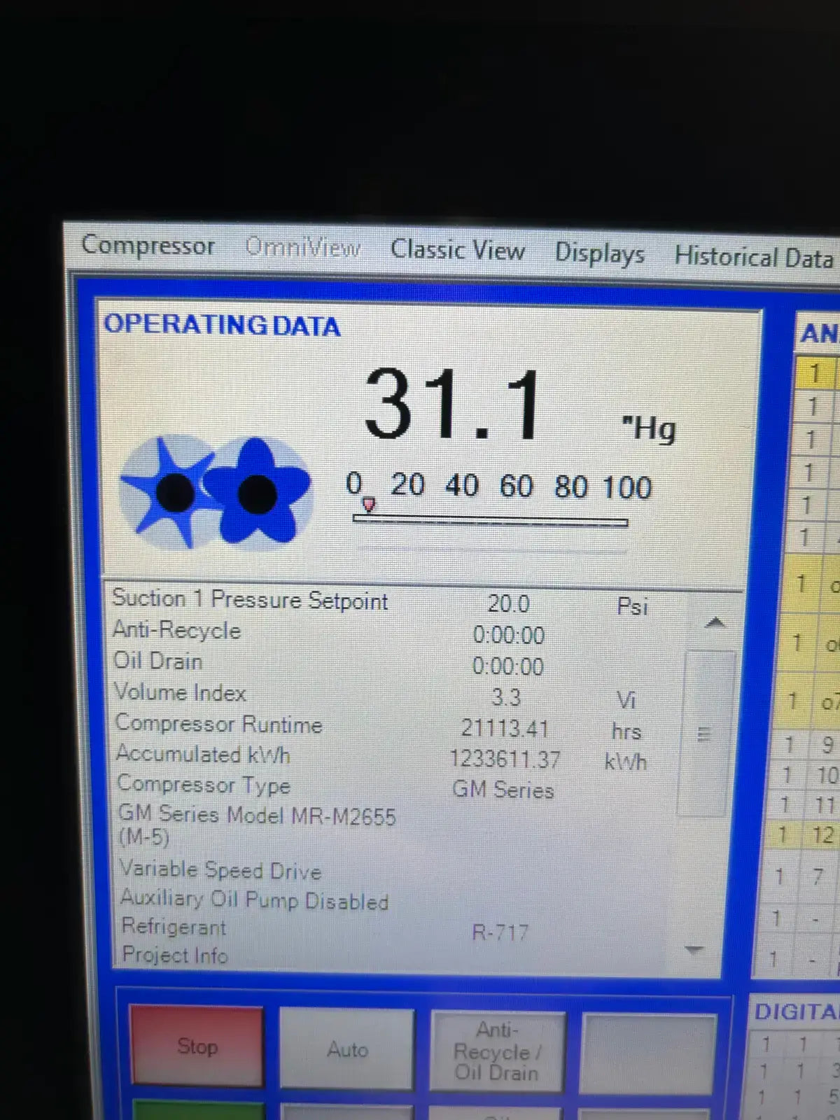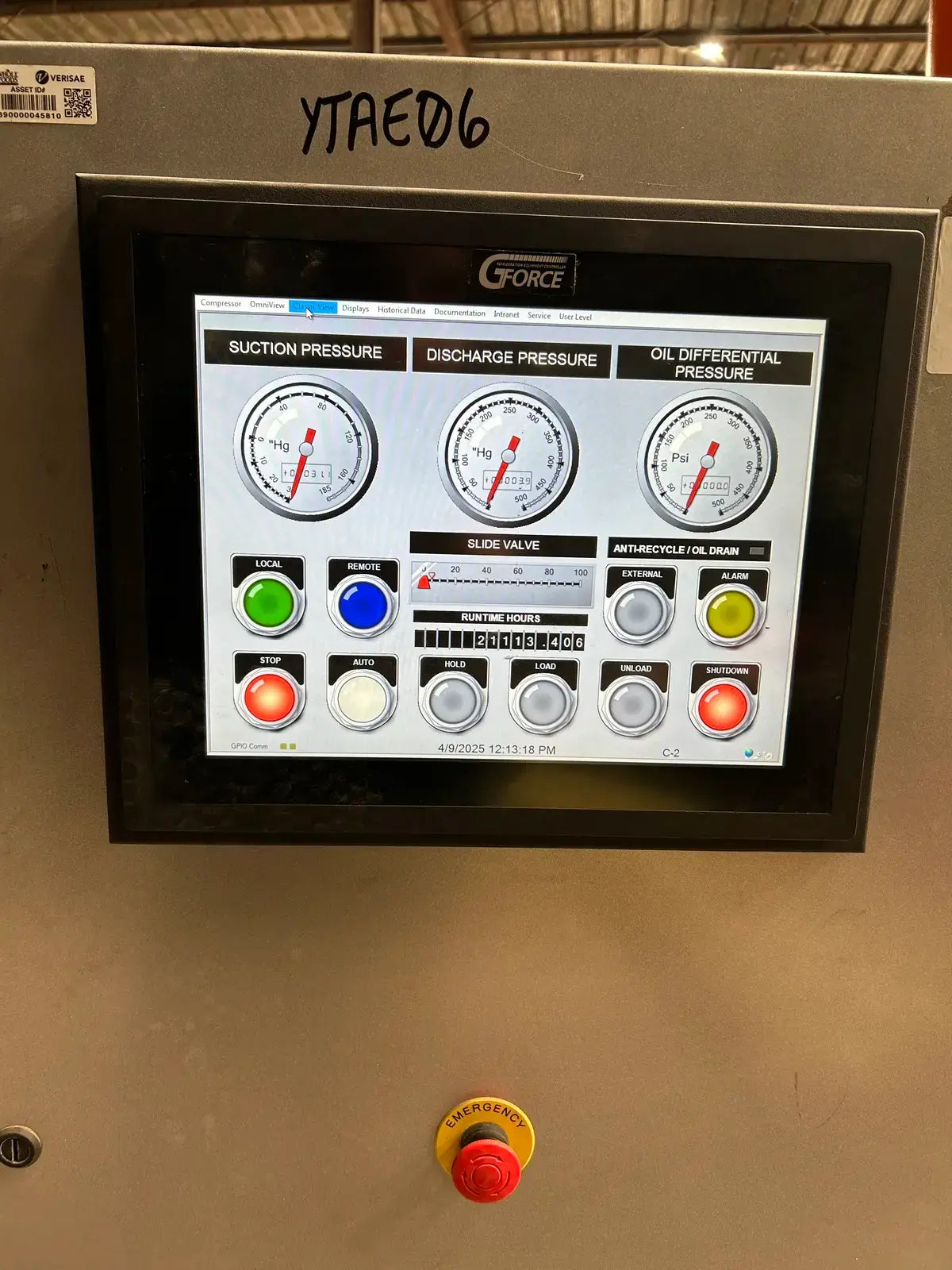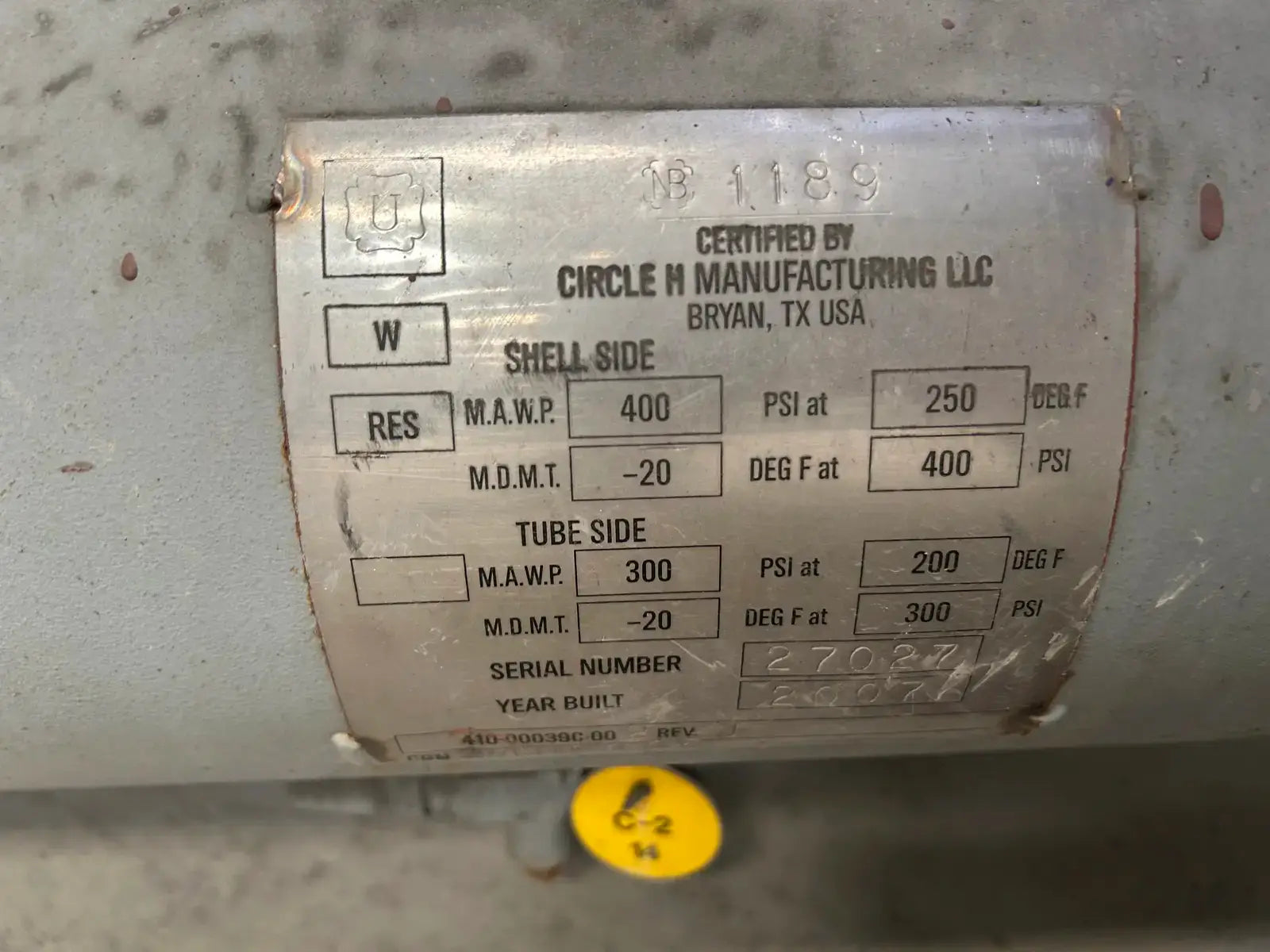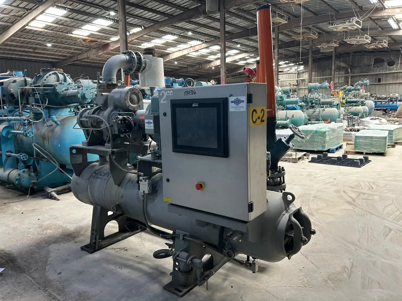 Paquete de compresor de tornillo GEA/FES. Modelo: 160GM. N.° de serie: 07150012. N.° de contrato FES: 07150012. Compresor de tornillo GEA/FES: Modelo: M-5, N.° de serie: M1002. Presión máxima de diseño: 406 PSIG, RPM máximas: 4500. Refrigerante: R-717. Certificado por FES Systems Inc. Separador de aceite - Junta Nacional: 15244. Presión máxima de trabajo (MAWP): 300 PSI a 260 °C (500 °F), Presión mínima de trabajo (MDMT): -20 °C a 300 PSI.