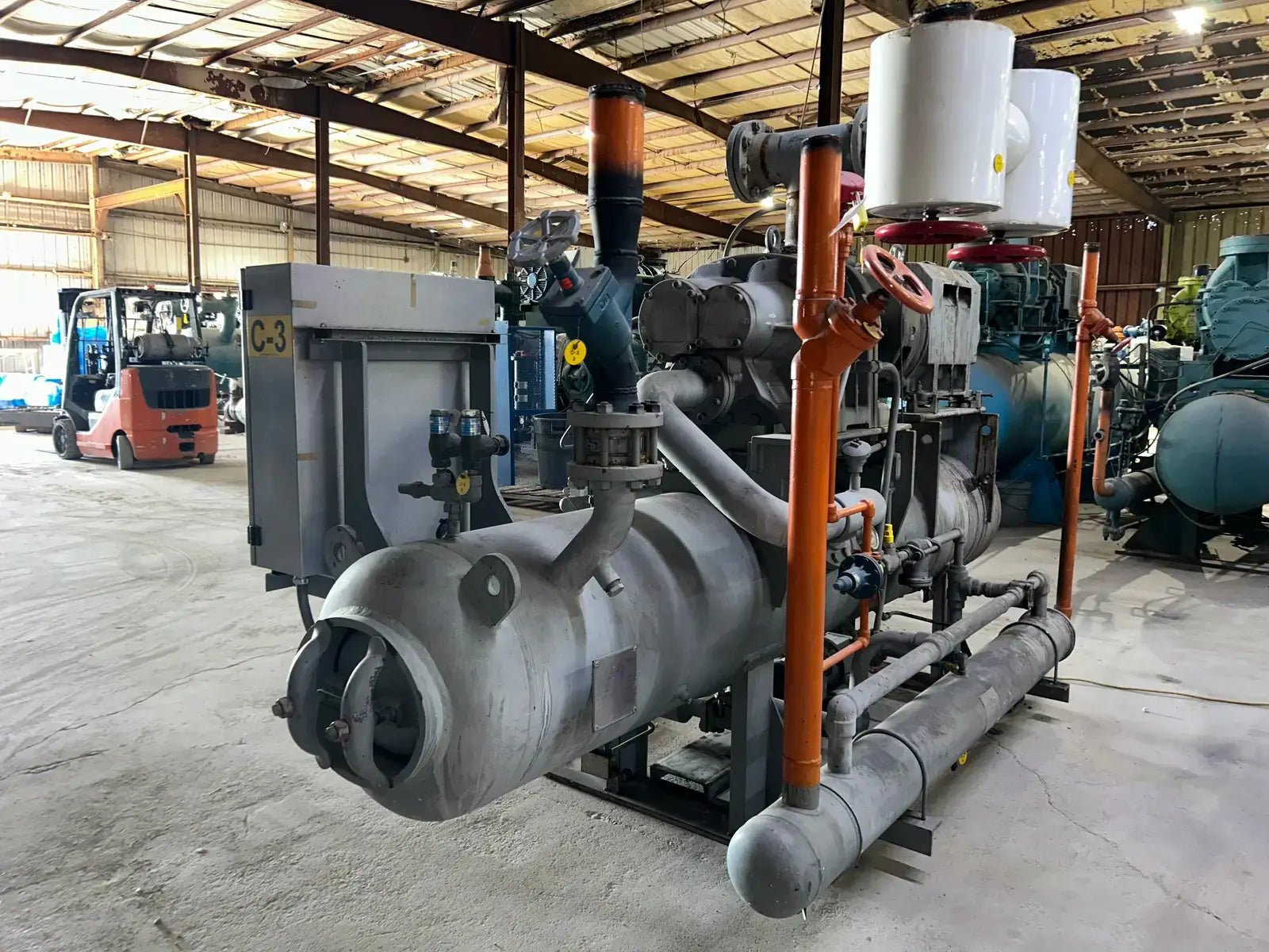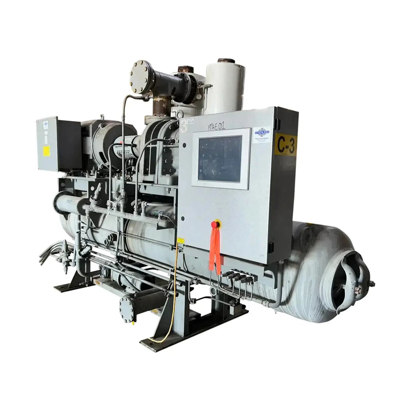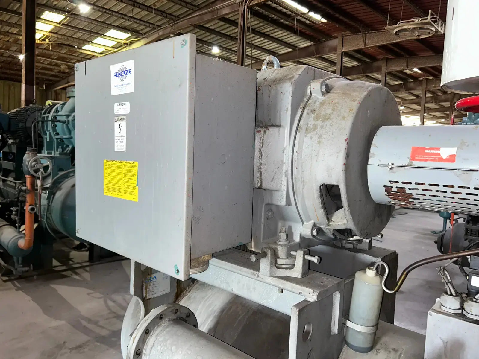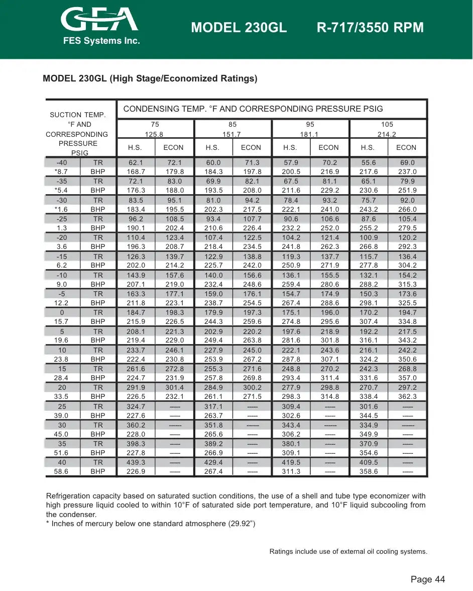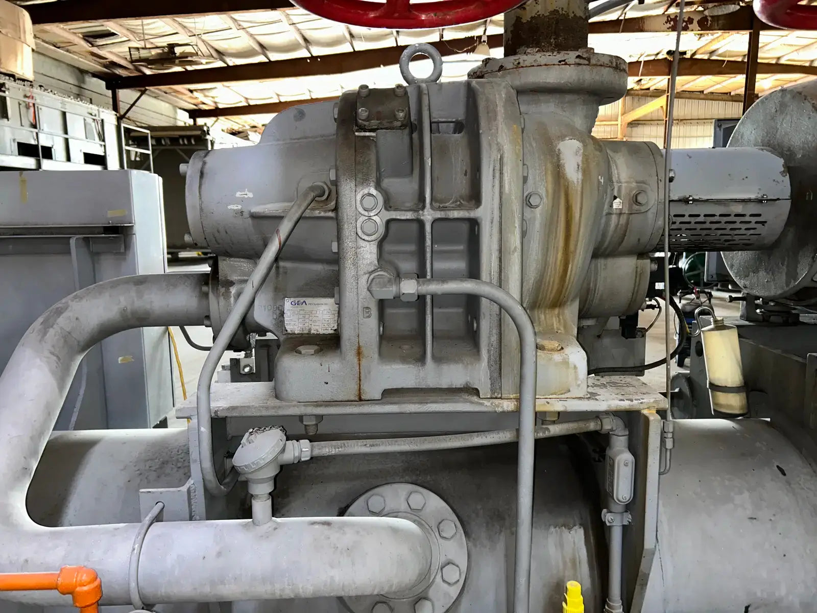 Paquete de compresor de tornillo GEA/FES. Modelo: 230GL GForce. N.° de serie: 07150013. Refrigerante: R-717. ID: REF-045. Tipo de refrigeración: Termosifón. Tamaño: 807. Compresor de tornillo GEA - Modelo: R-52, N.° de serie: R1090, Mark 3, Rpm máx.: 3600, PSI máx.: 406, Refrigerante: R-717. Diagrama de tuberías e inyectores: LV22-R4. Volumen de barrido geométrico a 3550 RPM: 739 CFM. Certificado por FES Systems Inc. Separador de aceite: National Board: 15245, Presión máxima de trabajo (MAWP): 300 PSI a 300 °F. Presión mínima de trabajo (MDMT): -20 °F a 300 PSI. Año de fabricación: 2007.