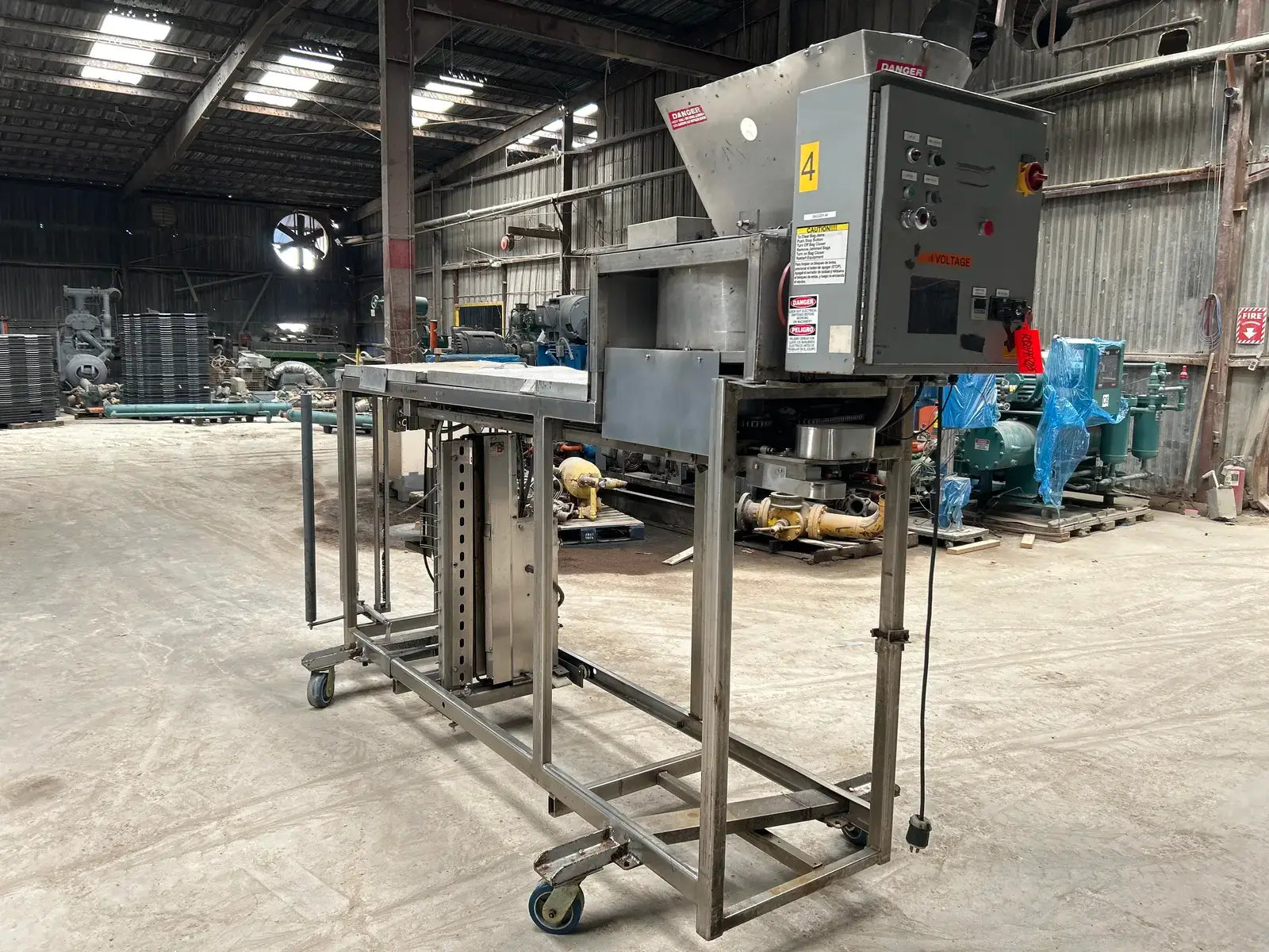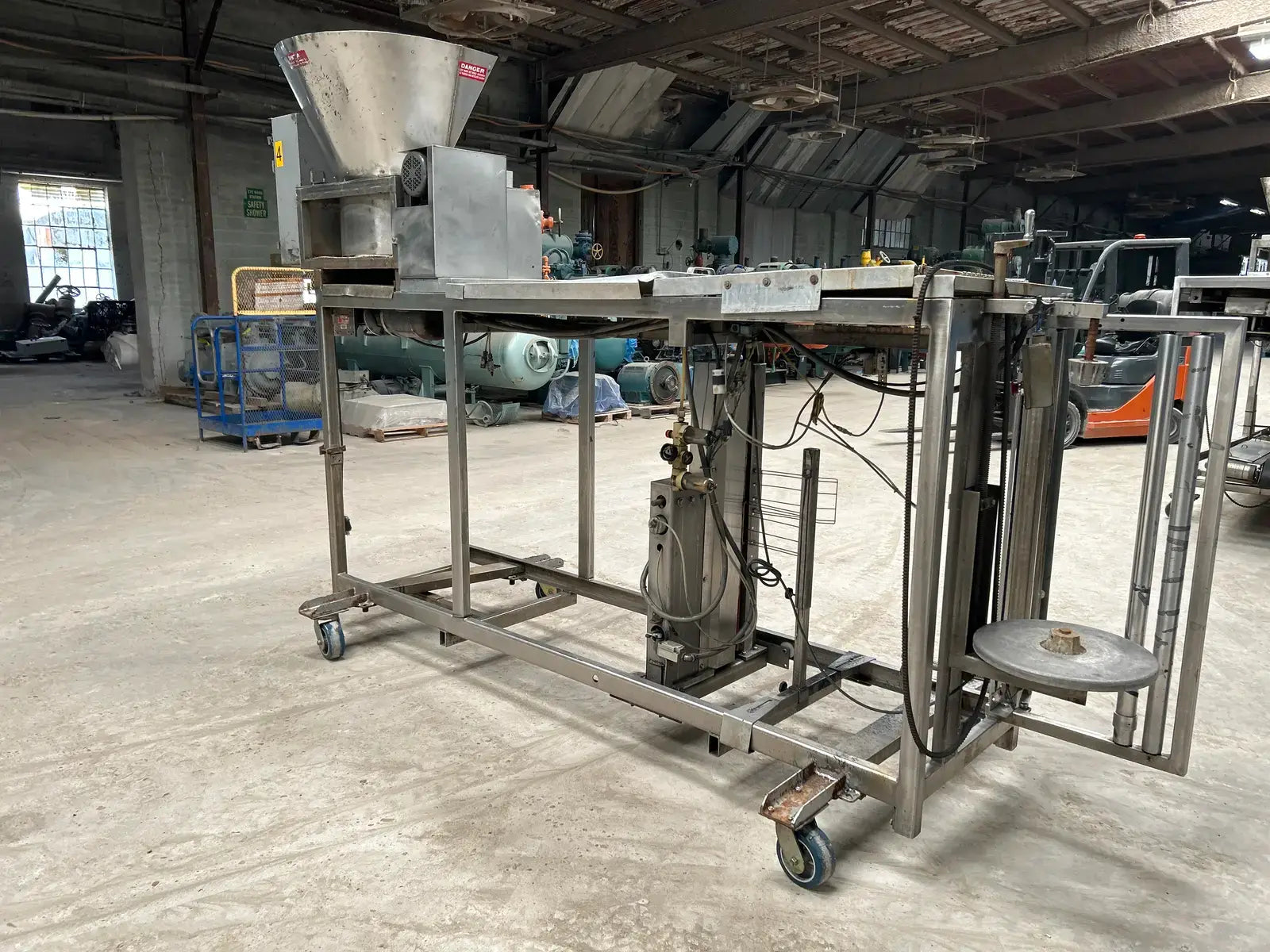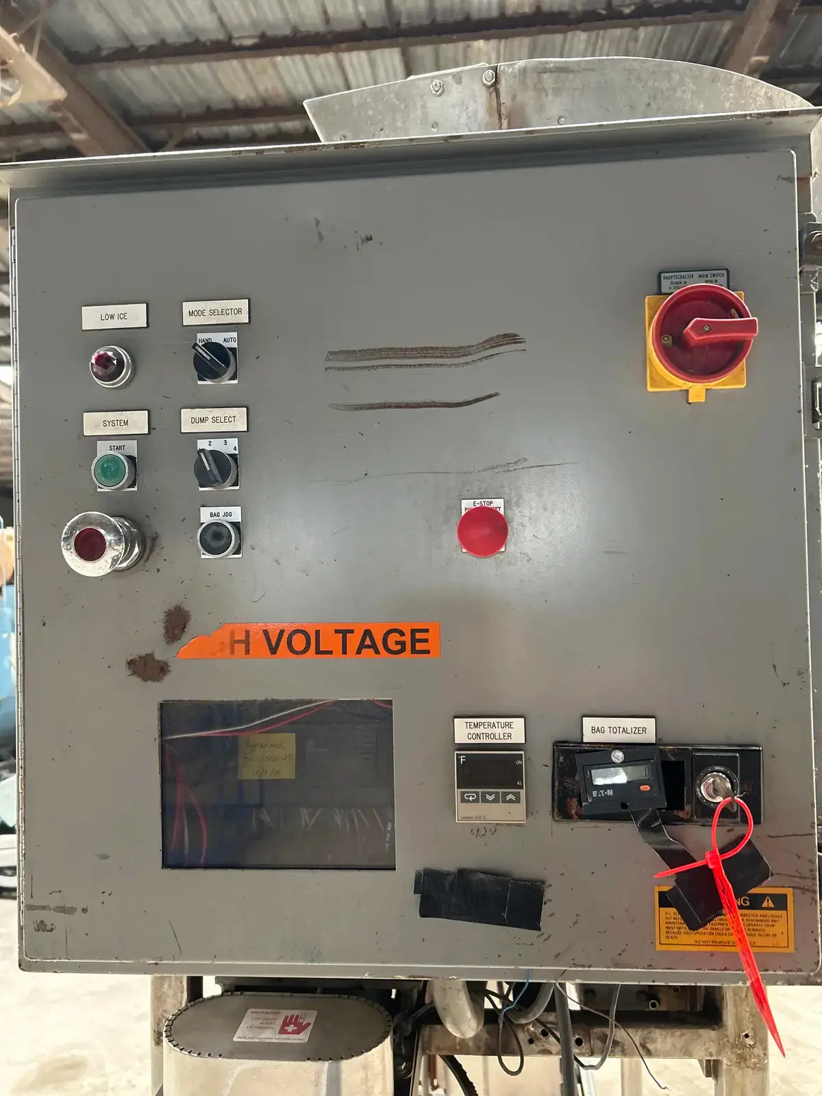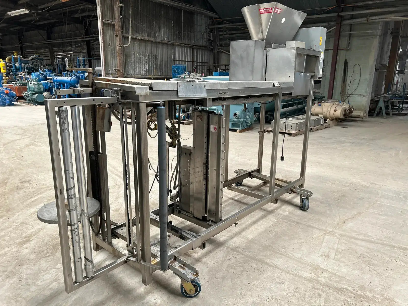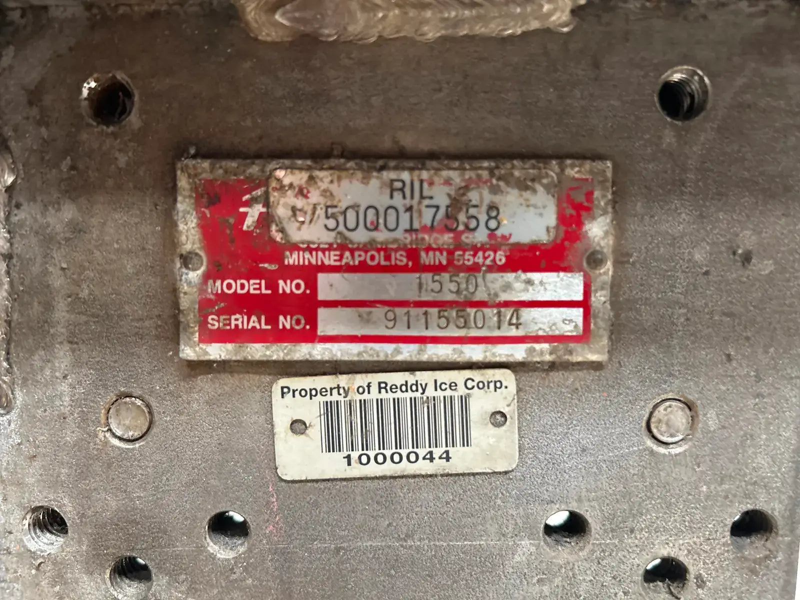 Sistema automático de envasado, llenado y sellado de hielo en bolsas Hamer. Modelo: 1550. N.º de serie: 91155014. Llena y sella más de 40 bolsas de hielo por minuto. Capacidad de bolsas: bolsas de 15 a 50 lb.