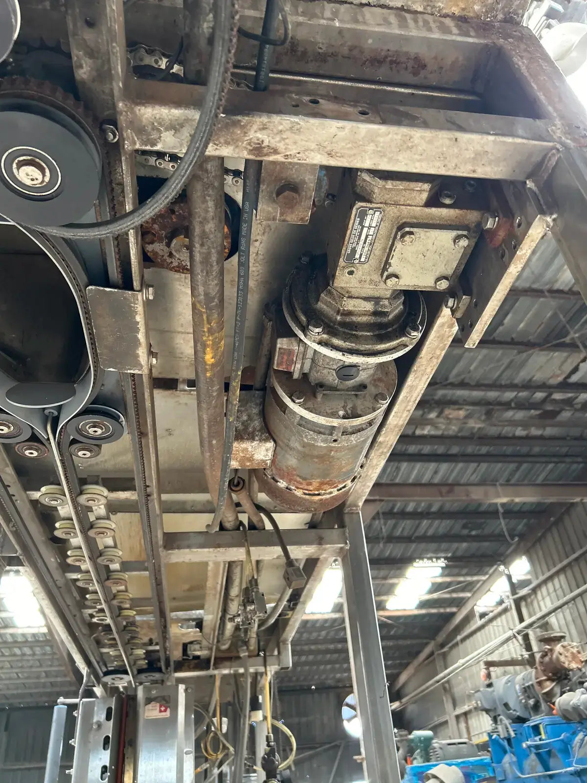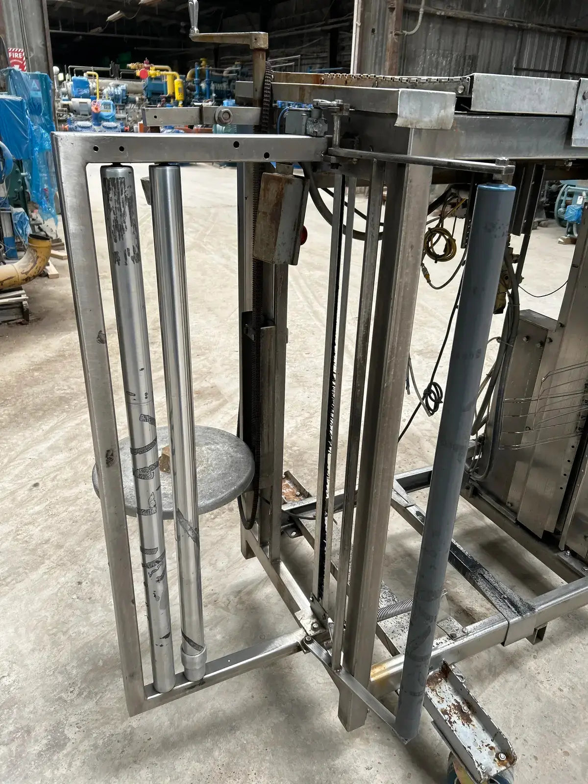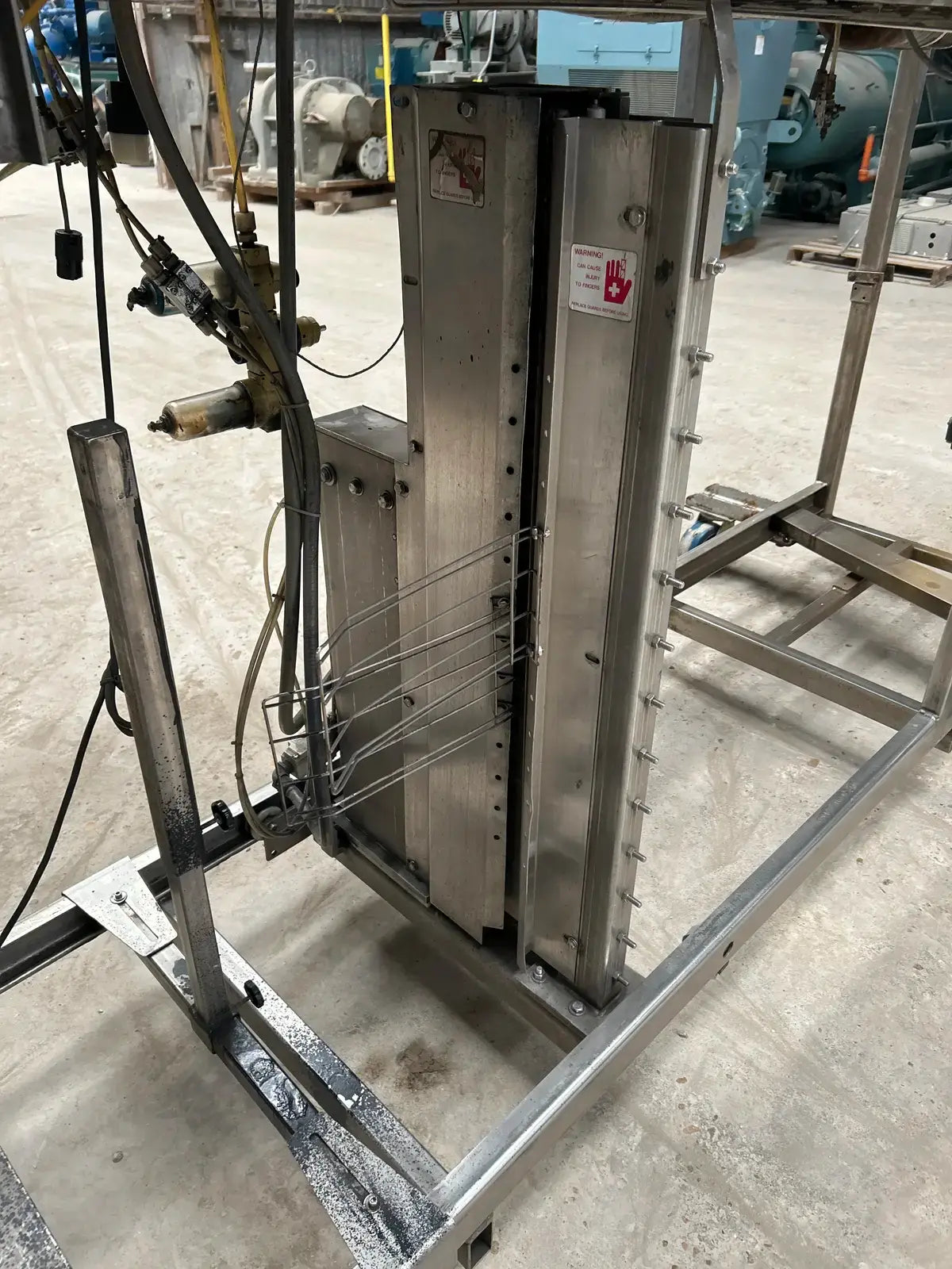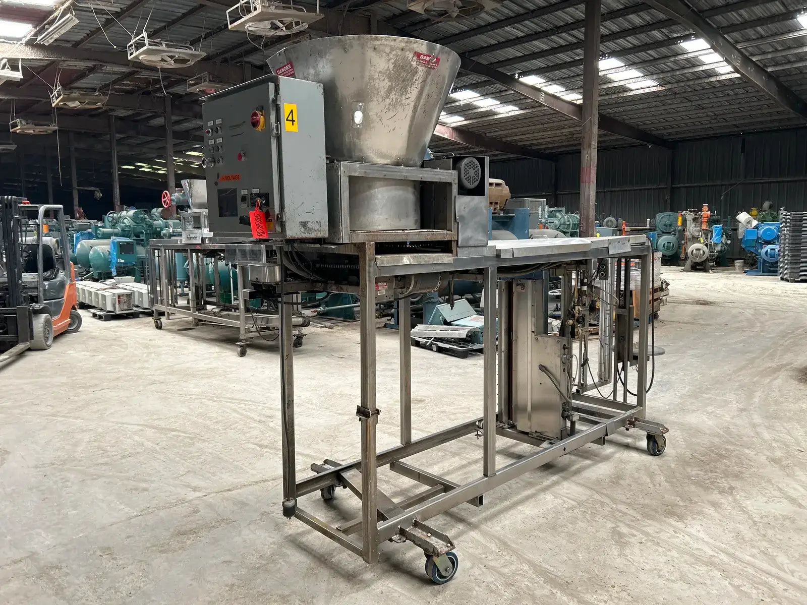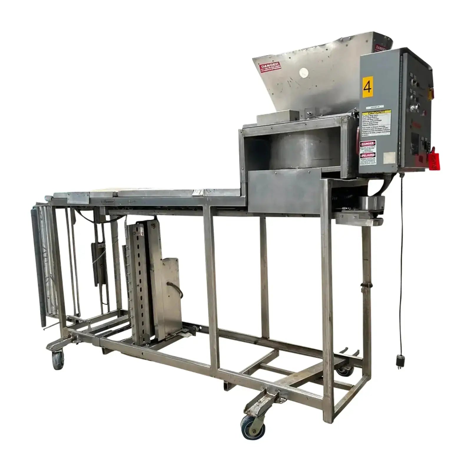 Sistema automático de envasado, llenado y sellado de hielo en bolsas Hamer. Modelo: 1550. N.º de serie: 91155014. Llena y sella más de 40 bolsas de hielo por minuto. Capacidad de bolsas: bolsas de 15 a 50 lb.