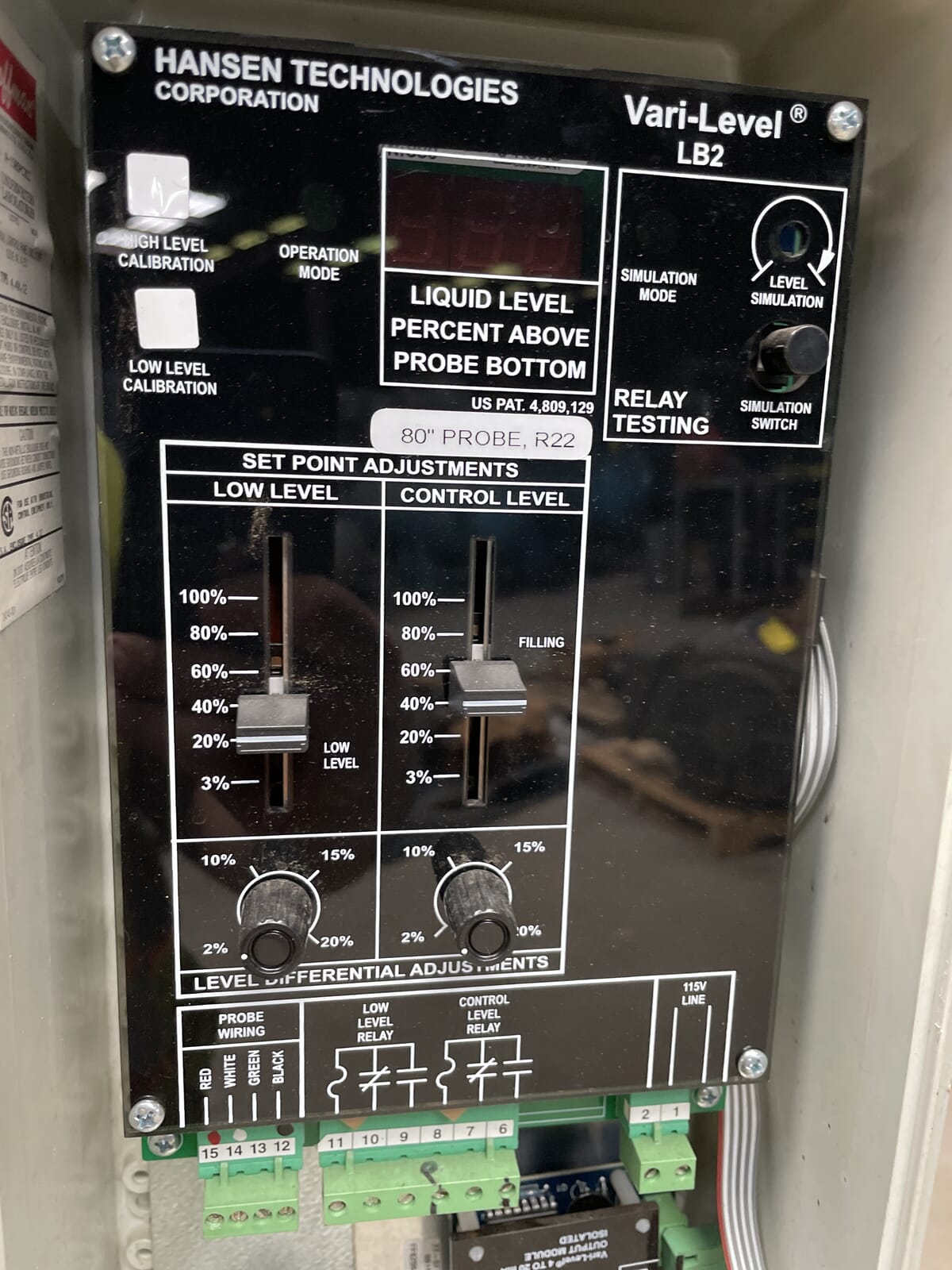 Unidad de control ajustable de nivel variable de líquido Hansen. Número de gato: LB2-115. Corte de energía: Estándar 115 V, 50/60 Hz. Para: R22.