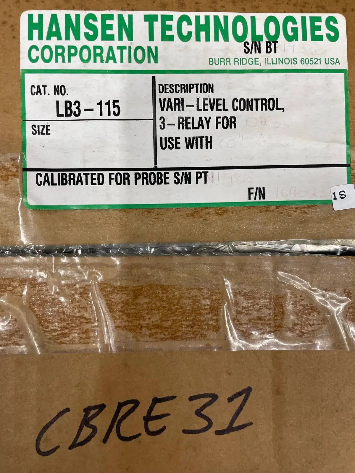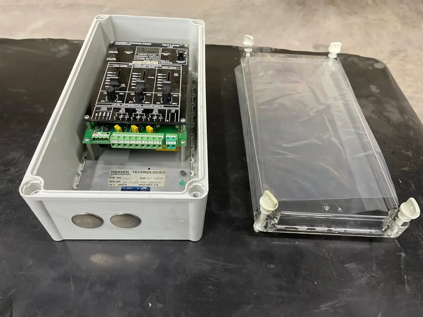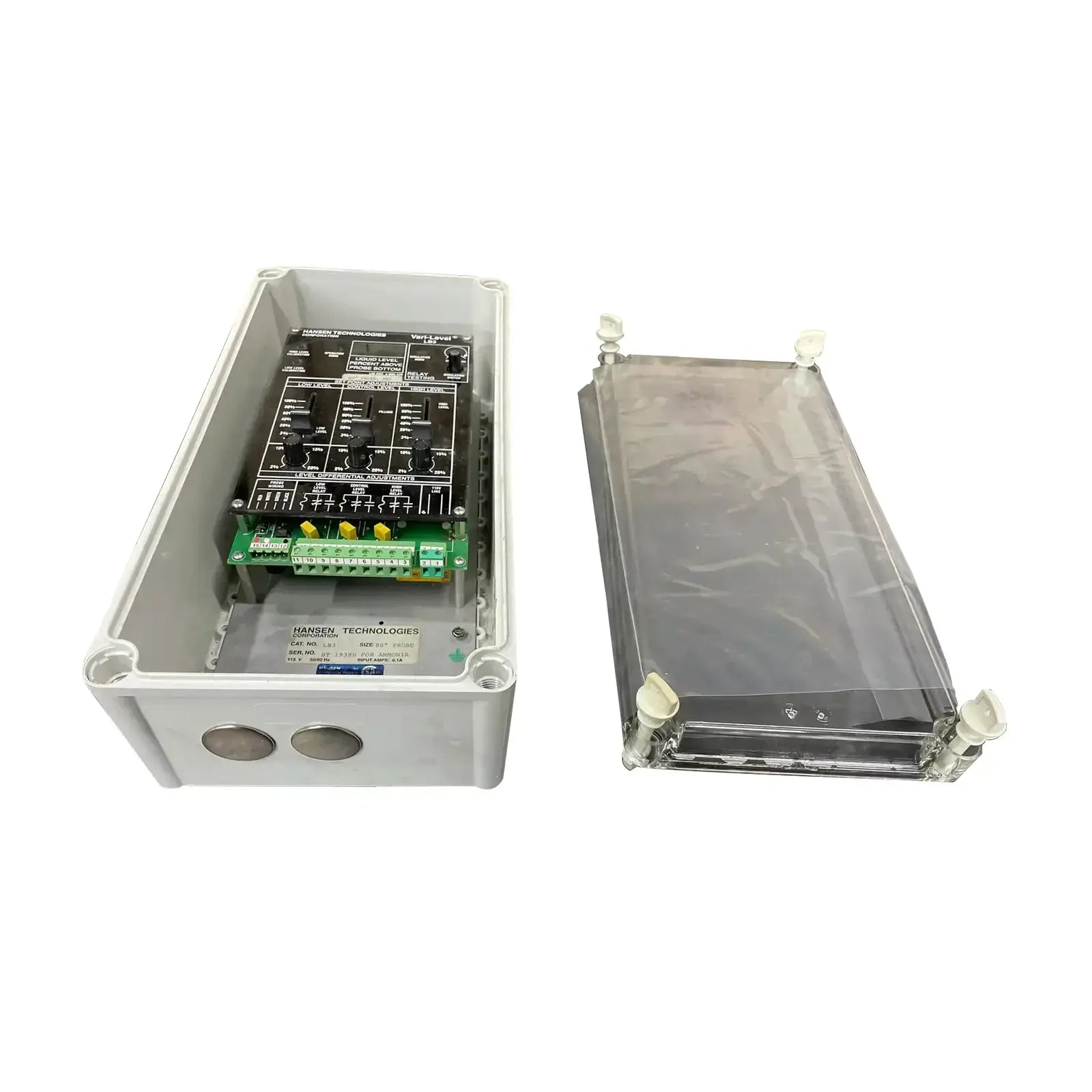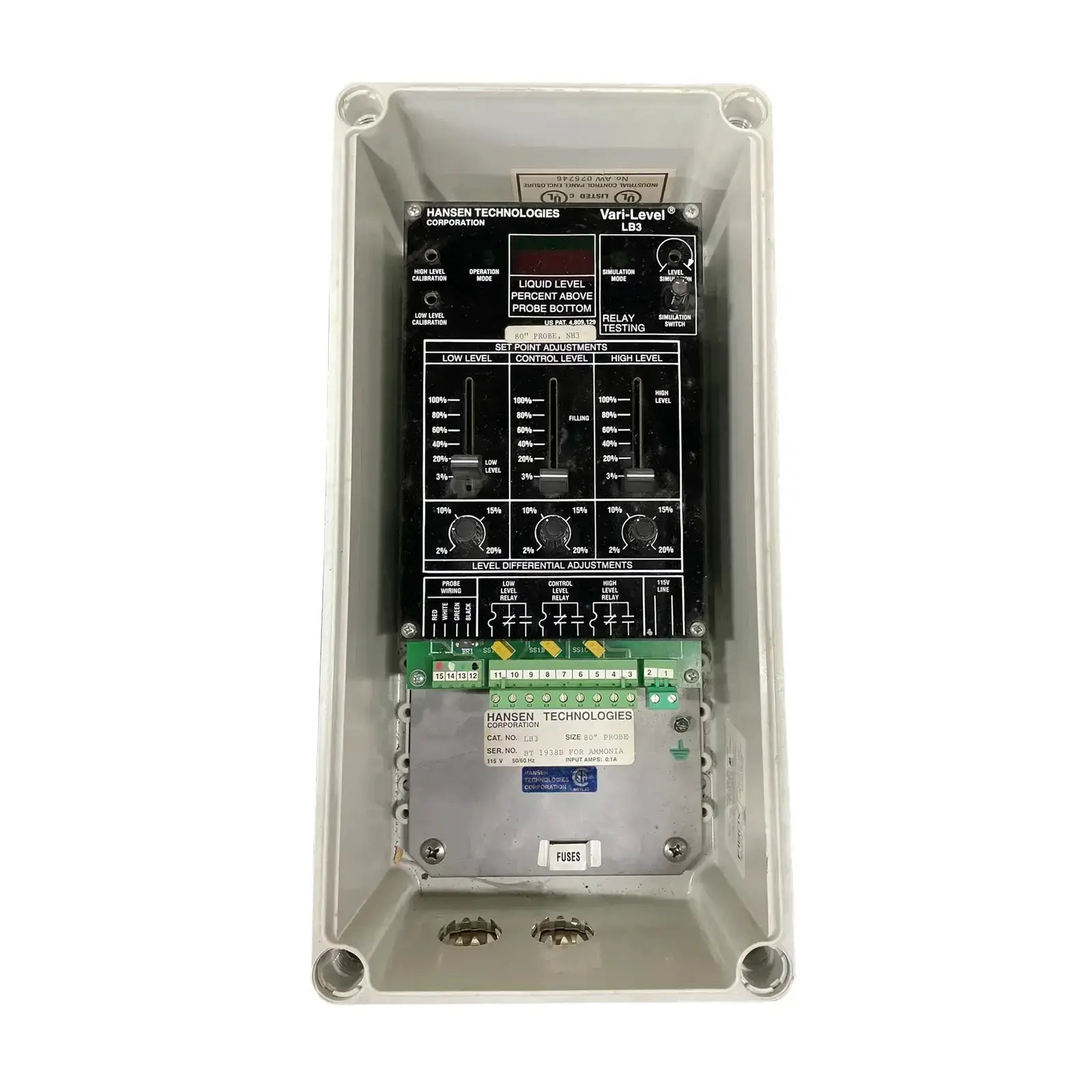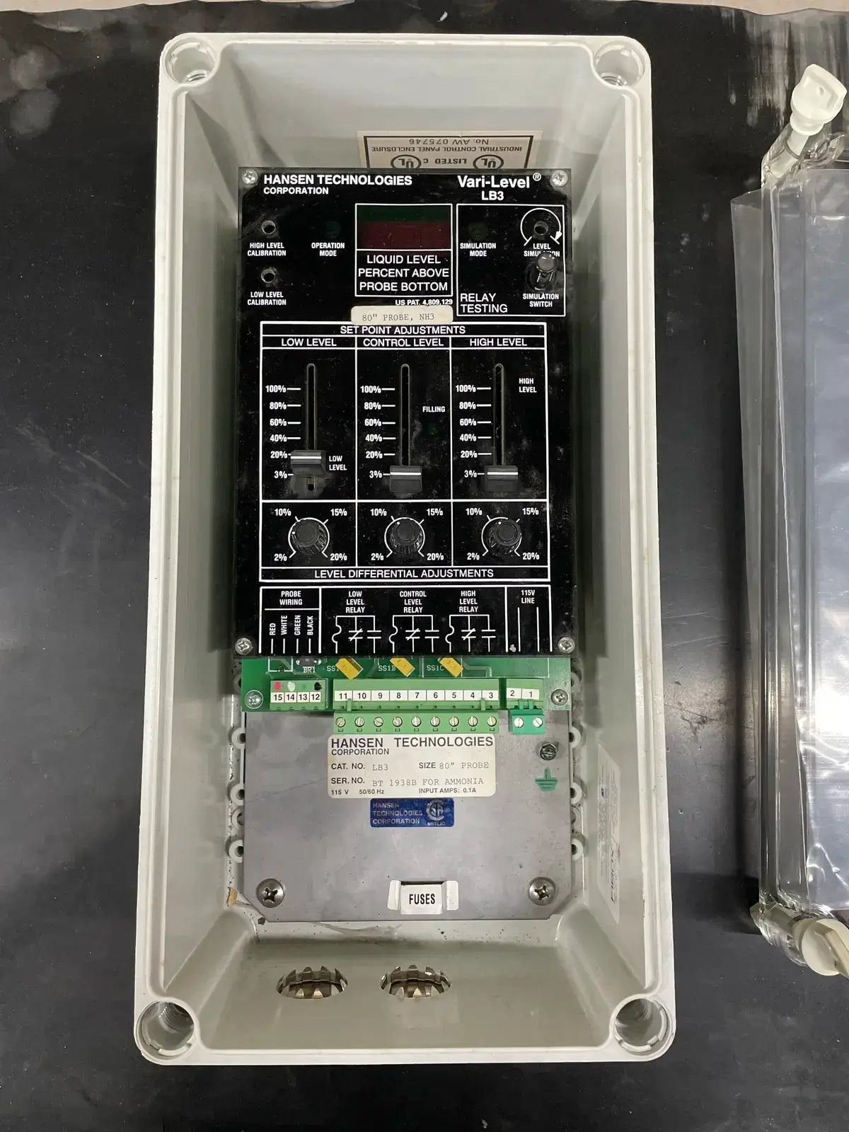 Control de nivel ajustable de nivel variable de amoníaco de Hansen Technologies. Número de gato: LB3-115. Tamaño: Sonda de 120". Fuente de alimentación: Estándar 115 V, 50/60 Hz, opcional 230 V, 50/60 Hz. Temperatura ambiente: +32 F a +120 F.