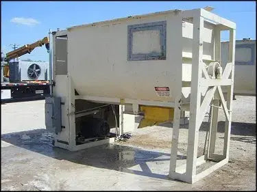 1992 HC Davis Sons Manufacturing Co., Inc. Mezcladora de cinta Super Duty 30 - 115 pies³. Modelo: SD30. Capacidad máxima 8000 libras. o 862 galones. Las características incluyen: agitador de paletas, transmisión por cadena de doble reducción, transmisión completa por correa en V, base del motor y cubierta con sección con bisagras y rejilla debajo. Rpm máximas: 24. Siemens 40 hp, motor, 1765 rpm, 230/460 V, 97,4/48,7 amperios, 60 Hz, trifásico. Altura de carga: 5 pies 3 pulgadas. La salida inferior está a 32 pulgadas del suelo sin pedestal y a 65 pulgadas con pedestal. Dimensiones totales del tanque: 8 pies 4 pulgadas de largo x 4 pies 3 pulgadas de ancho x 4 pies 9 pulgadas de profundidad. Puerta de acceso: 2 pies 6 pulgadas de largo x 2 pies 3 ½ pulgadas de ancho. Entrada: (1) 10 pulgadas de largo x 10 pulgadas de ancho Salida: 1 pie 4 pulgadas de largo x 1 pie 2 pulgadas de ancho. Dimensiones totales: 11 pies 4 pulgadas de largo x 5 pies 10 pulgadas de ancho x 7 pies 2 pulgadas de alto (ACN416) (H16).