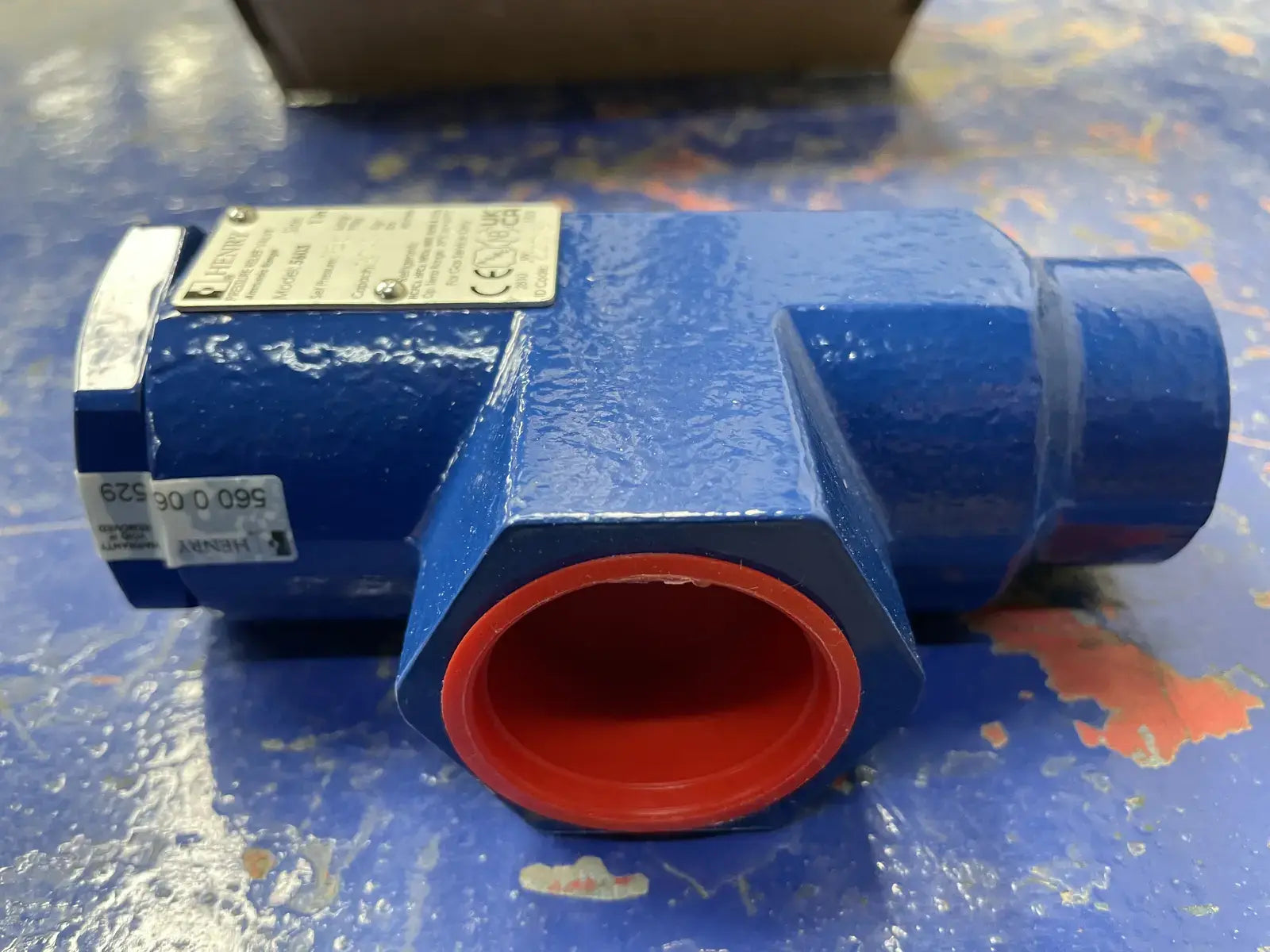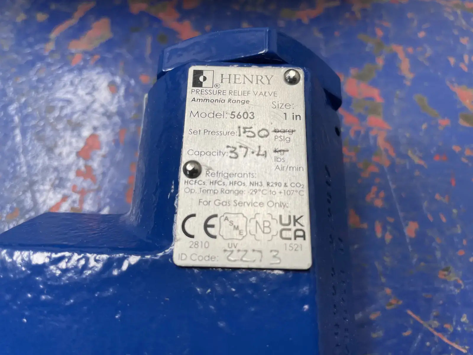 Henry Pressure Relief Valve. Model: 5603. Size: Inlet 1 in NPTF. Outlet: 1-1/4 in NPTF. Capacity: 37.4 lbs. Set Pressure: 150 PSIG.