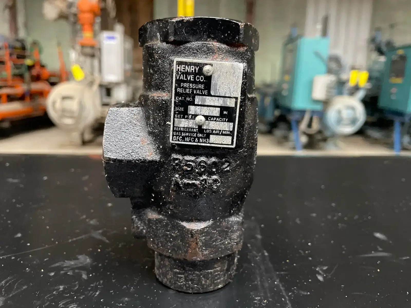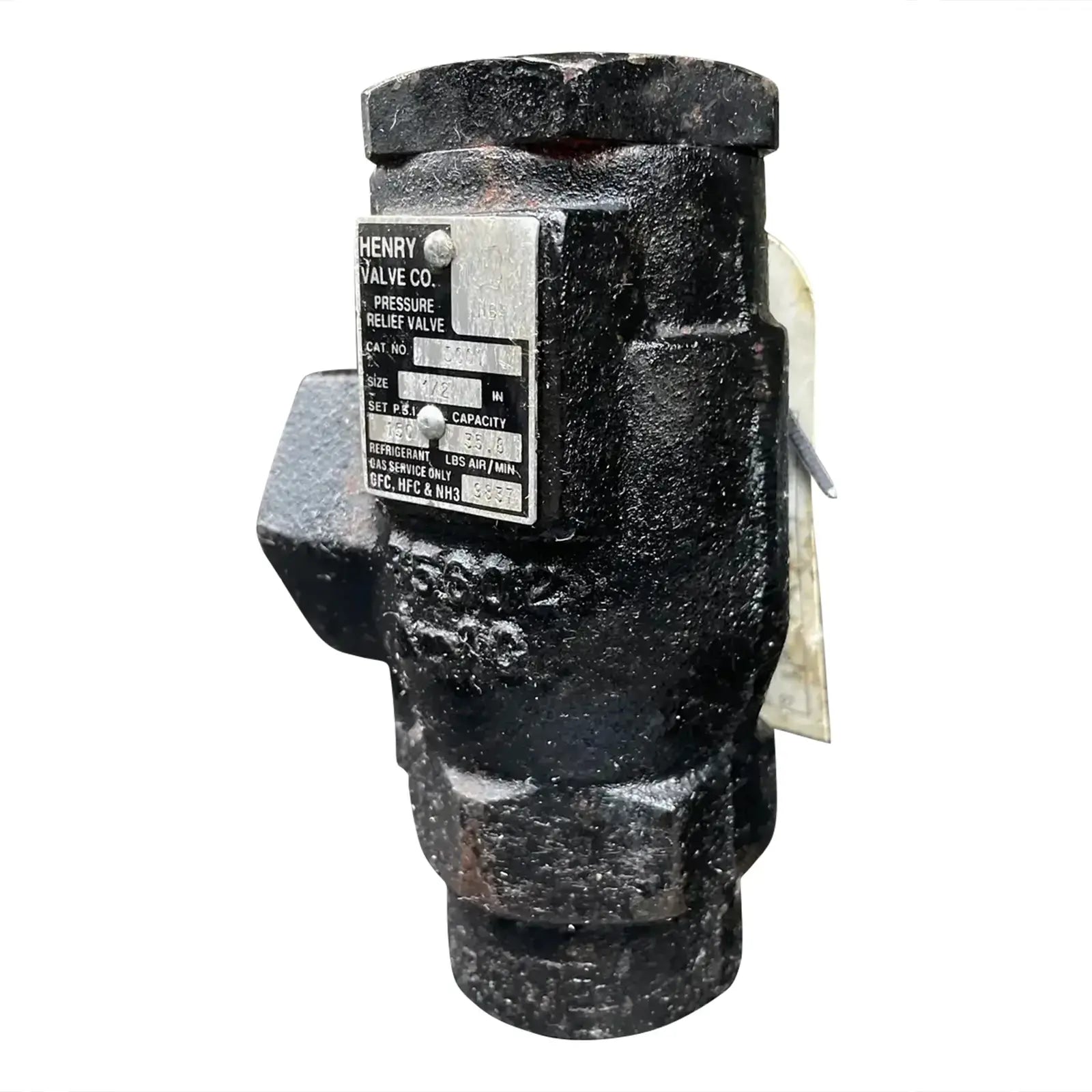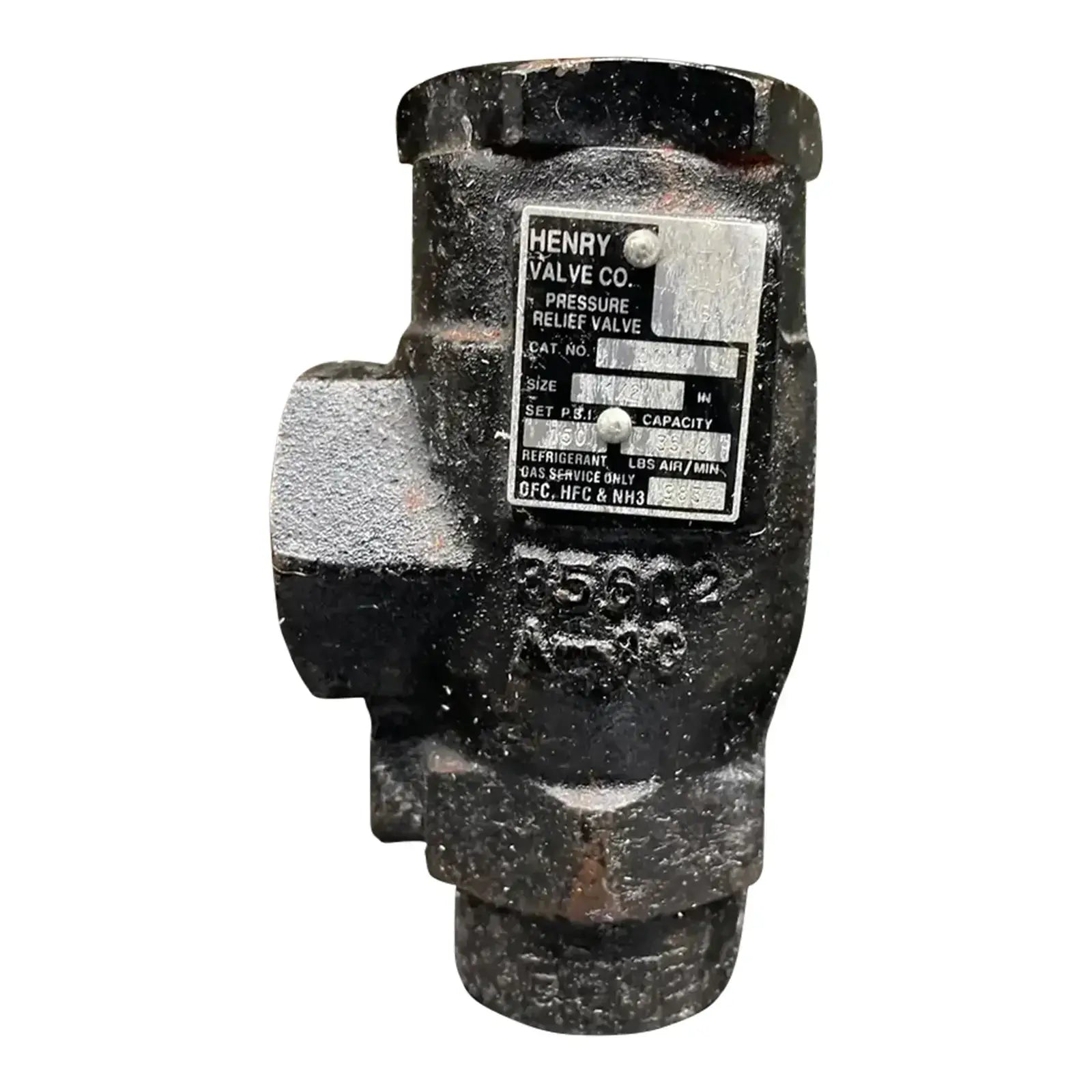 Válvula de alivio de presión de refrigerante Henry Technologies. N.º de catálogo: 5601. Capacidad de PSI establecida: 250 PSI, 57,7 LBS de aire/min. Tipo de ángulo. Tamaño: 1/2 FPT x 1 FPT.
