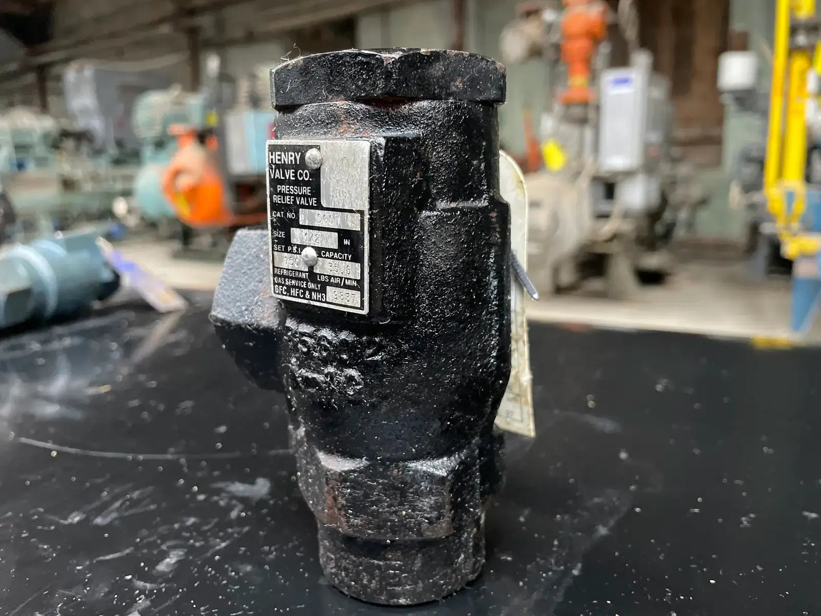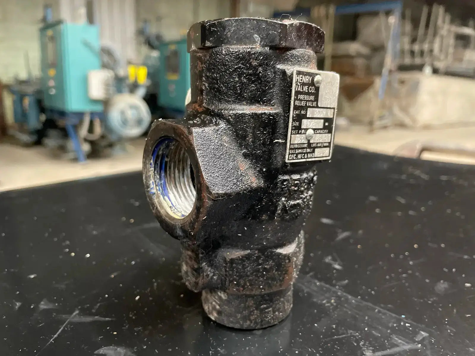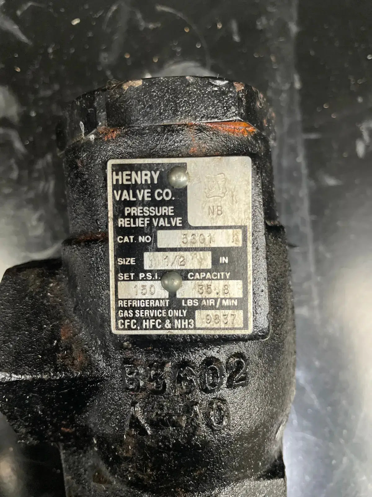 Válvula de alivio de presión de refrigerante Henry Technologies. N.º de catálogo: 5601. Capacidad de PSI establecida: 250 PSI, 57,7 LBS de aire/min. Tipo de ángulo. Tamaño: 1/2 FPT x 1 FPT.