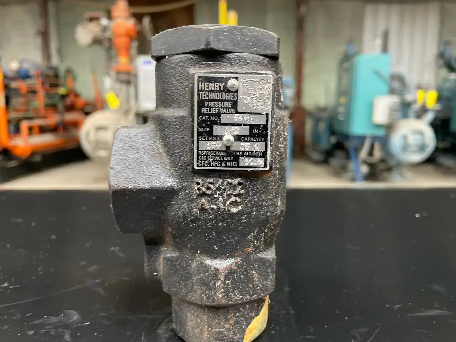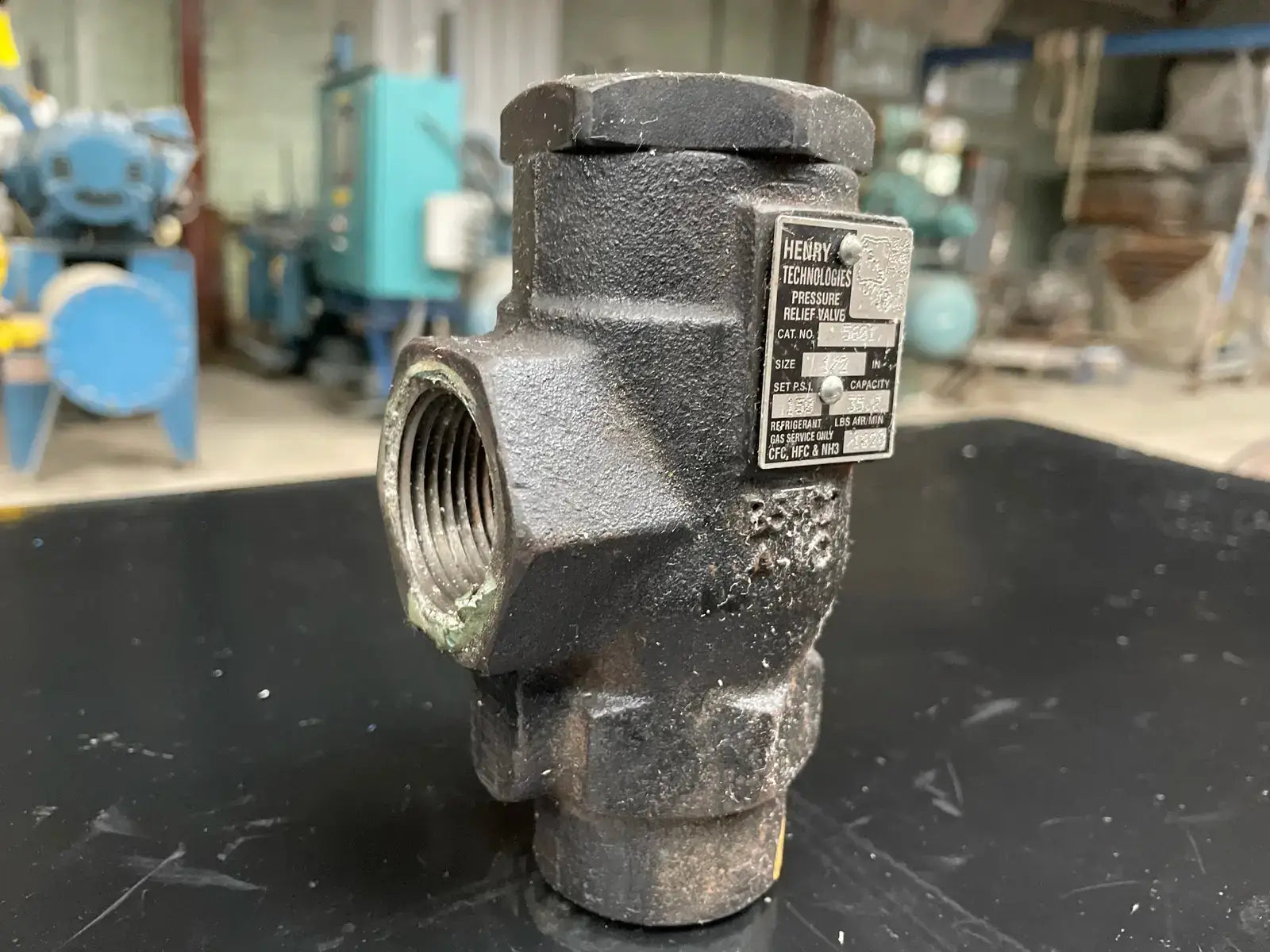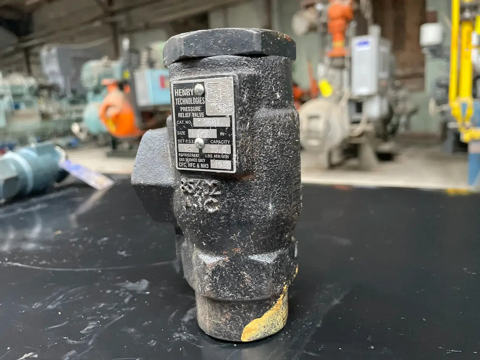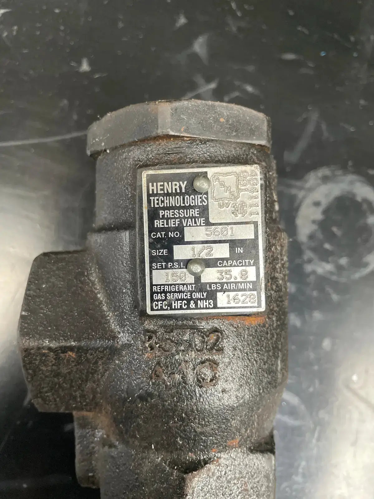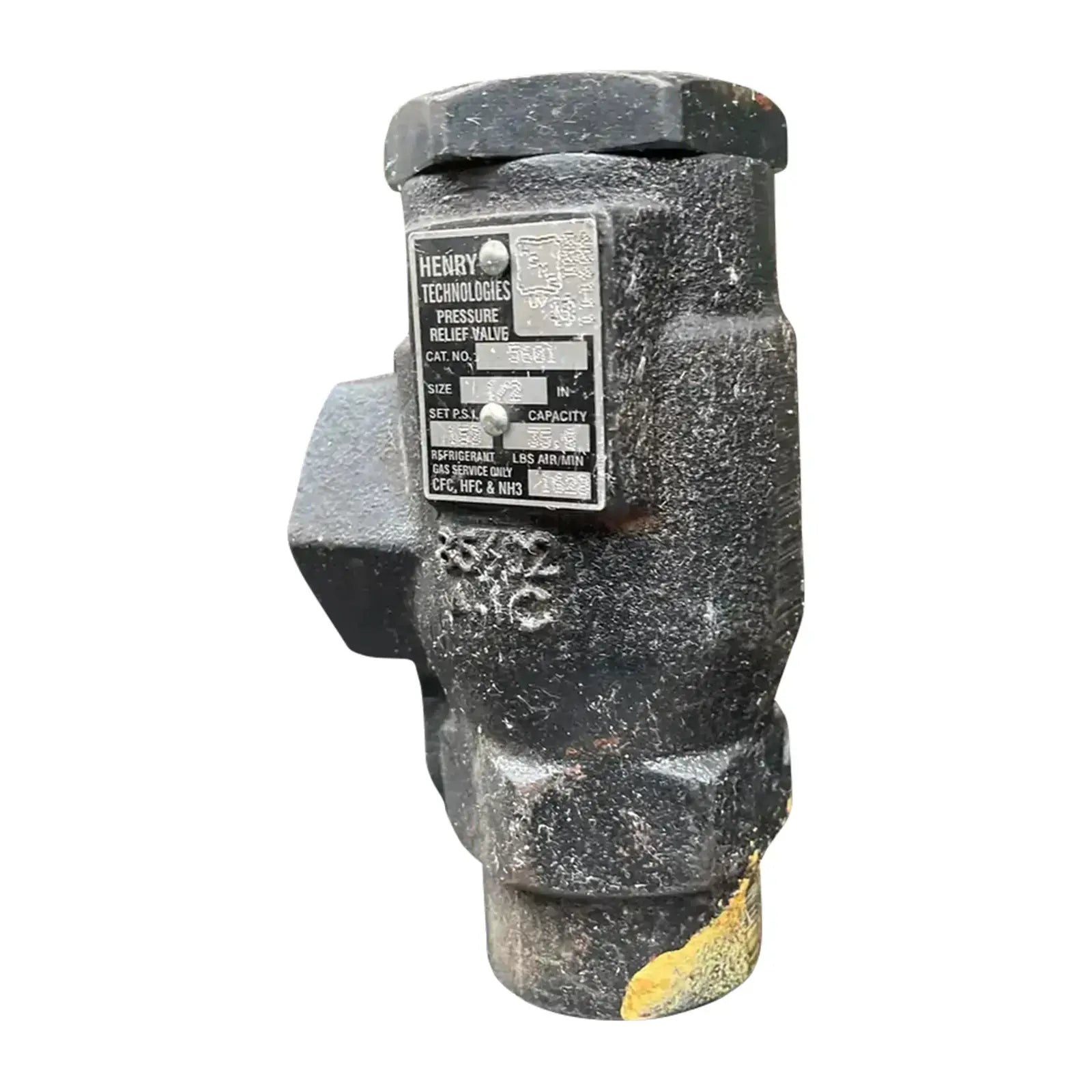 Válvula de alivio de presión de refrigerante Henry Technologies. Cat No: 5601. Capacidad PSI establecida: 150 PSI, 57,7 LBS aire/min. Tipo de ángulo. Tamaño: 1/2 FPT x 1 FPT.