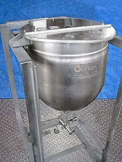 Hervidor Groen Elite 1996: 10 galones. Modelo EN-10. Número de serie: 04502-1. Nat'l Bd: 139615. Dwg: C310066-2. Construcción de acero inoxidable. MAWP a 300 °F: 45 psi. MDMT a 45 psi: -20 °F. Entradas: (1) 1/2 pulg. de diámetro. FNPT (chaqueta), (3) 1-1/2 pulg. de diámetro. Accesorios de línea S. Salidas: (1) 1/2 pulg. de diámetro. FNPT (vapor), (1) 1-1/2 pulg. de diámetro. puerto (descarga). Dimensiones totales: 35 pulgadas de largo x 32-1/2 pulgadas de ancho x 68 pulgadas de alto.