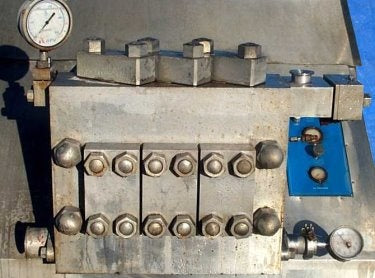 Homogeneizador APV. MS45-4TBS - 2000, S/N10921 2105. Émbolo de 2,425 pulg. Cilindro de válvula de bola de asiento cónico de 4000 psi. Capacidad mínima: 1700 gph; Capacidad máxima: 4500 gph. Bomba de alta presión, 100 hp. Tubo con iniciador Square D Company tamaño 4. Bloque S/N 4095-1 PT928762 BR 42-323530 SE92J0220. Dimensiones totales: 104 pulgadas de largo x 54 pulgadas de ancho x 68 pulgadas de alto.