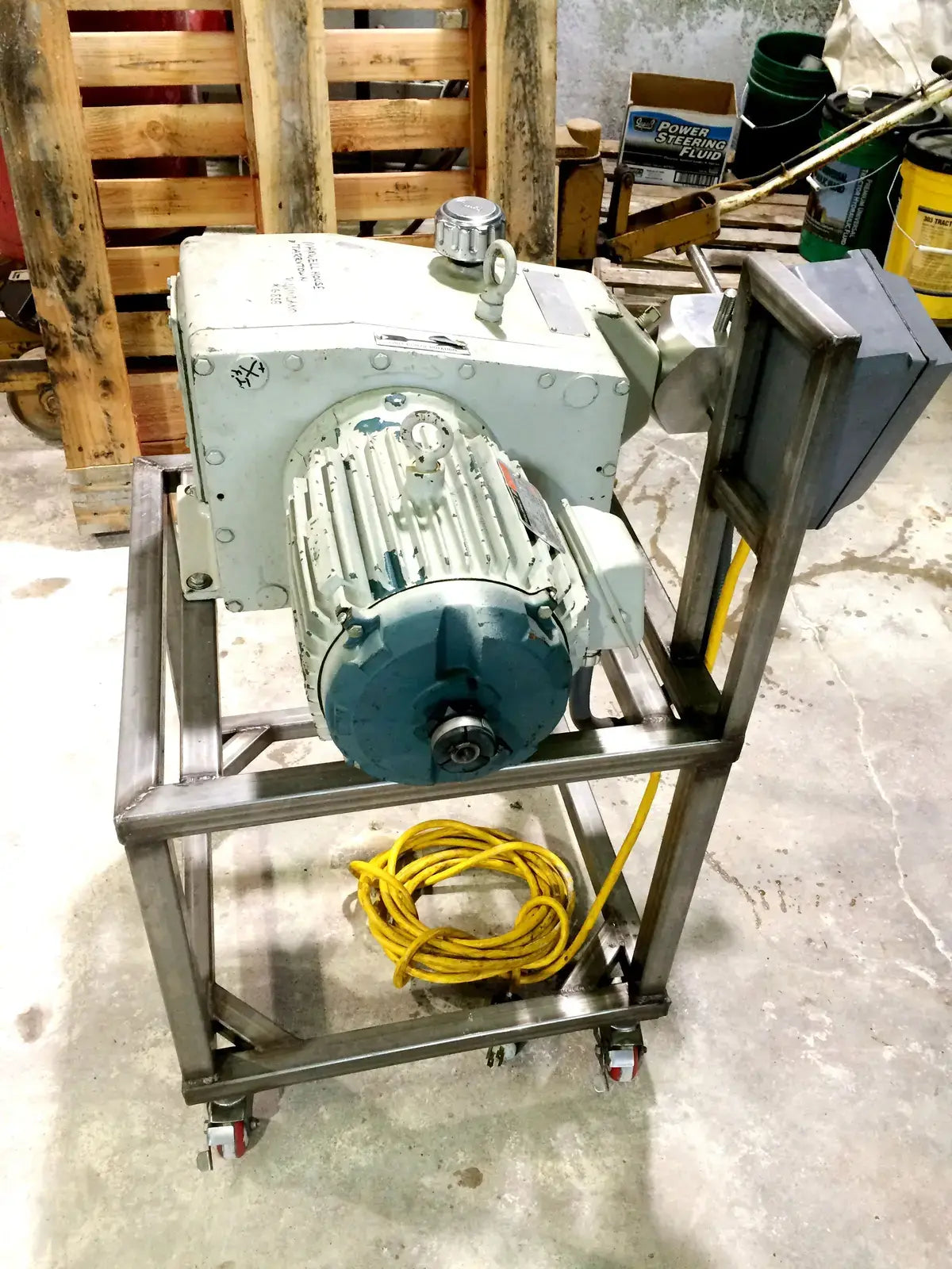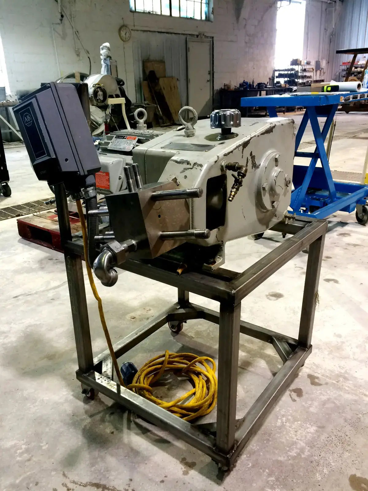 Homogeneizador de laboratorio APV Gaulin 15MR - Unidad de piezas (incompleta). Modelo: 15MR-8TBA. Número de serie: 18810648. Presión máxima: 8000 PSI. Motor Reliance: 3 HP, 208-230/460V, 60 Hz, trifásico. Incluye arranque y base rodante de acero inoxidable. Dimensiones totales: 36 x 32 x 42 (pulgadas).