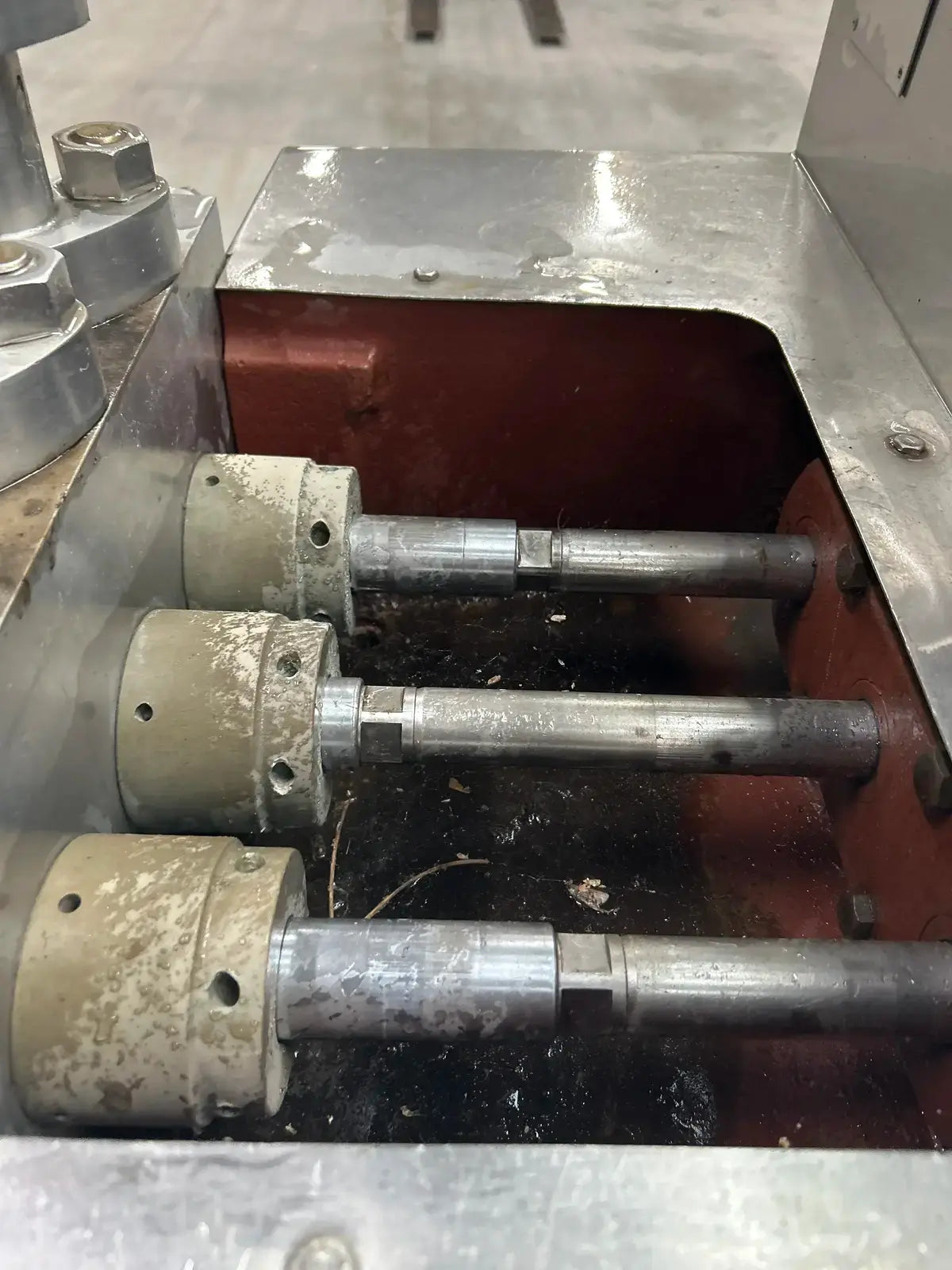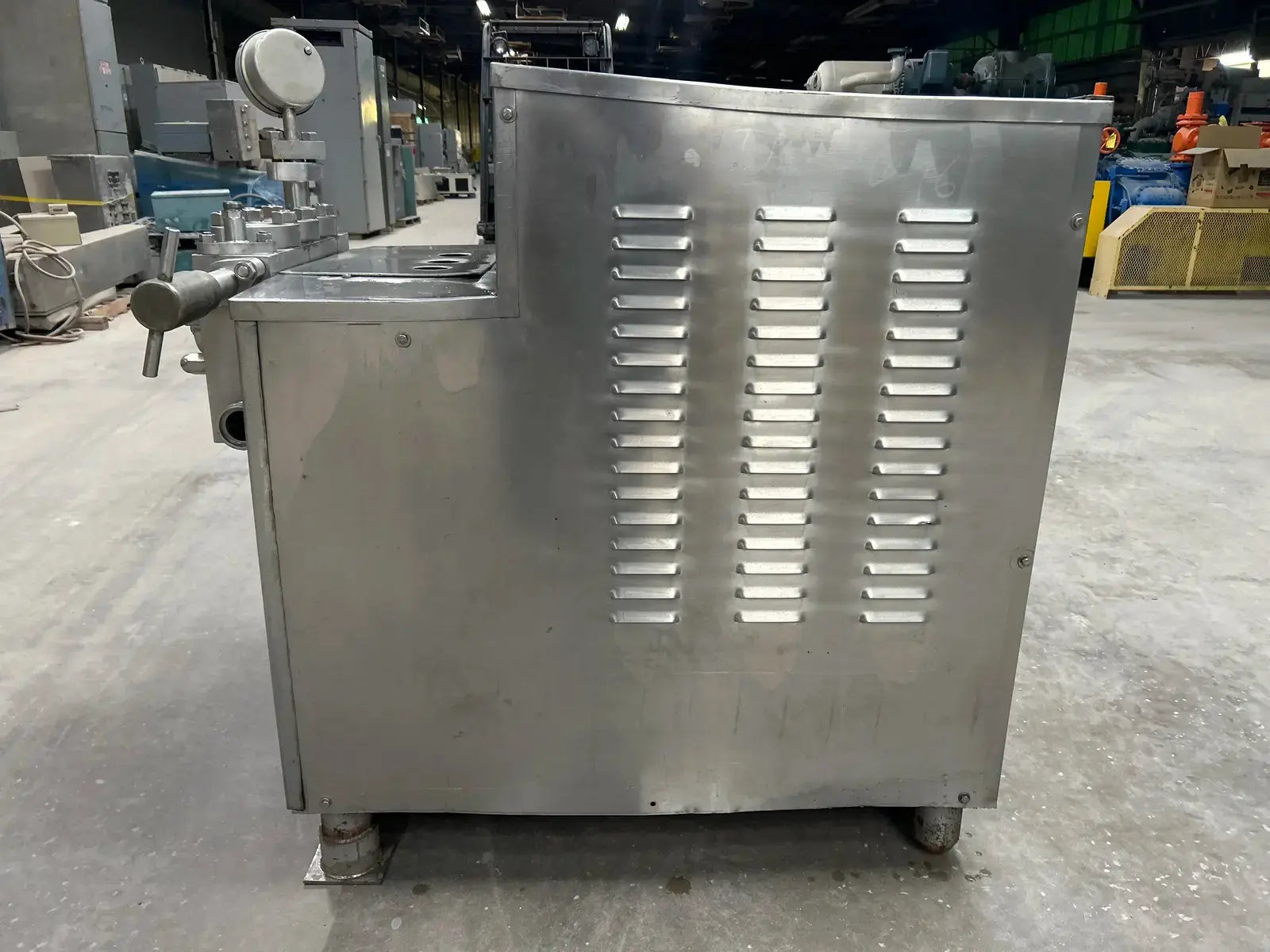 1994 Homogeneizador superhomo Cherry-Burrell Stellar Series. Modelo: Serie Estelar SS-2100 VBR. Capacidad máxima: 1000 gph. Conjunto de válvula manual de 2 etapas. Tamaño del émbolo: 1-1/4 pulg. de diámetro. Cilindros de válvula de asiento de asiento accionados por resorte. Presión máxima de funcionamiento: 3000 psi. Motor eléctrico Reliance, 40 hp, 1775 rpm, 230/460 V, 95/47,7 amperios, 60 Hz, trifásico, relación: 4,8, rpm finales: 370. Diámetro de la polea del engranaje: 24 pulg. Diámetro de la polea del motor: 5 pulg. Entradas : (1) 2 pulgadas de diámetro. Ajuste de línea I. Salidas: (1) 2 pulg. de diámetro. Accesorio S-Line. Dimensiones totales: 4 pies de largo x 2 pies 8 pulgadas de ancho x 4 pies de alto (ACN645).