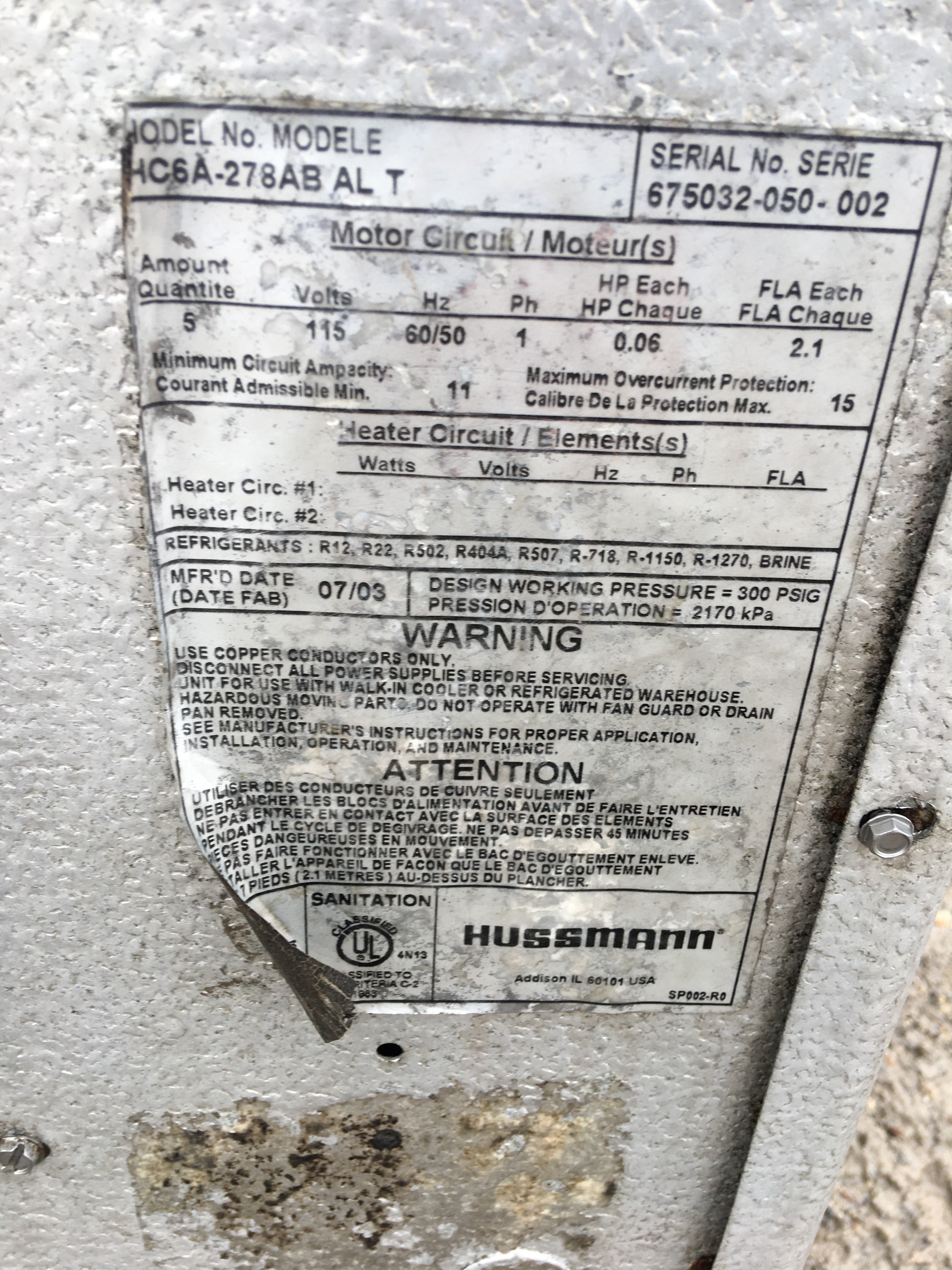 Serpentín de evaporador de freón Hussmann HC6A-278AB AL T - 3.475 TR, 5 ventiladores (temperatura media) Este evaporador utiliza serpentines de temperatura media con una capacidad húmeda de 2780 (BTUH / °F TD) con un tonelaje estimado de 3.475(TR) @15TD. Un flujo de aire de 4000 CFM. Baterías recirculadas alimentadas por el fondo con descongelación eléctrica.