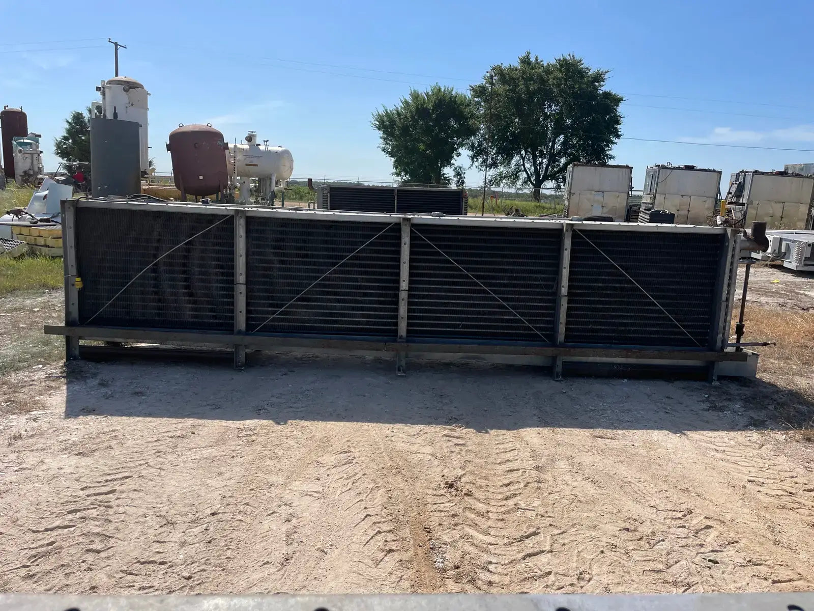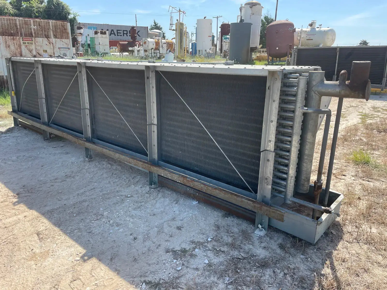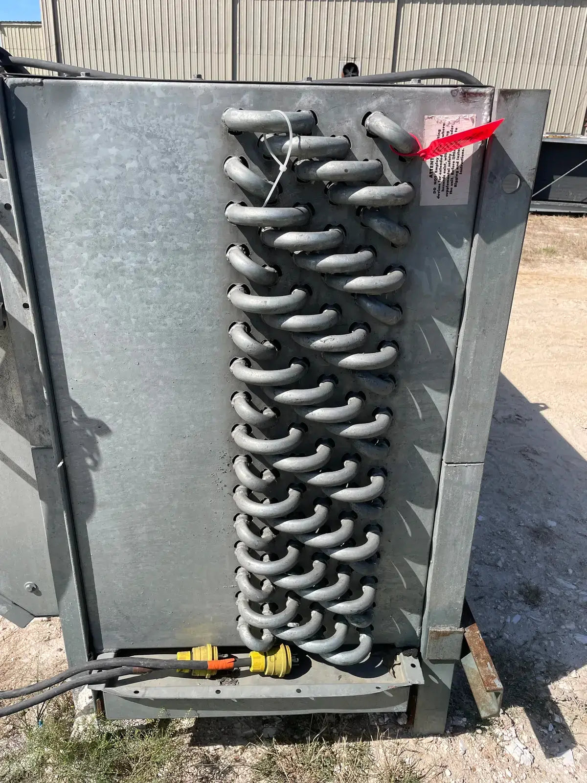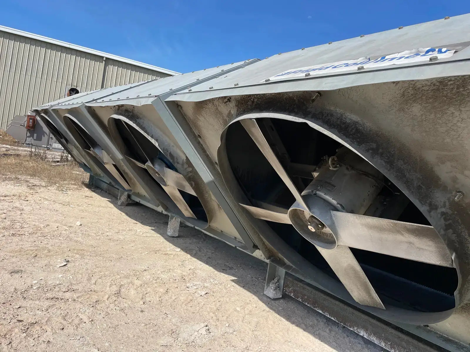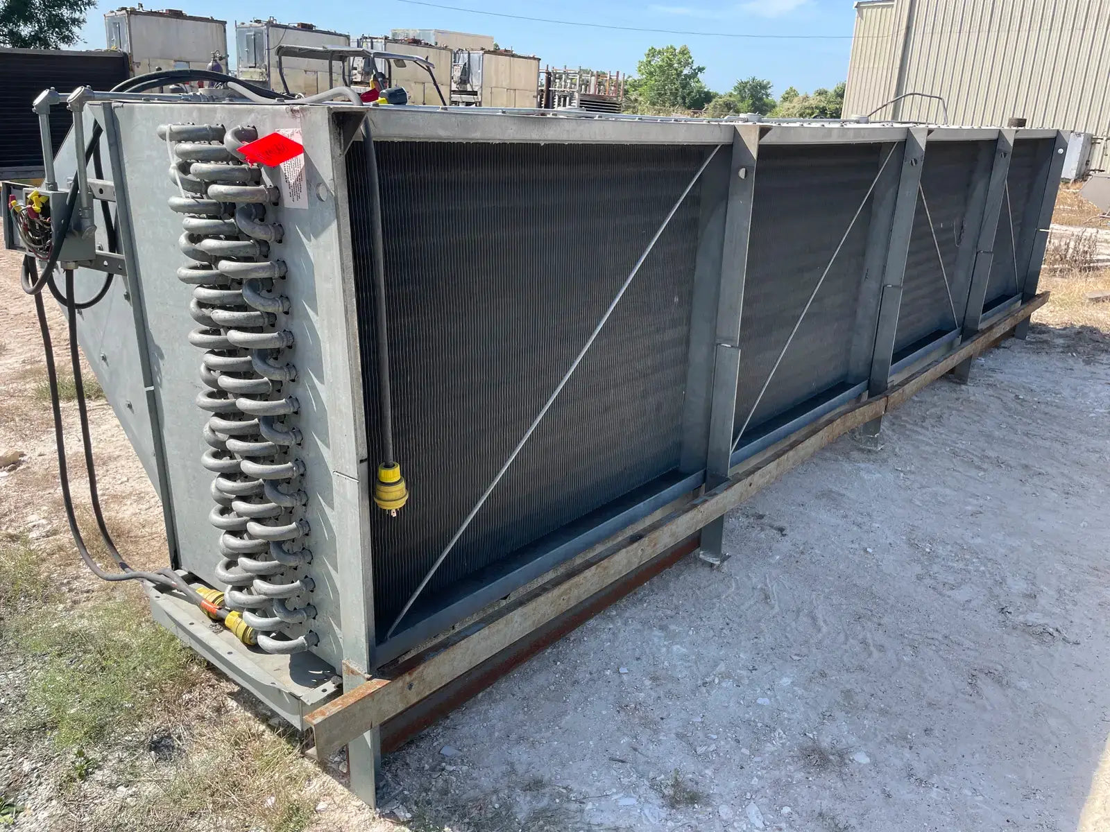 Serpentín evaporador de amoníaco de baja temperatura de la serie ICB de Imeco. Modelo: ICB-4C-606-3-5. Serie: 7488-2 LH4. Refrigerante anterior: R-717. Fecha de fabricación: 12-7-1995. Presión máxima: 250 PSIG. (4) Ventiladores: HP:3, Diámetro del ventilador (pulg.): 30, RPM: 1750, Nivel de sonido (DBA): 90.