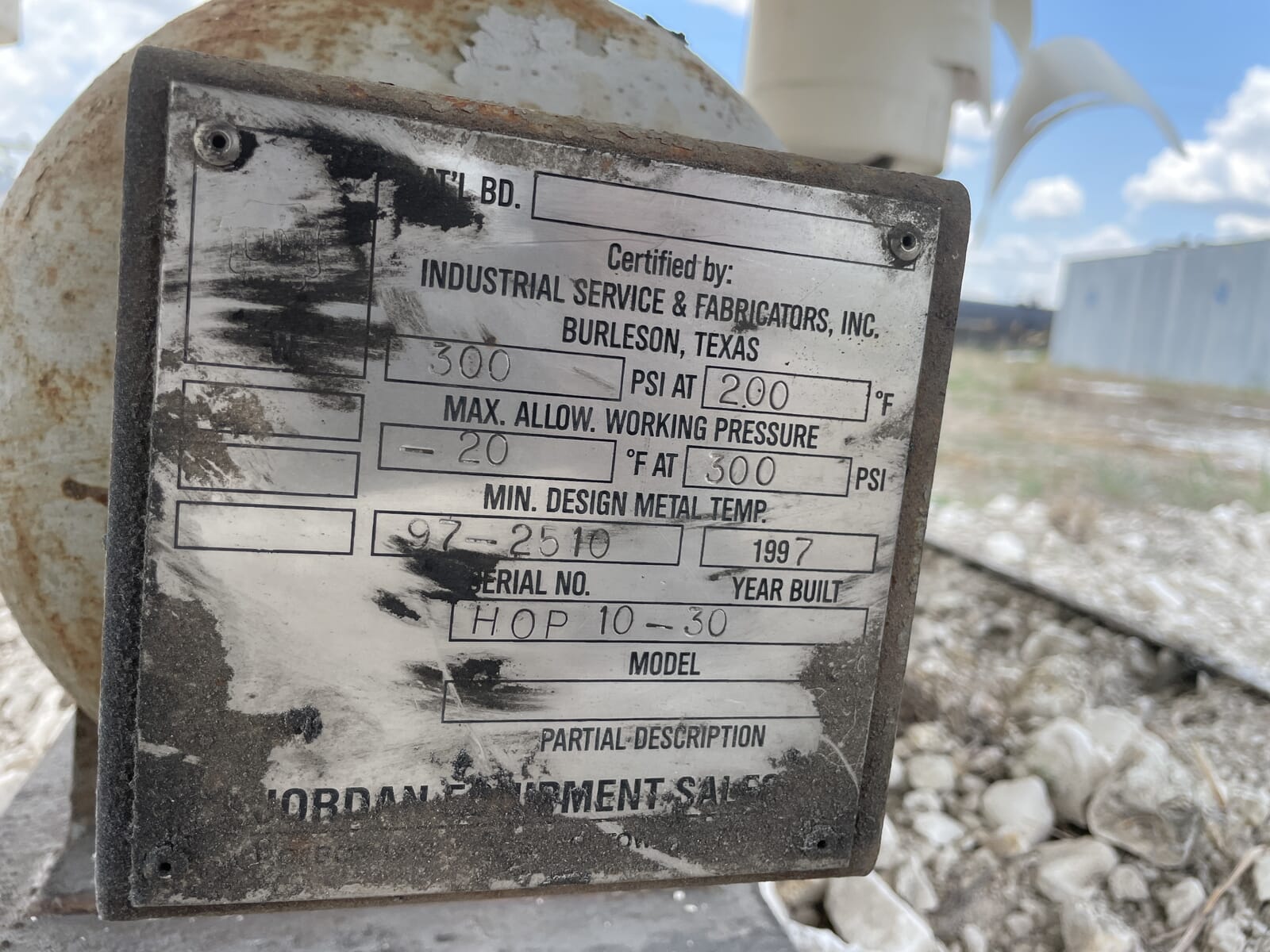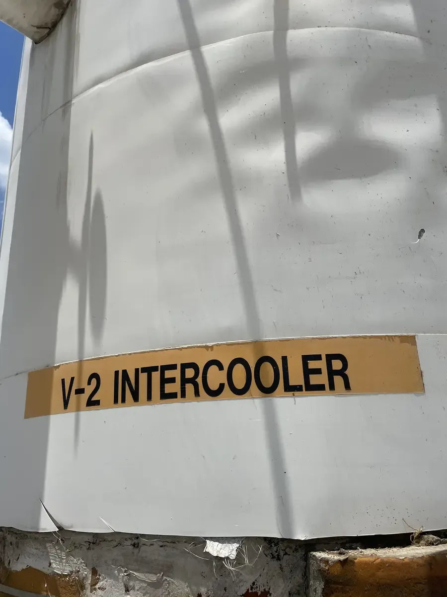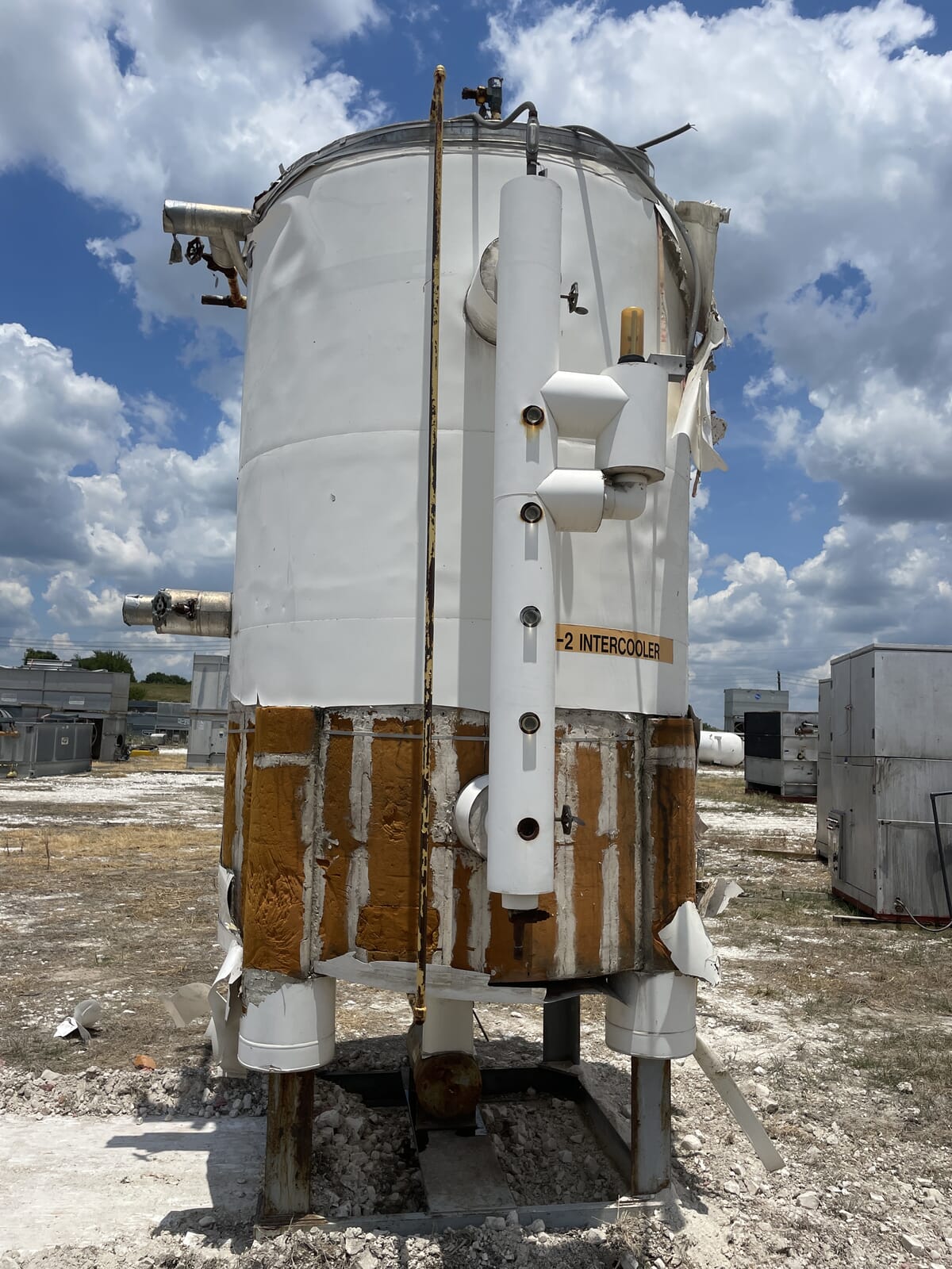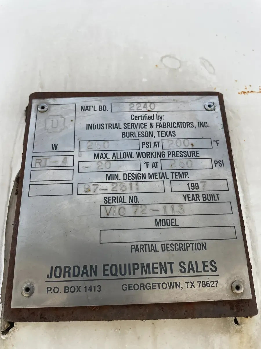 Industrial Service & Fabricators Inc. VIC 72-113 Intercooler vertical de amoníaco (72 x 113 pulgadas, 2000 galones) Número de serie: 97-2511. Número de la Junta Nacional del tanque: 2240. Capacidad estimada del tanque (galones): 2000. MAWP del tanque (PSI a temperatura): 250 PSI a 200 F. MAWT del tanque (PSI a temperatura): -20 a 250 PSIG. El refrigerante anterior era amoniaco (R717 | NH3). Fabricado en 1997.5500 libras.