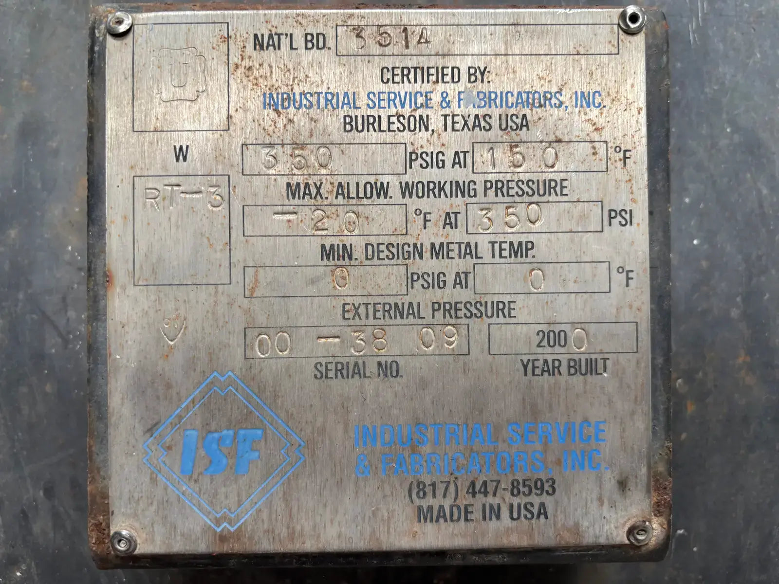 Industrial Service & Fabricators Inc Horizontal Refrigeration Receiver. National Board: 3514. Serial No: 00-3809. Year Built: 2000. MAWP: 350 PSIG @ 150 F. MDMT: -20 F @ 350 PSI.