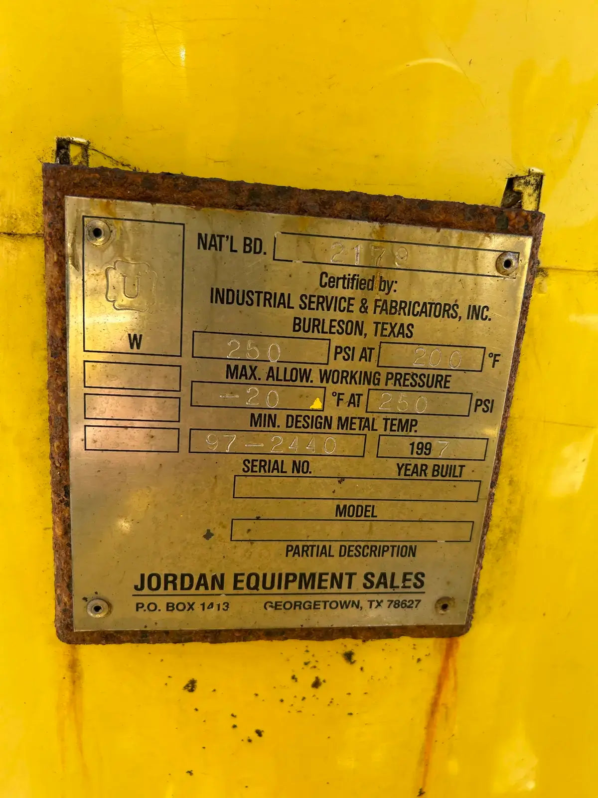 Industrial Service & Fabricators Inc. Tambor vertical de amoníaco. National Board: 2179. Número de serie del fabricante: 97-2440. Año de construcción: 1997. Dimensiones del recipiente: 91 cm de diámetro exterior x 94 cm de largo. Capacidad estimada: 1217 litros.