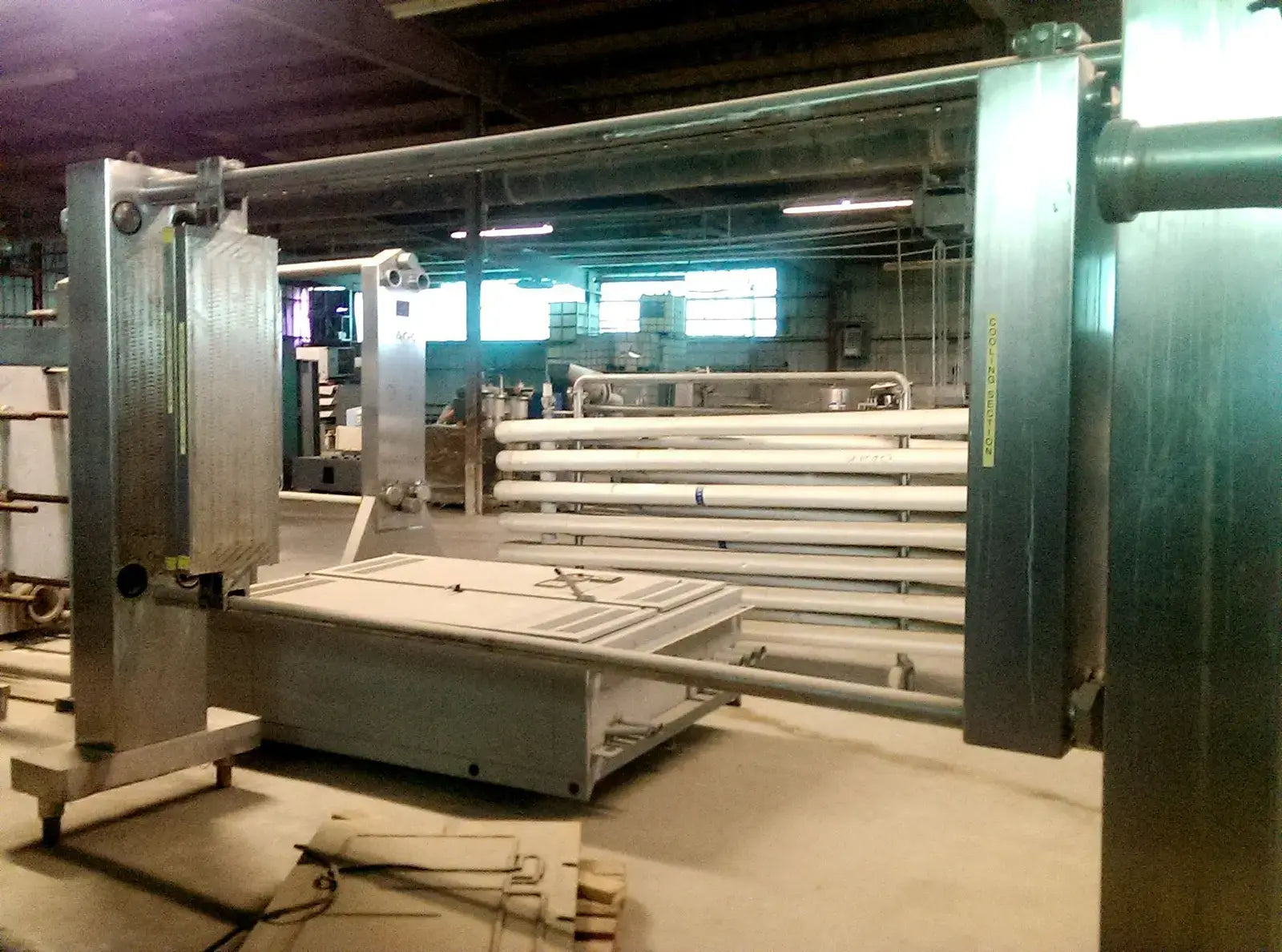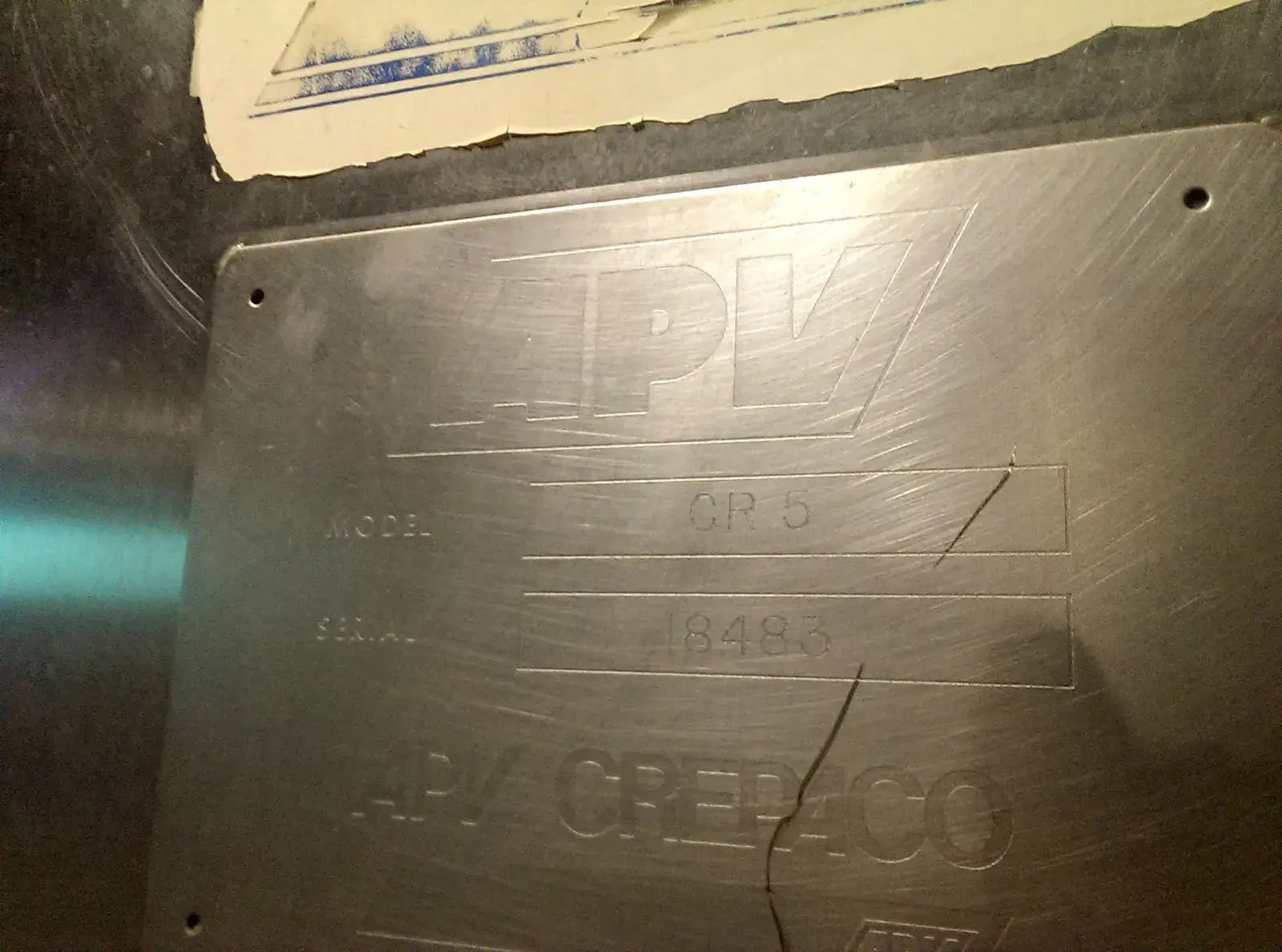 Intercambiador de calor de placas y marcos APV Crepaco HTST. Modelo: CR5. Serie: 18483. Utilizado anteriormente en una aplicación de 4000 GPH con sección de calefacción, sección de regeneración y sección de enfriamiento. Incluye dos placas divisorias y aproximadamente 250 placas de transferencia de calor. Puertos: 4 pulgadas Dimensiones totales: 118 pulgadas de largo x 37 pulgadas de ancho x 101 pulgadas de alto (alto)