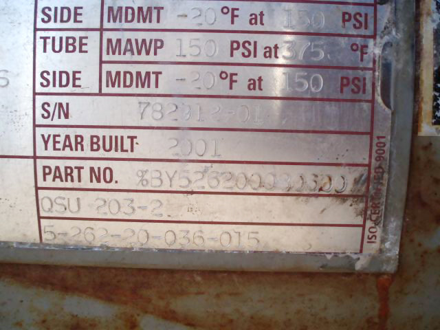 2001 Intercambiador de calor de carcasa y tubos Bell & Gossett. Número de serie: 782912-01. Número de pieza: BY526200080600. Construcción de acero al carbono. (330) 5/8 pulg. de diámetro. x tubos múltiples de 3 pies y 6 pulgadas de largo. Superficie de transferencia de calor: aprox. 185 pies cuadrados. Volumen de la bobina: 18 gal. MAWP del lado de la carcasa: 150 psi a 375 °F, MDMT: -20 °F a 150 psi. MAWP del lado del tubo: 150 psi a 375 °F, MDMT: -20 °F a 150 psi. Entradas: (1) 13 pulg. de diámetro. puerto bridado (producto), (1) 10 pulg. de diámetro. puerto embridado (medios). Salidas: (1) 13 pulg. de diámetro. puerto bridado (producto), (1) 4 pulg. de diámetro. puerto embridado (medios). Dimensiones totales: 5 pies 11 pulgadas de largo x 4 pies de ancho x 2 pies de alto.