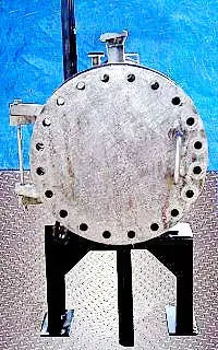 Intercambiador de calor de carcasa y tubos de Bingley Stainless Steel Works. Modelo: F0362.5. S/N: 209. Especificaciones del material: SA240 304 SS. Número de pasadas: 6. Número de tubos: 48. Dimensiones del tubo: 1 pulg. de diámetro. x 9 pies L. Área de superficie de transferencia de calor: 100 pies cuadrados. Volumen del tubo: 17,6 galones. MAWP del lado de la carcasa: 80 psi a 150 °F. MAWP del lado del tubo: 50 psi a 150 °F. Espesor de la carcasa: 3/16 pulg. Kunkle Válvula de alivio de presión de 2 pulg., presión de ajuste: 85 psi. Entradas: (1) 2 pulg. de diámetro. NPT (macho, chaqueta), (1) 2 pulg. de diámetro. puerto con una brida de 6 pulg. Salidas: (1) 2 pulg. de diámetro. tubo (chaqueta), (1) 2 pulg. de diámetro. puerto con una brida de 6 pulg. Dimensiones totales: 10 pies 9-1/2 pulgadas de largo x 2 pies 2 pulgadas de ancho x 5 pies 4 pulgadas de alto (ACN585).