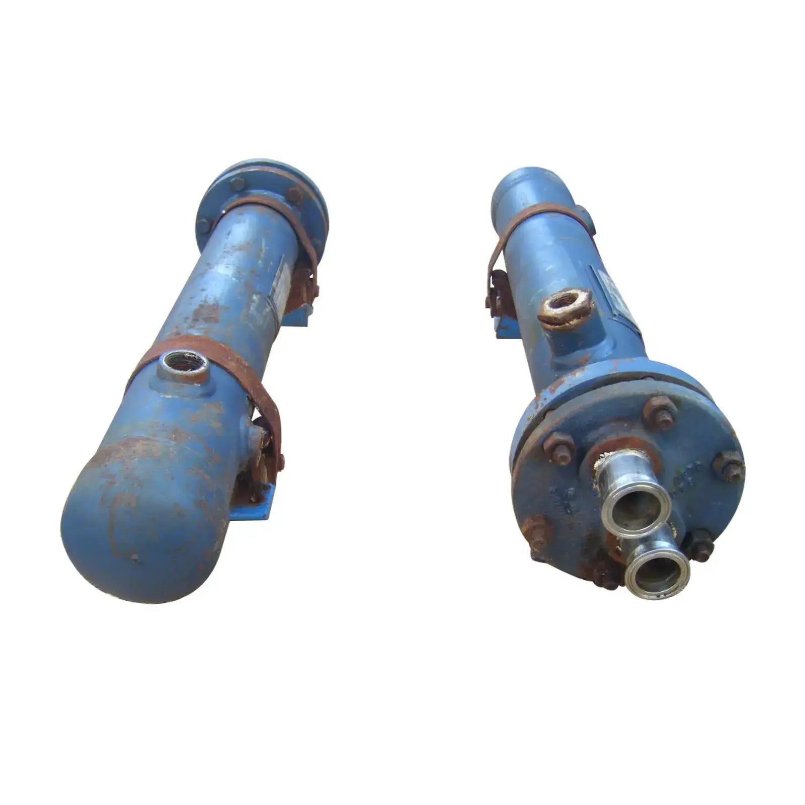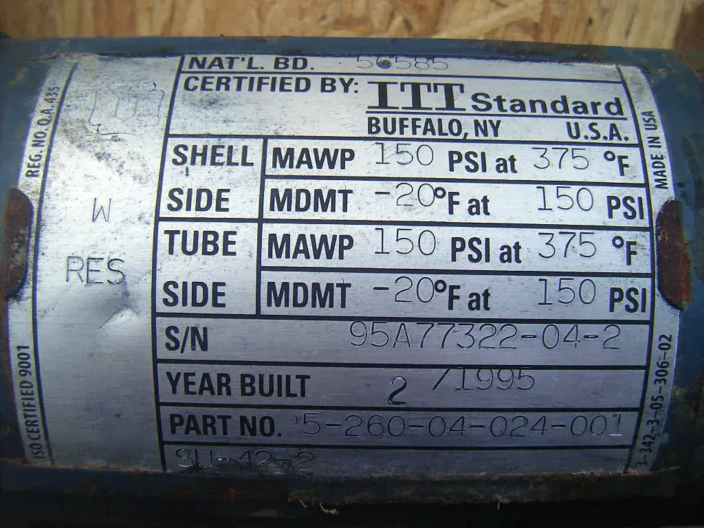 1995 Intercambiador de calor de carcasa y tubos ITT Bell & Gossett. Modelo: SU-42-2. Diseño de 2 pasos, tubos de cobre de ¾ pulg. de diámetro externo. Lado de carcasa y tubo: MAWP: 150 PSI a 375ºF, MDMT: -20ºF a 150 PSI. Entradas/salidas: (2) Línea S de 1-1/2 pulg. (3) FNPT de 1 pulg. Peso aproximado: 56 libras. Dimensiones totales: 2 pies 7-3/4 pulgadas de largo x 7-1/2 pulgadas de ancho x 8-3/4 pulgadas de alto (ACN14).