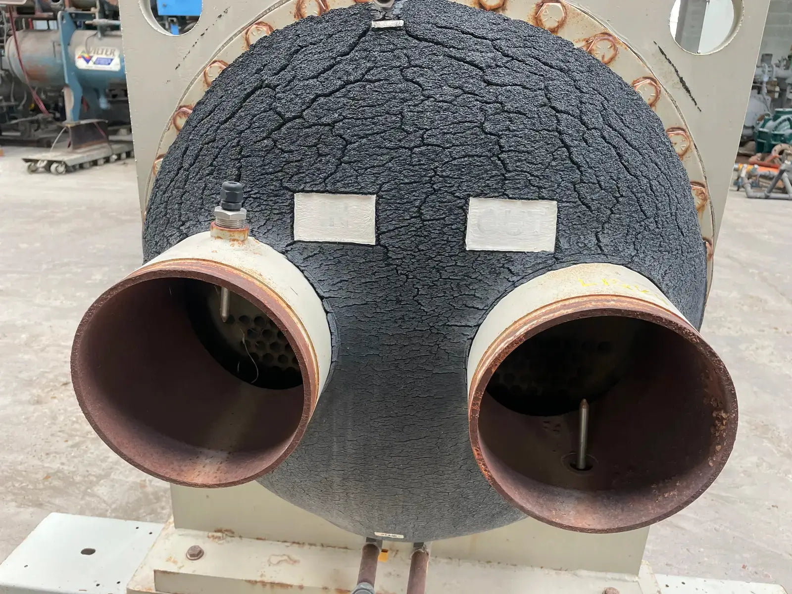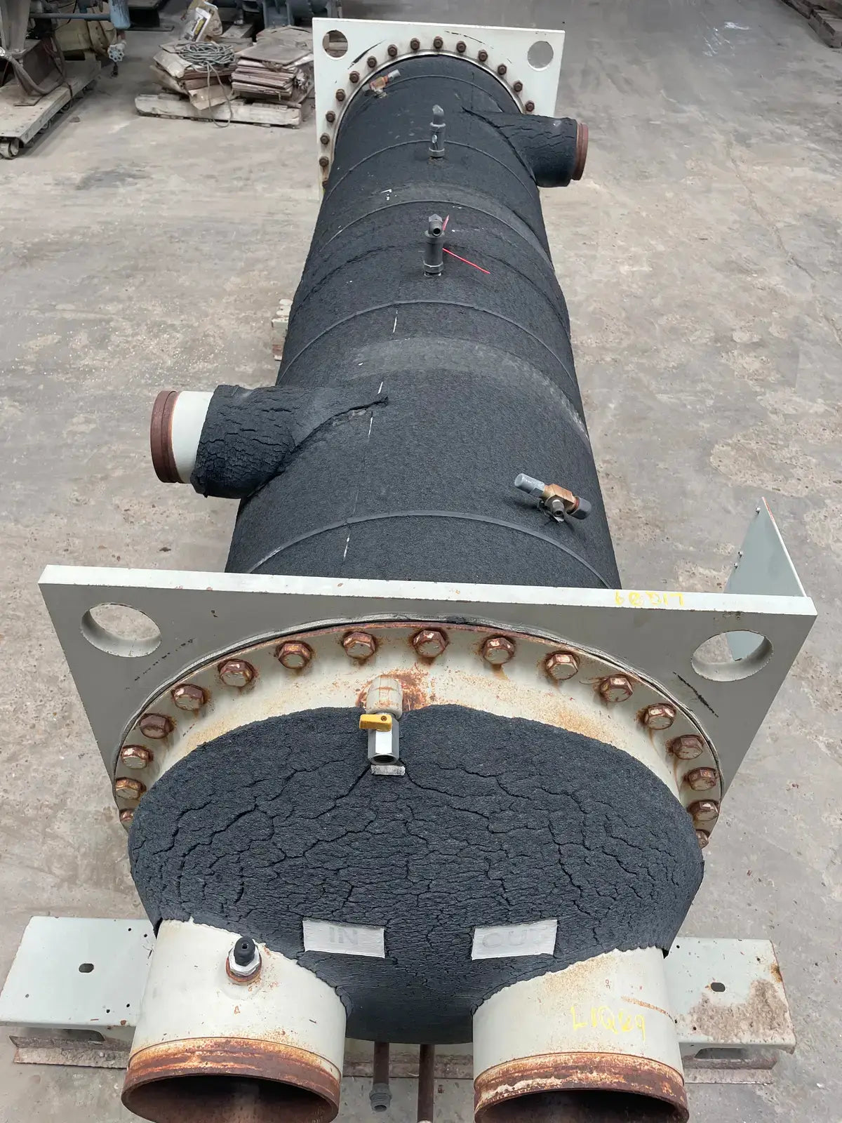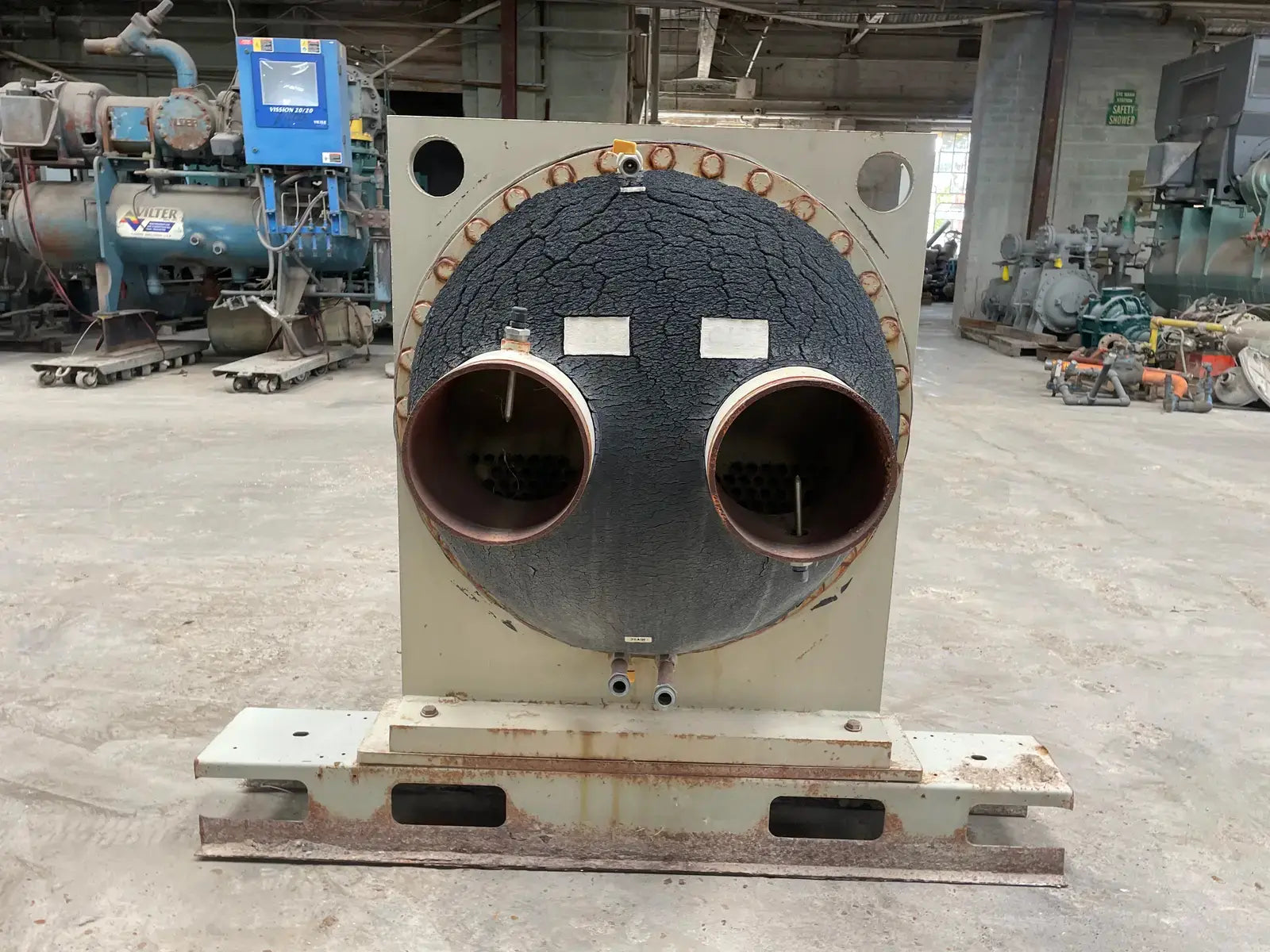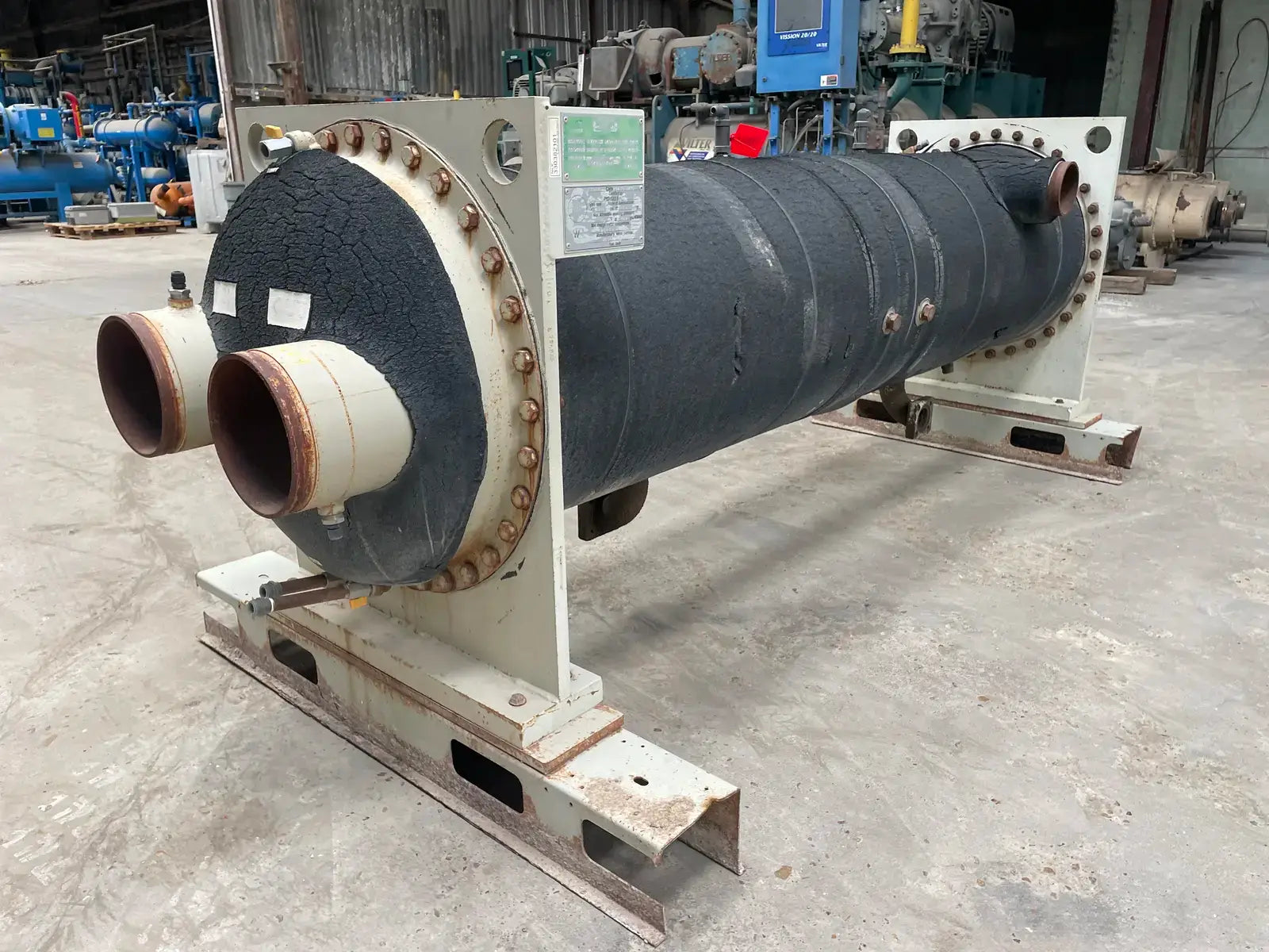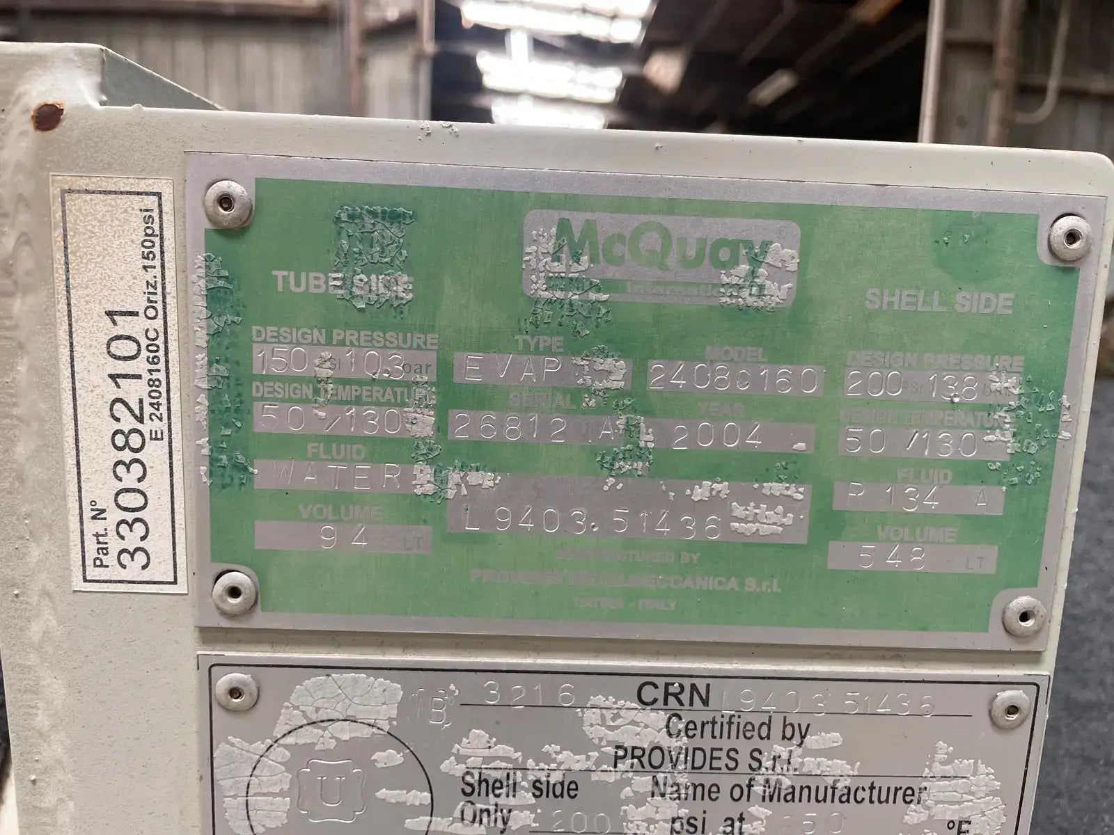 Intercambiador de calor de carcasa y tubos McQuay. Modelo: 2408c160. Número de serie: 26812 A. Tipo: EVAP. Año: 2004. Lado del tubo - Presión de diseño:: 150 PSI, 10,3 bar. Temperatura de diseño: 50/130. Fluido: Agua. Volumen: 94 LT. Lado de la carcasa - Presión de diseño: 200 PSI, 13,8 bar. Temperatura de diseño: 50/130. Fluido: R134A. Volumen: 548 LT. Lado Shell - Junta Nacional: 3216. CRN: 1940351436. MAWP: 200 PSI @ 250 F. MDMT: -20 @ 200 PSI. Número de serie del fabricante: 2004.