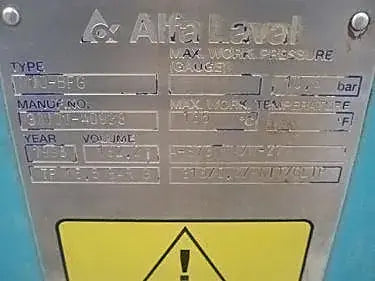 1996 Intercambiador de calor de placas Alfa Laval. Modelo: M10-BFG. Número de serie: 30101-40938. Número de placas: 277. Superficie de transferencia de calor: Aproximadamente: 780 pies cuadrados. MAWP: 149 psi a 275 °F. Volumen: 48 galones. Entradas/salidas: (4) 4 pulg. de diámetro. puertos. Dimensiones totales: 6 pies 1 pulg. de largo x 1 pie 6-1/2 pulg. de ancho x 3 pies 2-1/2 pulg. de alto (ACN329). (SOLDADO AMERICANO).