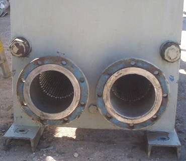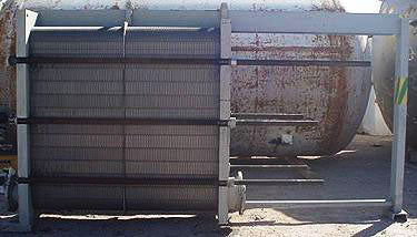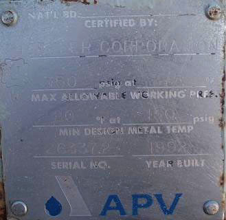 1992 Intercambiador de Calor de Placas APV. Modelo: SR950. Número de serie: 26337-2. Nat'l Bd: 4998. Capacidad de flujo nominal: 1400 gpm. Capacidad nominal de transferencia de calor: 8.732.500 Btu/h. Número de placas: 294. Número de divisores: 1. Superficie de transferencia de calor: aprox. 3075 pies cuadrados MAWP: 150 psig a 275 °F. MDMT: 20 °F a 150 psig. Entradas: (1) 8 pulg. de diámetro. puerto bridado (producto), (1) 8 pulg. de diámetro. puerto embridado (medios). Salidas: (1) 8 pulg. de diámetro. puerto bridado (producto), (1) 8 pulg. de diámetro. puerto embridado (medios). Dimensiones totales: 12 pies 8-1/2 pulgadas de largo x 2 pies 9-1/2 pulgadas de ancho x 7 pies de alto (ACN900).