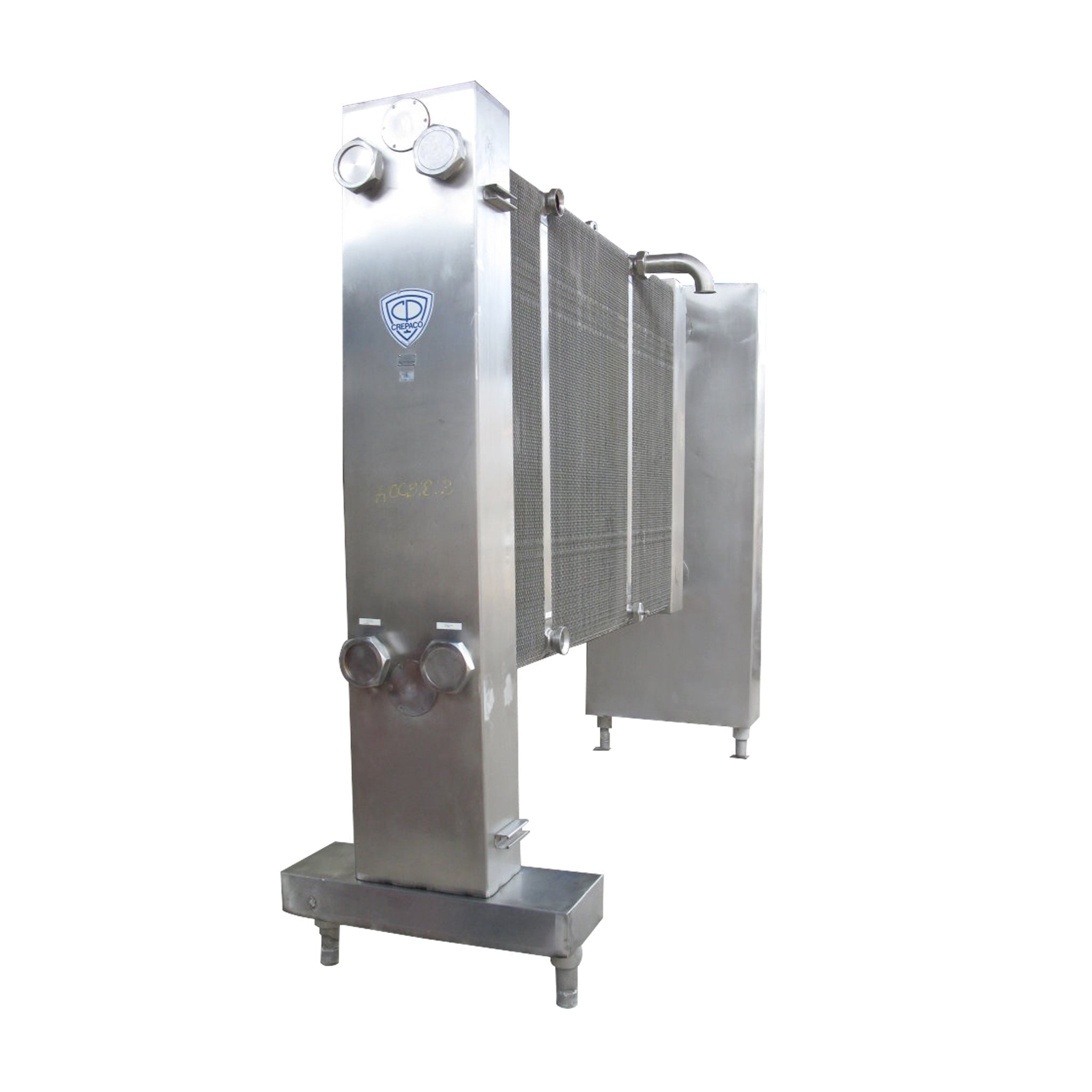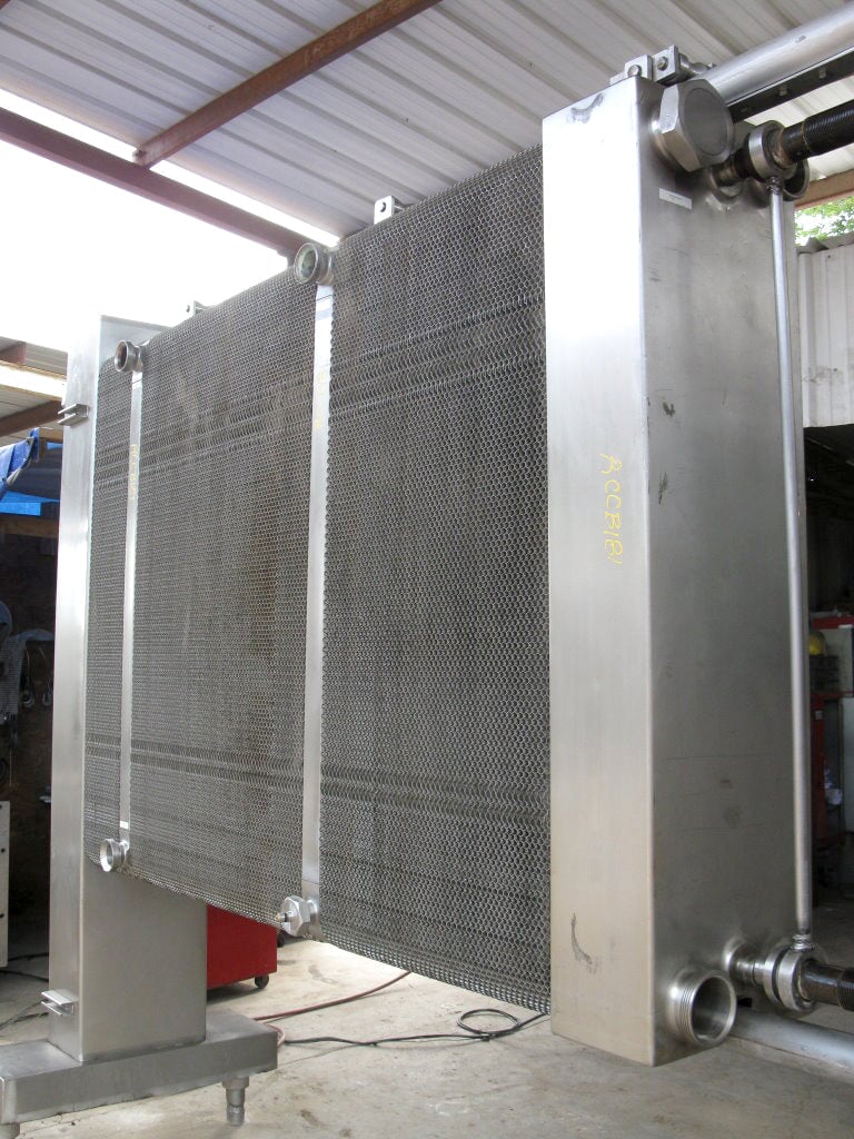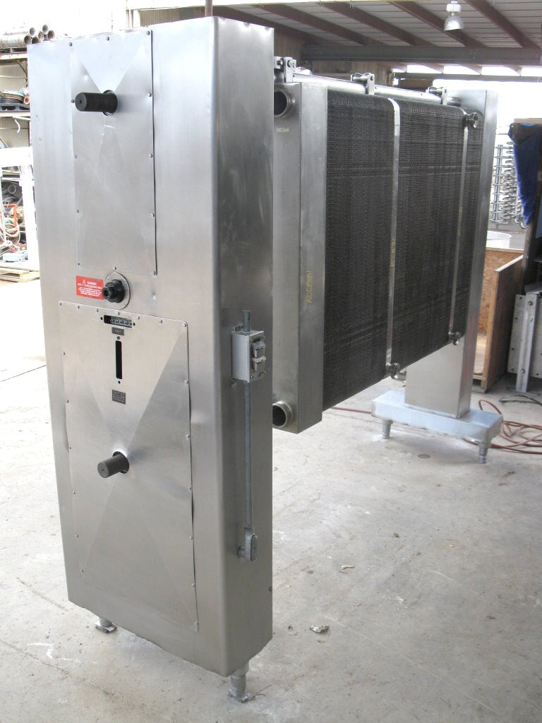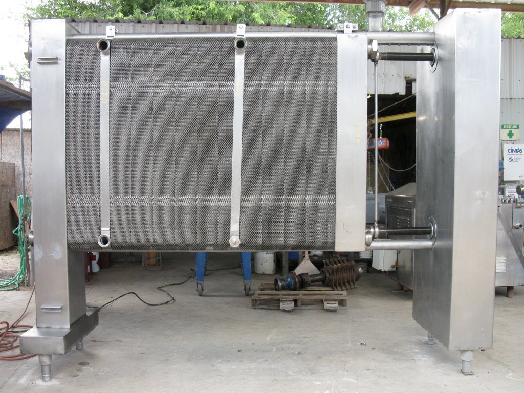Intercambiador de calor de placas APV Crepaco HTST. Modelo: CR5. Superficie total aproximada de transferencia de calor: 1490 pies cuadrados (261) 316 placas de acero inoxidable. La aplicación original incluía calentar, regenerar y enfriar 3000 GPH de productos de crema agridulce utilizando 110 GPM de agua caliente y 140 GPM de propilenglicoles como medio. En general, incluye el intercambiador de calor CR5, el tubo de retención de 8 pasos de acero inoxidable y el tanque de equilibrio de acero inoxidable. La aplicación anterior era de 3000 galones por hora. Dimensiones del intercambiador de calor: 11 pies 7 pulgadas de largo x 3 pies 5 pulgadas de ancho x 8 pies 6 pulgadas de alto.