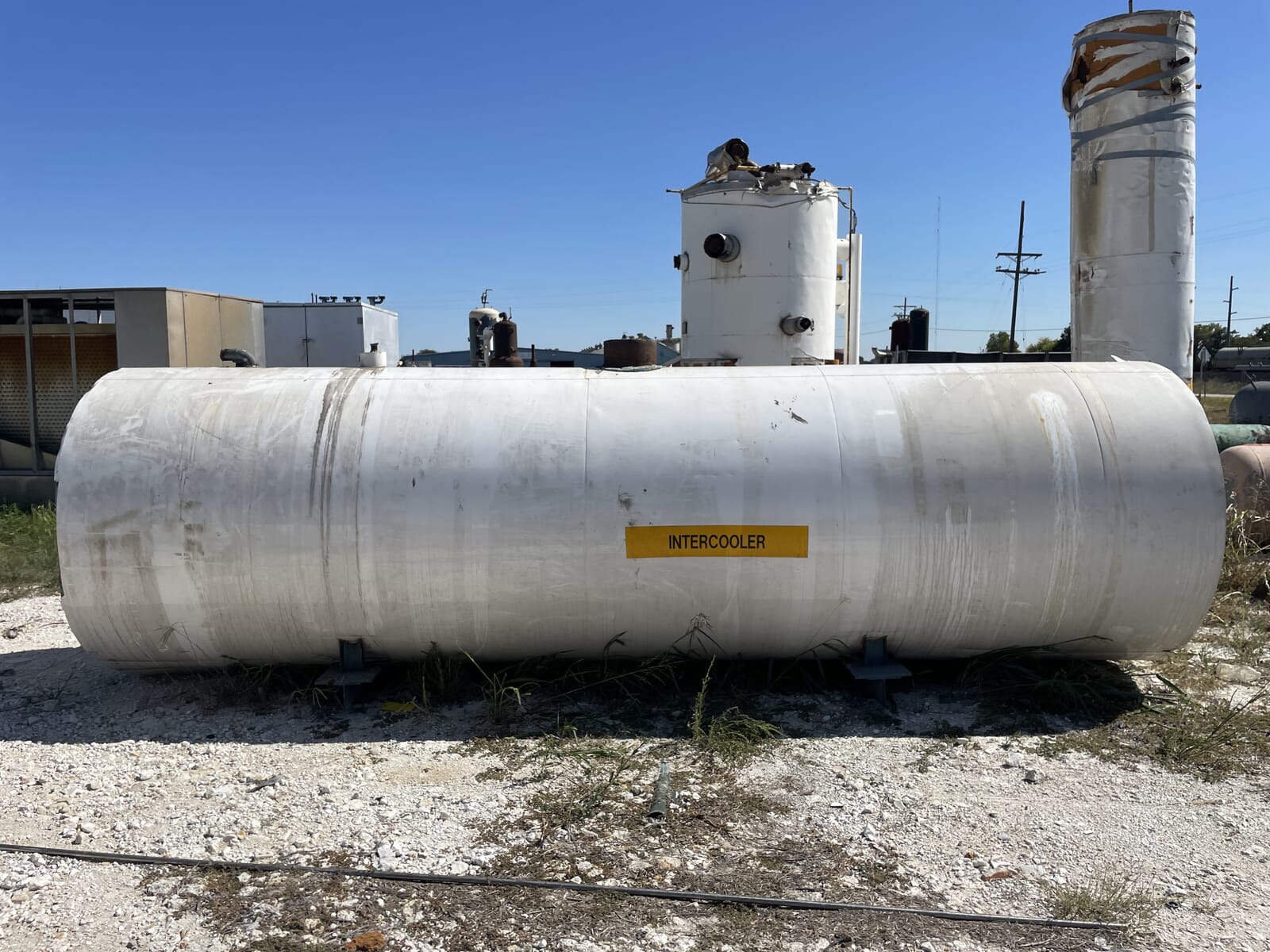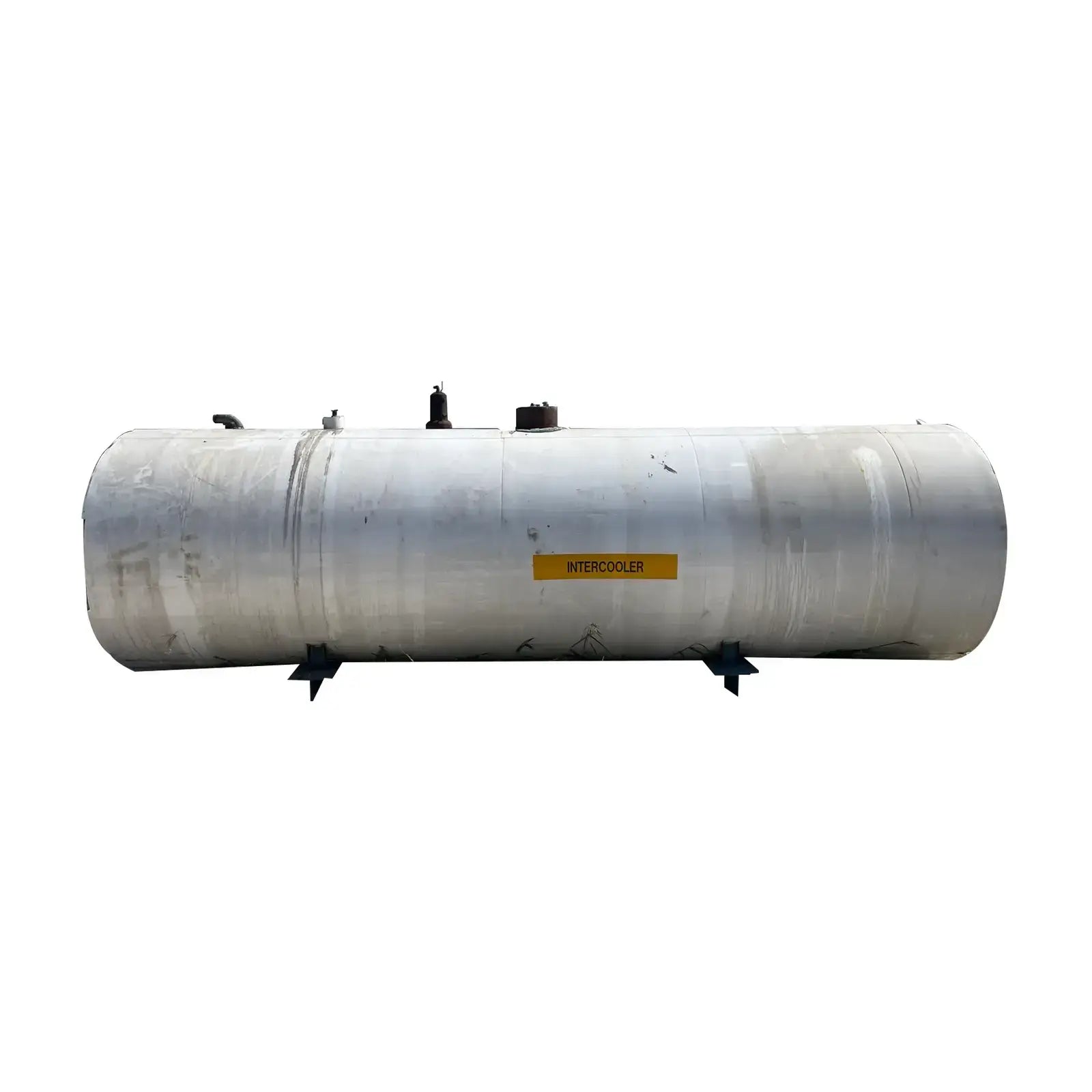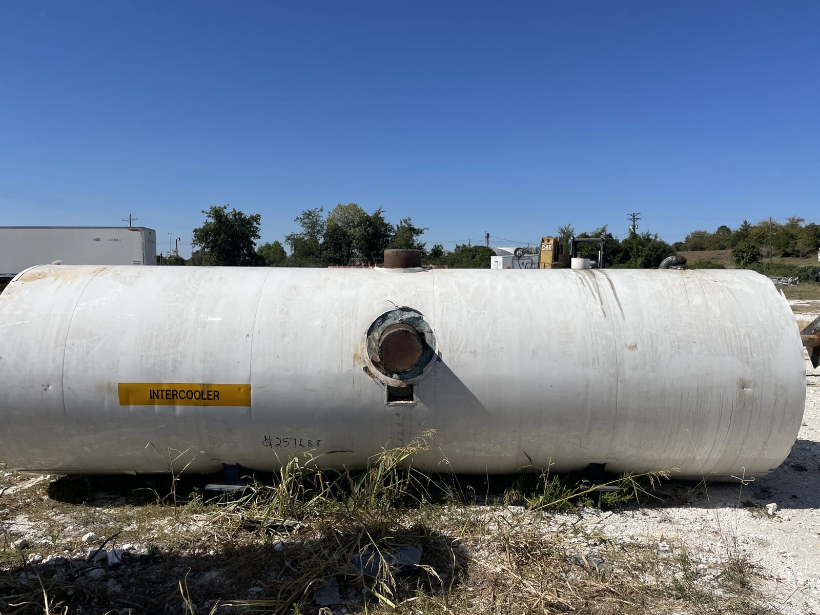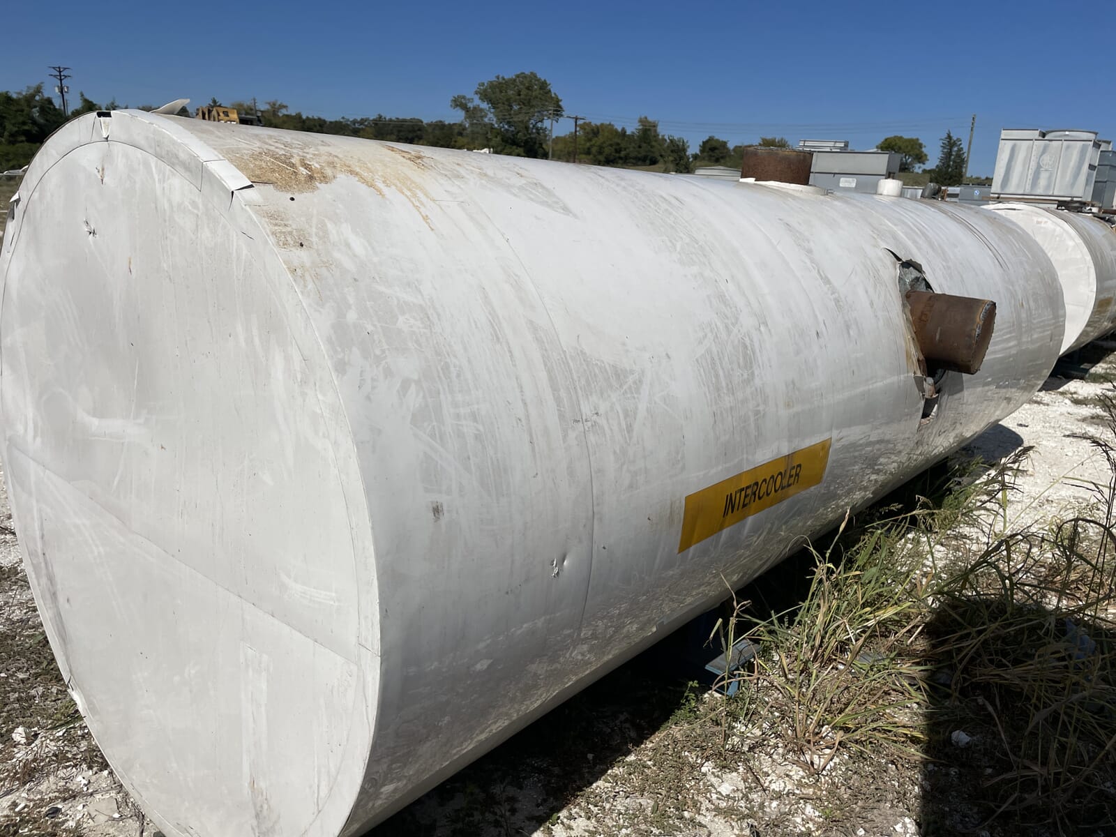 Intercooler horizontal con intercambiador de calor de precisión. Número de serie: 11421-2. Año de construcción: 1987. Presión de trabajo máxima permitida: 225 PSI a 200 F. Dimensiones estimadas del recipiente: 52 diámetro x 203 L. Capacidad estimada: 2185 galones.