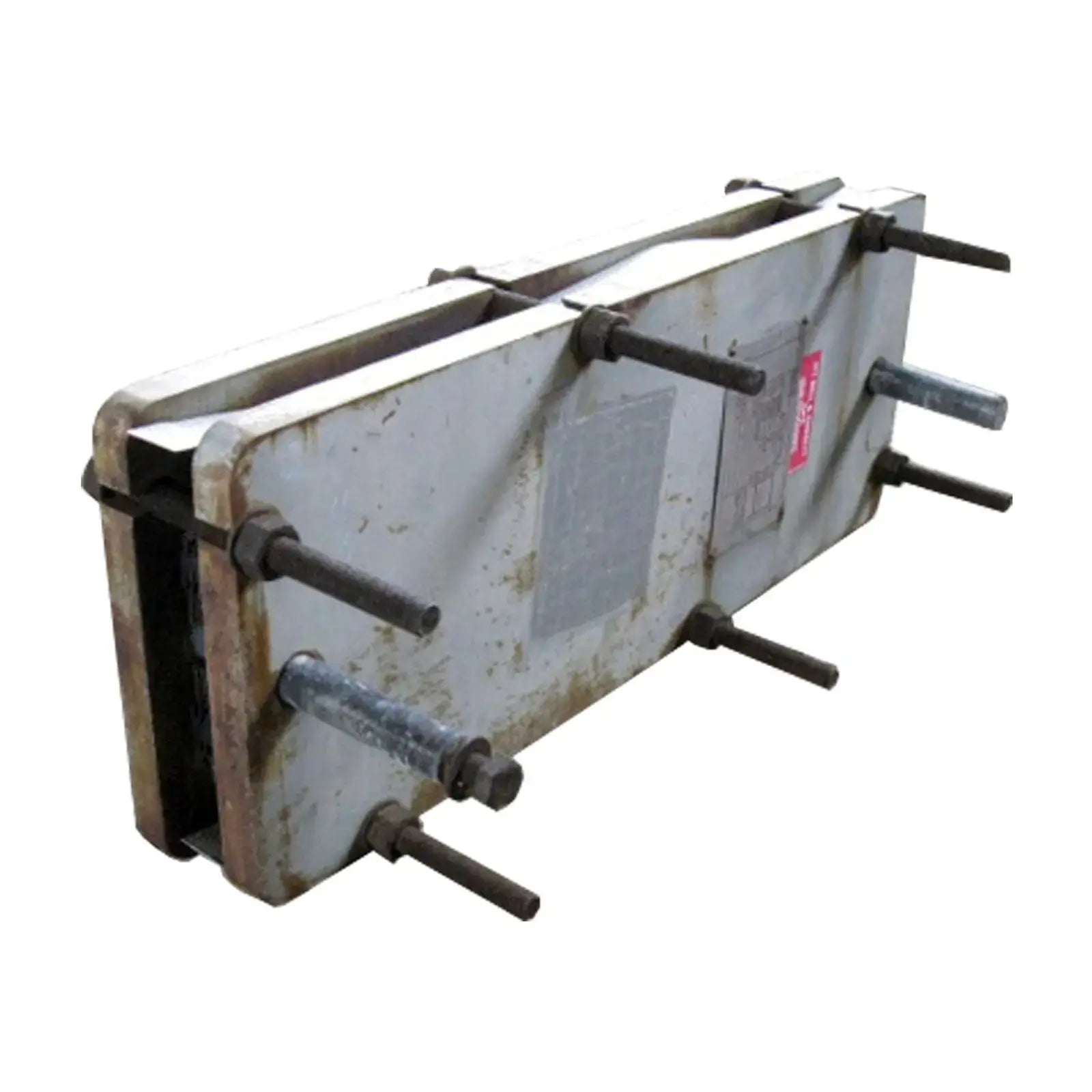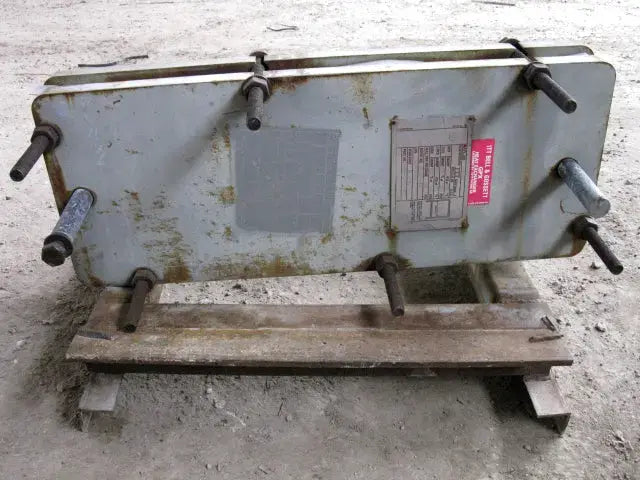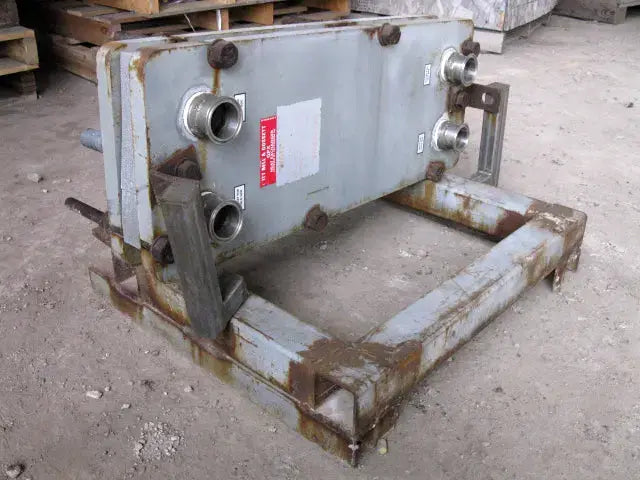 1995 Intercambiador de calor ITT Bell & Gossett GPX. Modelo: GPX151-013. Número de serie: 95A54218-01. Número de pieza: 5-635-21-013-007. Nacional. Bd. No: 42365. (12) Placas de acero inoxidable 316. Área de superficie de transferencia de calor de la placa: 16,4 pies cuadrados. Dimensiones de la placa: 2 pies 5-1/4 pulgadas de largo x 9-1/2 pulgadas de ancho. MAWP del lado frío y caliente: 150 psi a 230 °F. MDMT del lado frío y caliente: 32°F a 150 psi. Entradas/salidas: (4) Línea S de 2 pulgadas. Dimensiones totales: 2 pies 11 pulgadas de largo x 2 pies 1 pulgadas de ancho x 1 pie 7-1/2 pulgadas de alto.