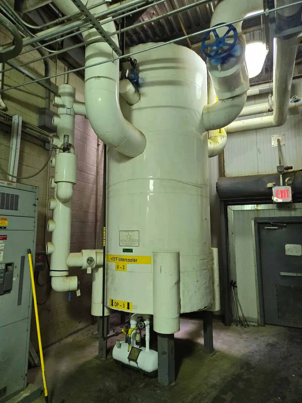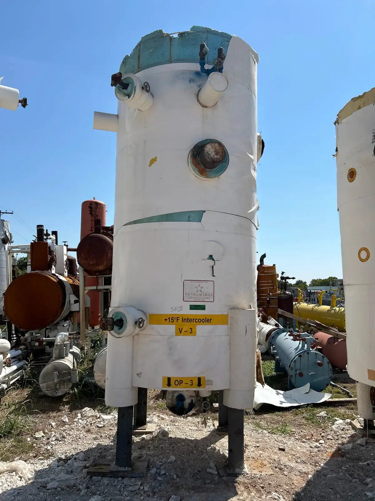 Intercooler de amoníaco vertical FES usado. Número de serie: 950686. National Board: 8264. Número de plano: 95499083-1E. Año de construcción: 1995. Dimensiones del recipiente: 60 de diámetro x 136 pulgadas. Capacidad estimada en galones: 2155 galones. MAWP: 150 PSI a 650 F. MDMT: -20 F a 150 PSI. Entrada de líquido/gas (1): 6 pulgadas. Entrada/salida de gas (1-1): 8 pulgadas. Salida de líquido (1): 2 pulgadas.