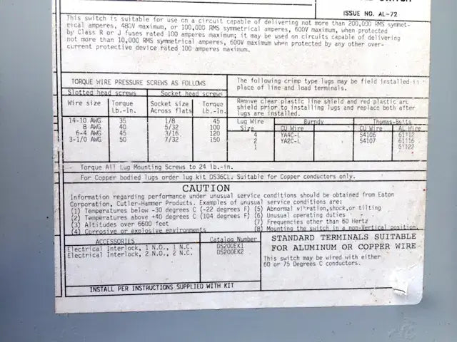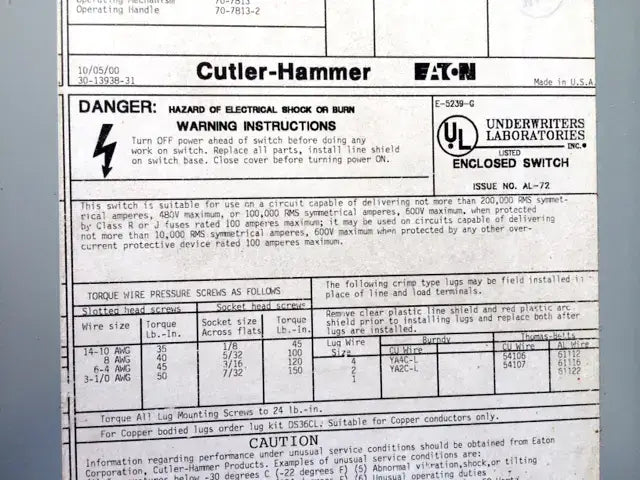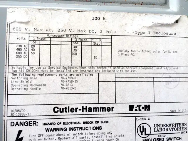 (35) Interruptor de seguridad de servicio pesado Cutler-Hammer / Eaton / Desconexiones eléctricas. Modelo: DH363UGK. 100 A, 600 V máx. de CA, 250 V máx. de CC, 3 polos, gabinete tipo 1. 30-13938-31. Clasificaciones de caballos de fuerza: 240 VCA: 20 HP, monofásico; 40 CV, trifásico. 480 VCA: 40 HP, monofásico; 75 CV, trifásico. 600 VCA: 50 HP, monofásico; 100 CV, trifásico. 250 VCC: 20 HP, CC. Fecha: 05/10/00. Hecho en EE.UU. (ACN3a-4a)