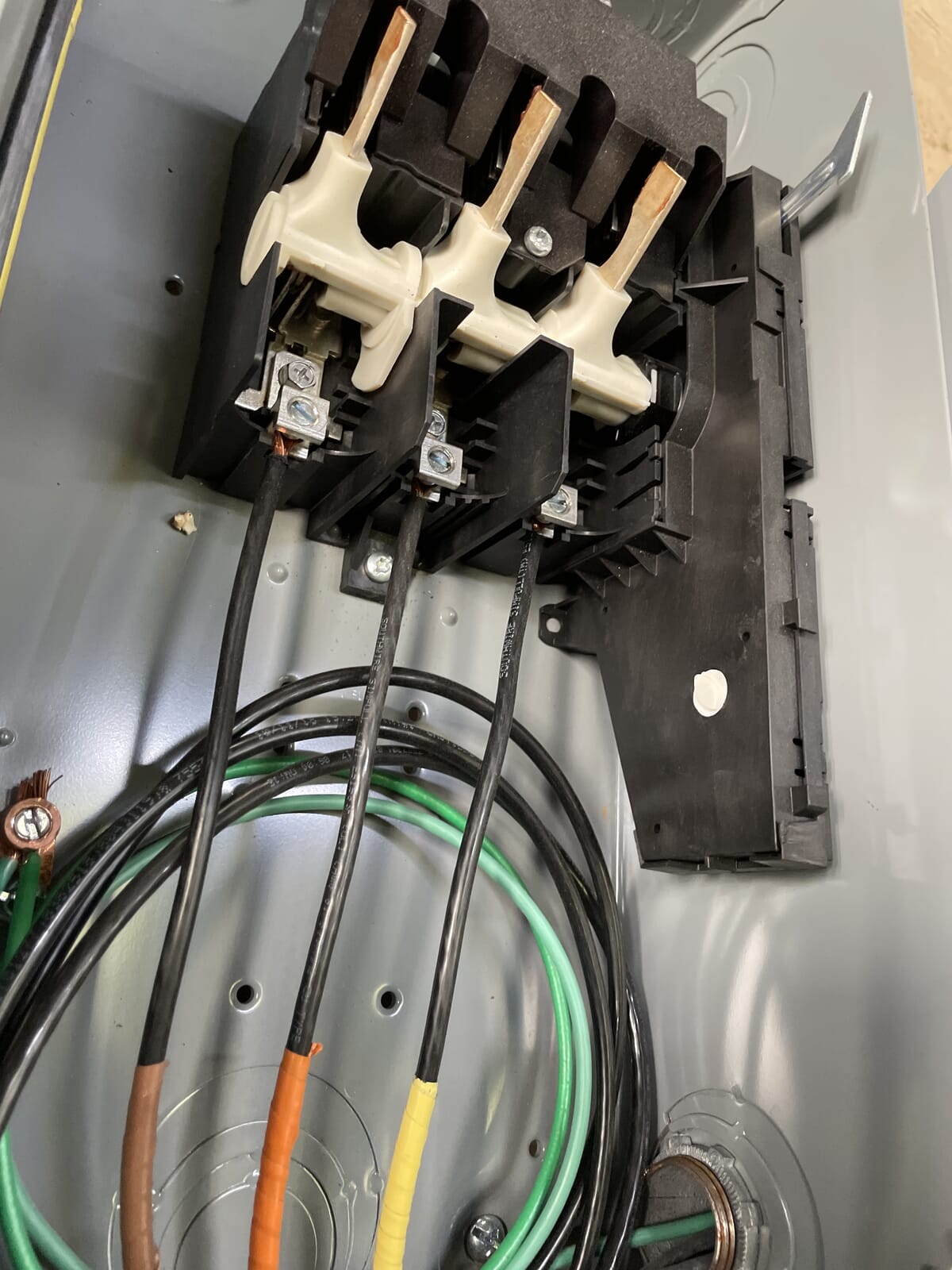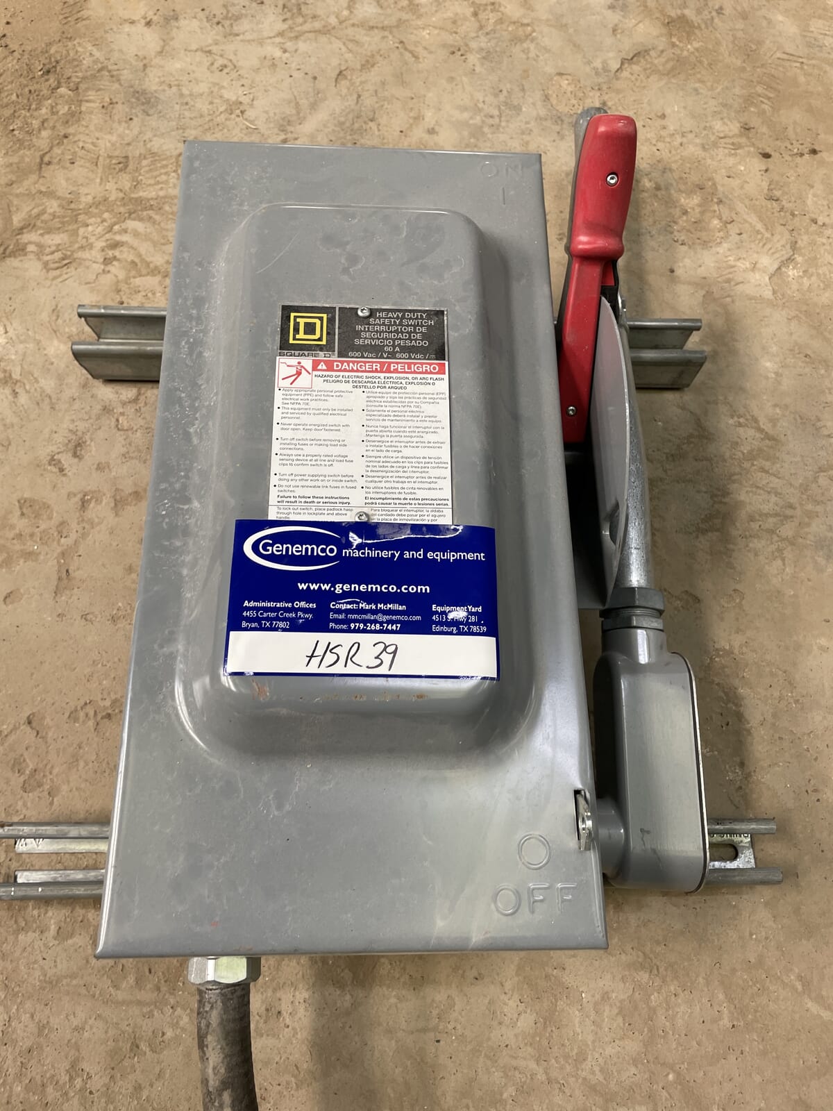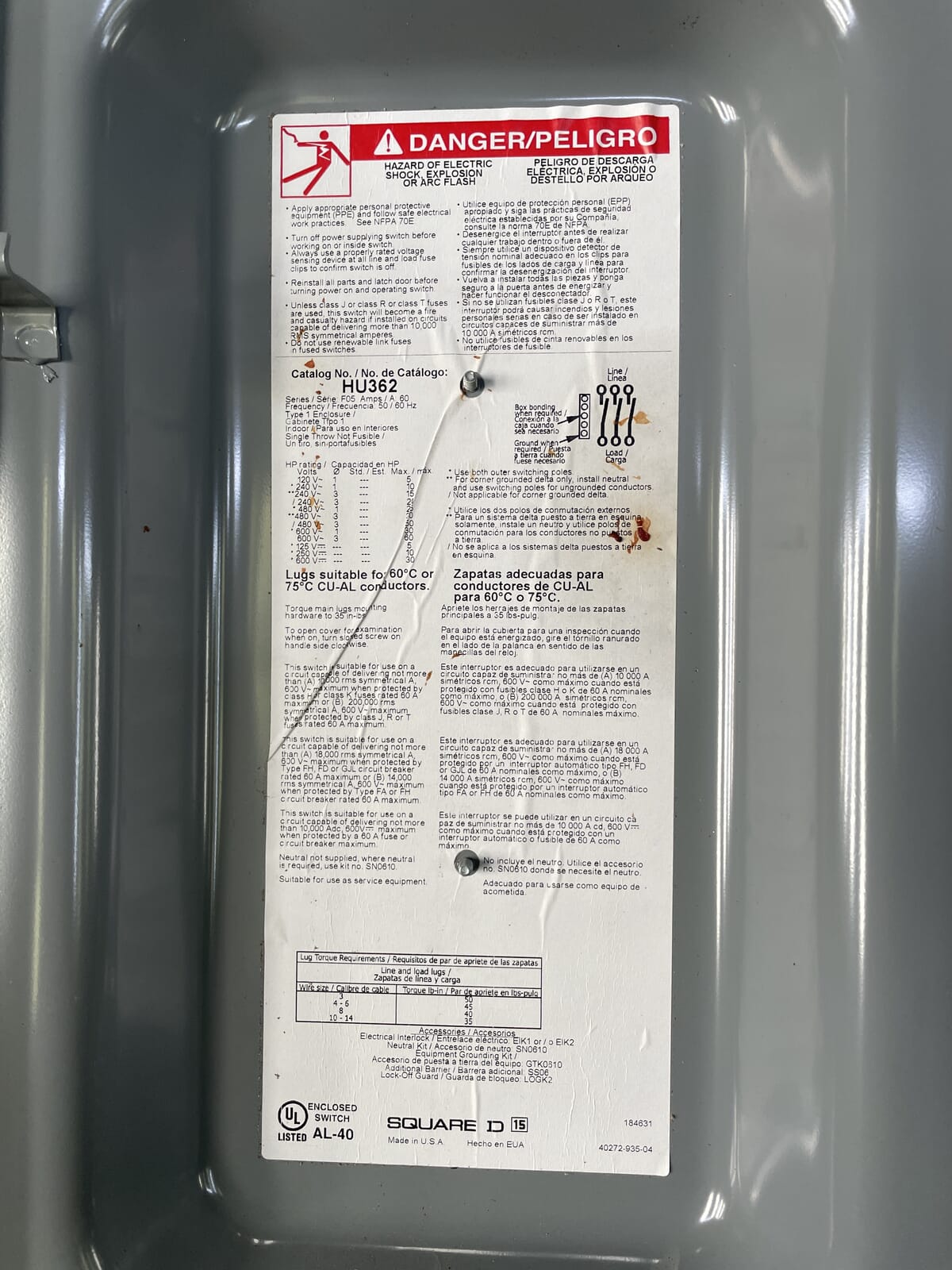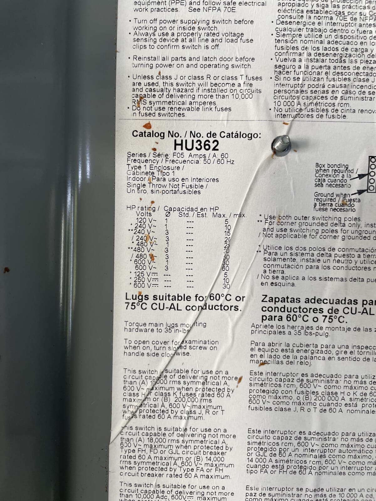 Interruptor de seguridad resistente de Square D Company. Número de catálogo: HU362. Desconexión sin fusibles. 3 hilos, 3 polos. HP máximo: 60. 600 voltios CA/CC. NEMA 1.