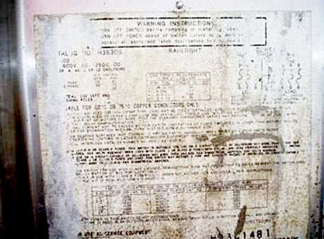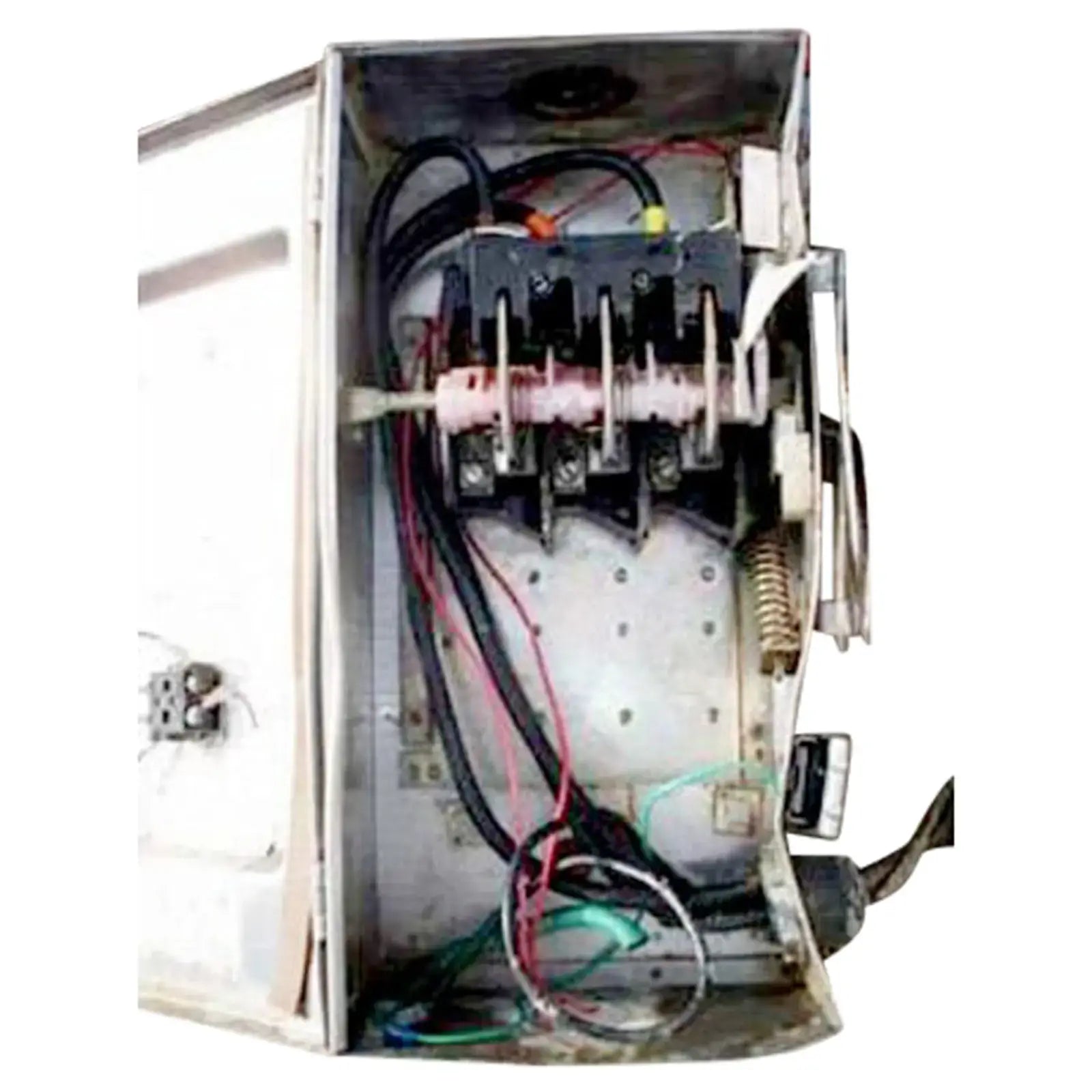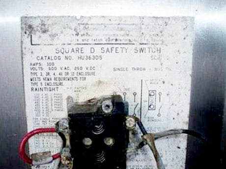 Interruptor de seguridad Square D Company: 100 amperios. Número de gato: H6363DS. Hp máx.: 75. Máx. Alimentación: 600 VAC/250 VDC. Cerramiento de acero inoxidable. Dimensiones totales: 11 pulgadas de largo x 8 pulgadas de ancho x 1 pie 9 pulgadas de alto.