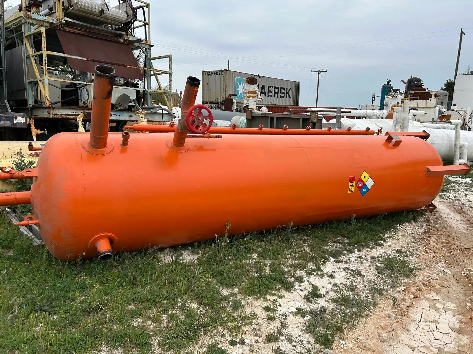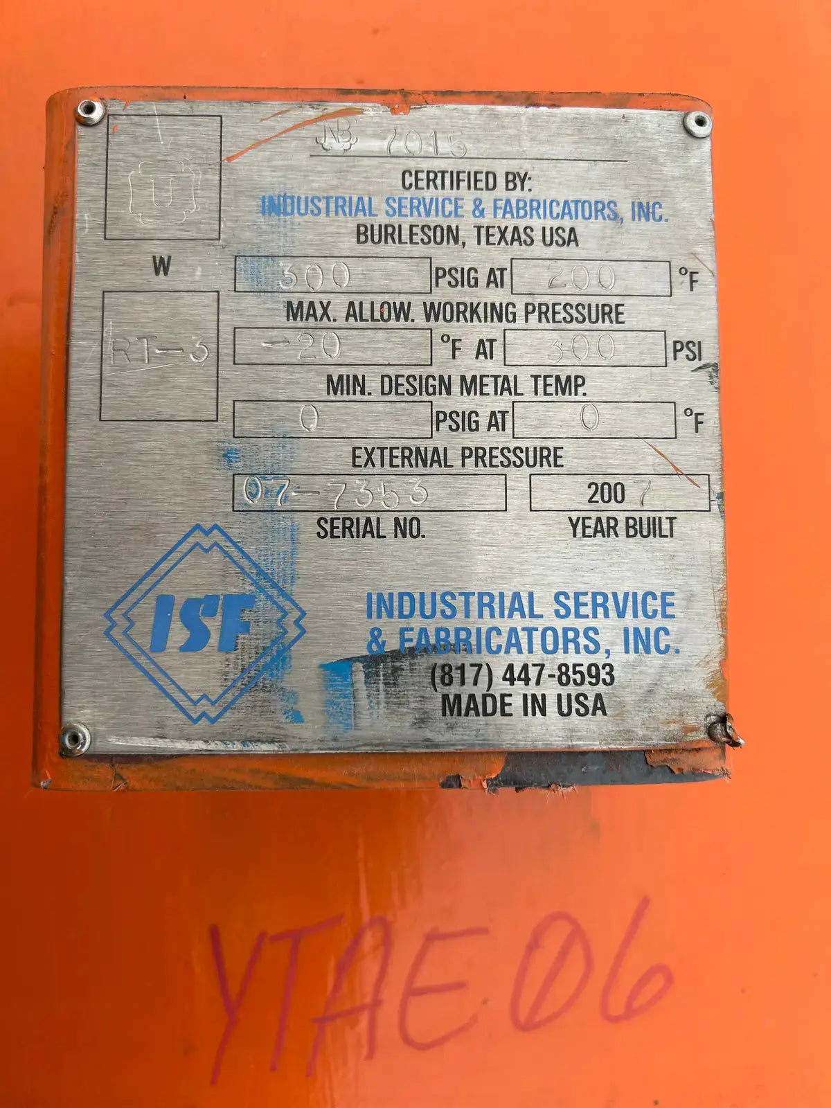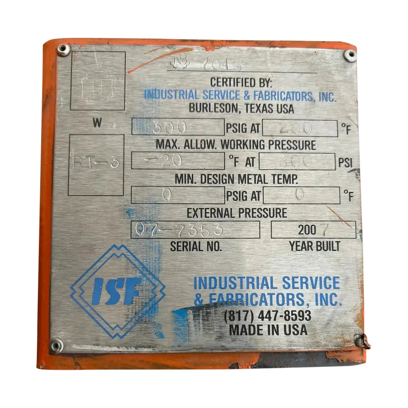Certificado por Industrial Service & Fabricators, Inc. Receptor Vertical. Junta Nacional: 7015. N.º de serie: 07-7353. Año de construcción: 2007. Presión máxima de trabajo (MAWP): 300 PSI a 200 °F. Presión mínima de trabajo (MDMT): -20 °F a 300 PSI. Dimensiones del recipiente: 48" de diámetro exterior x 216" de largo. Capacidad estimada: 1942 galones.
