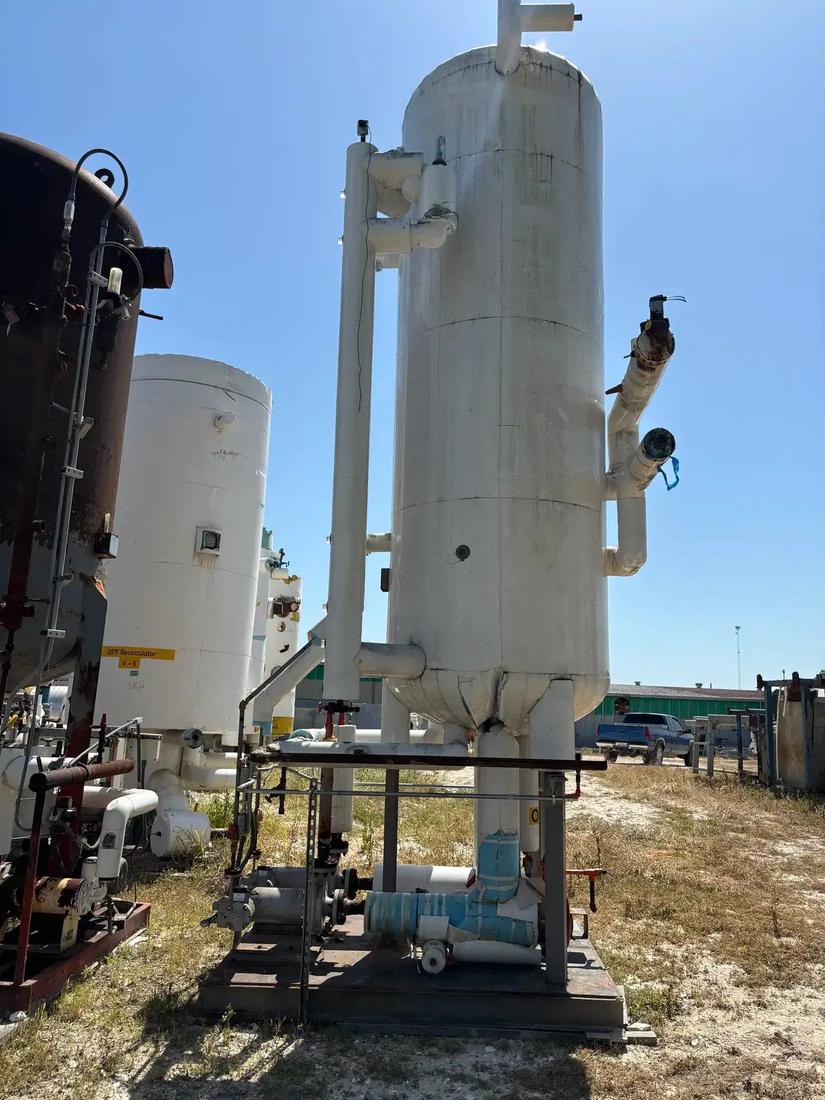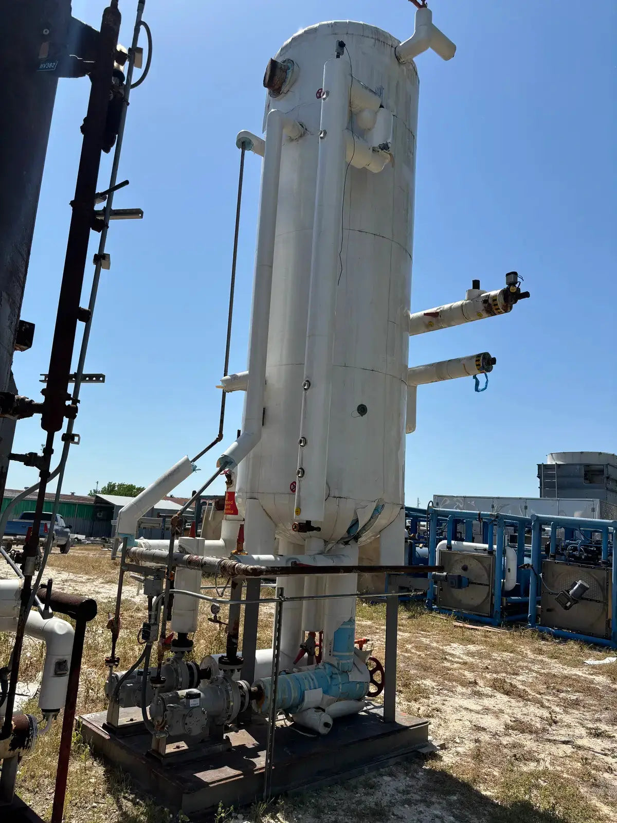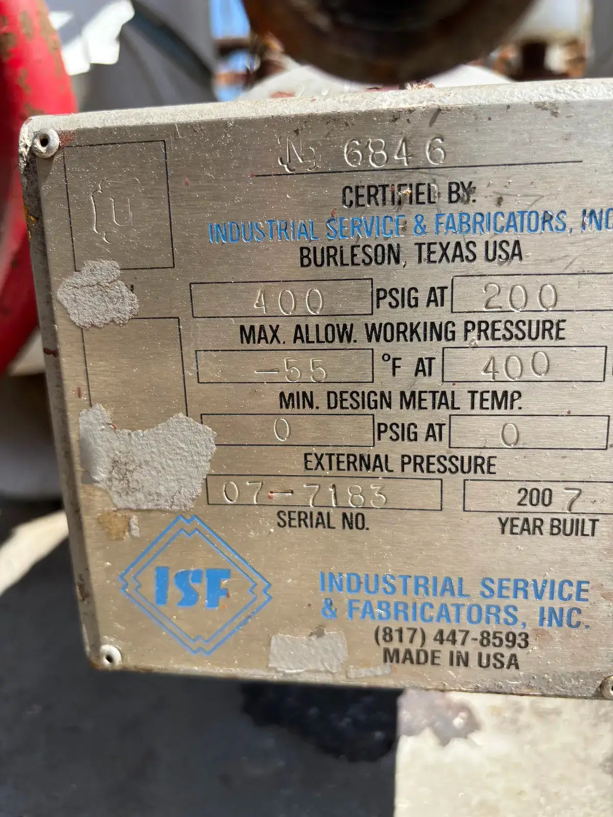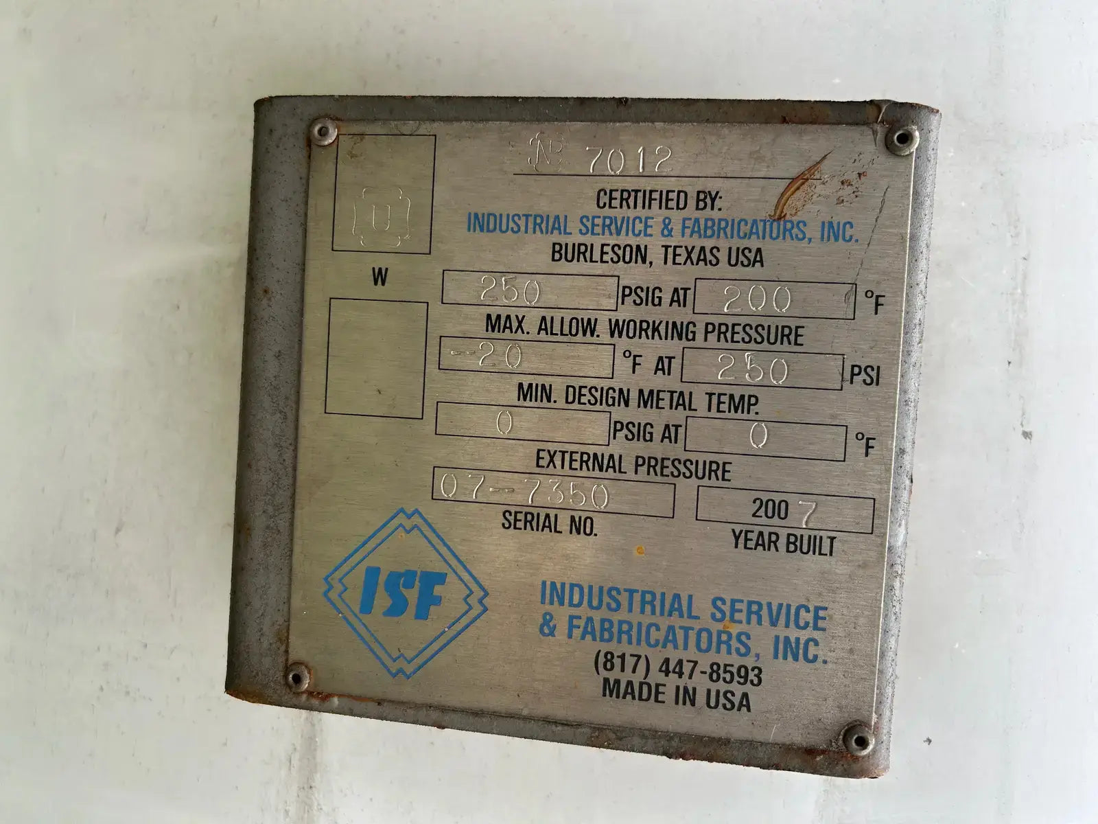 Recirculador vertical de amoníaco certificado por Industrial Service & Fabricators, Inc. Junta Nacional: 7012. N.º de serie: 07-7350. Año de fabricación: 2007. Presión máxima de trabajo (MAWP): 250 PSIG a 200 °F. Presión mínima de trabajo (MDMT): -20 °F a 250 PSI.