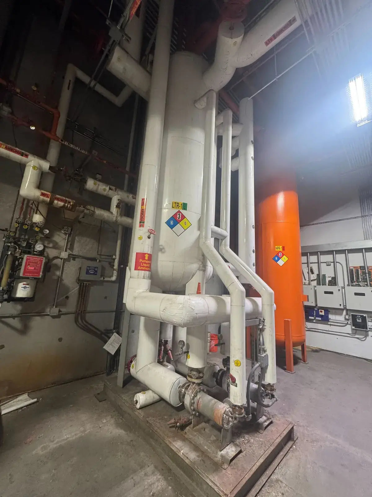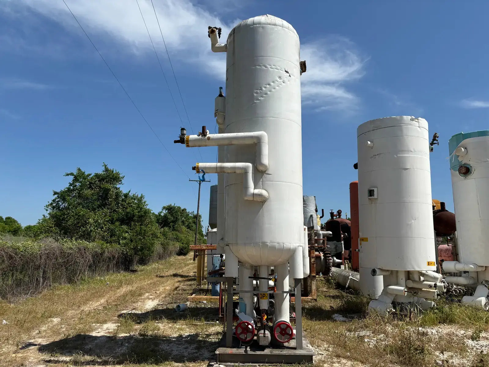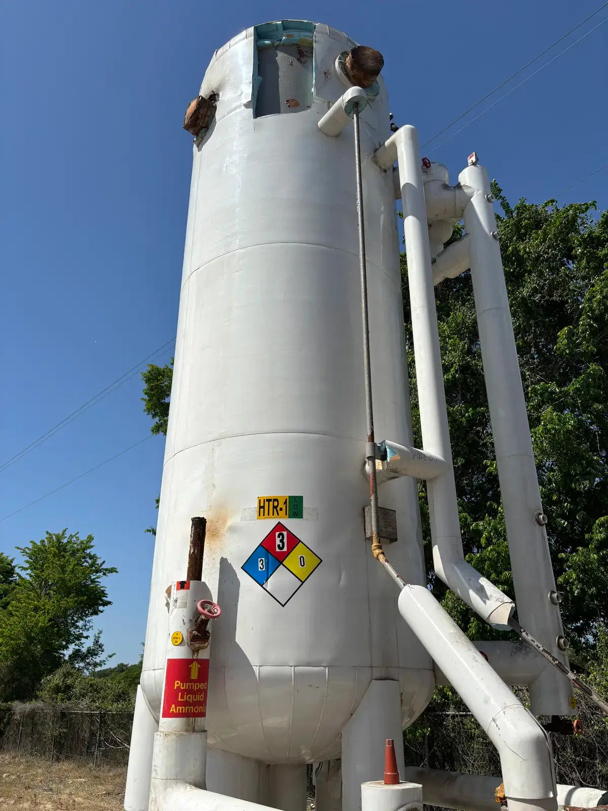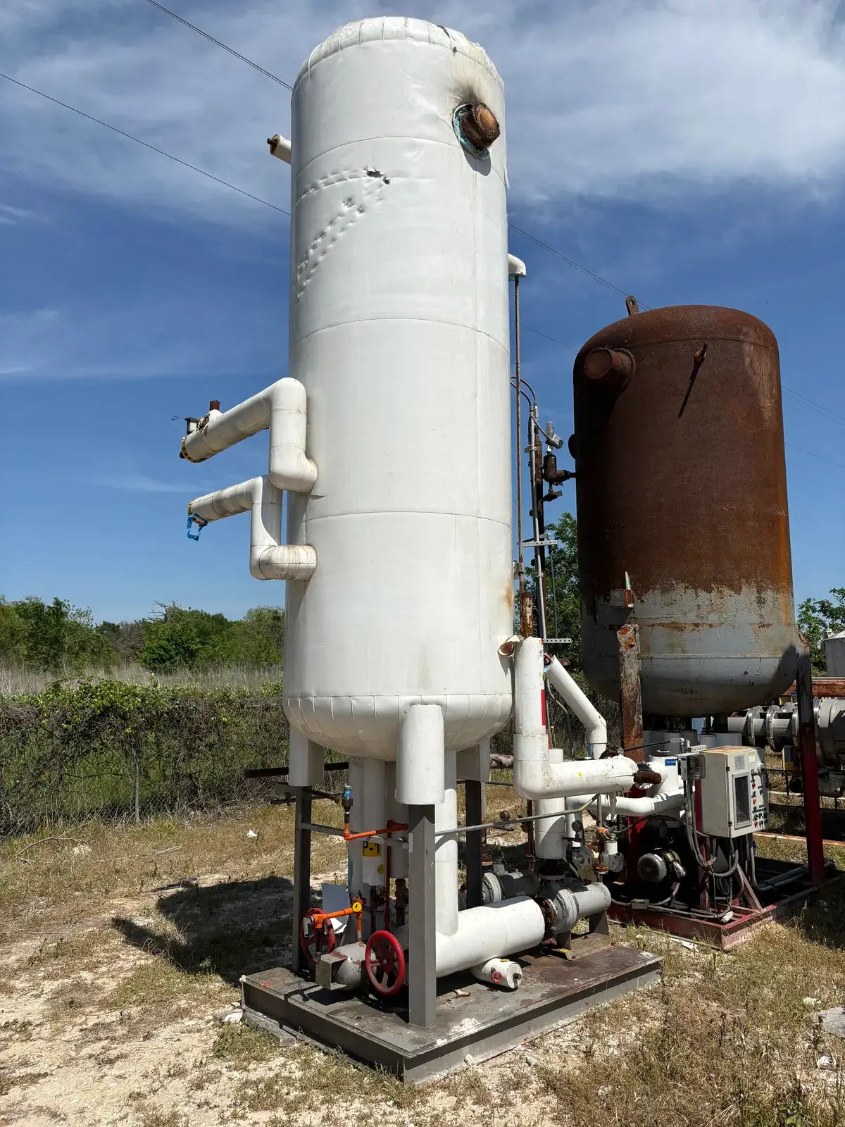 Recirculador vertical de amoníaco certificado por Industrial Service & Fabricators, Inc. Junta Nacional: 7012. N.º de serie: 07-7350. Año de fabricación: 2007. Presión máxima de trabajo (MAWP): 250 PSIG a 200 °F. Presión mínima de trabajo (MDMT): -20 °F a 250 PSI.