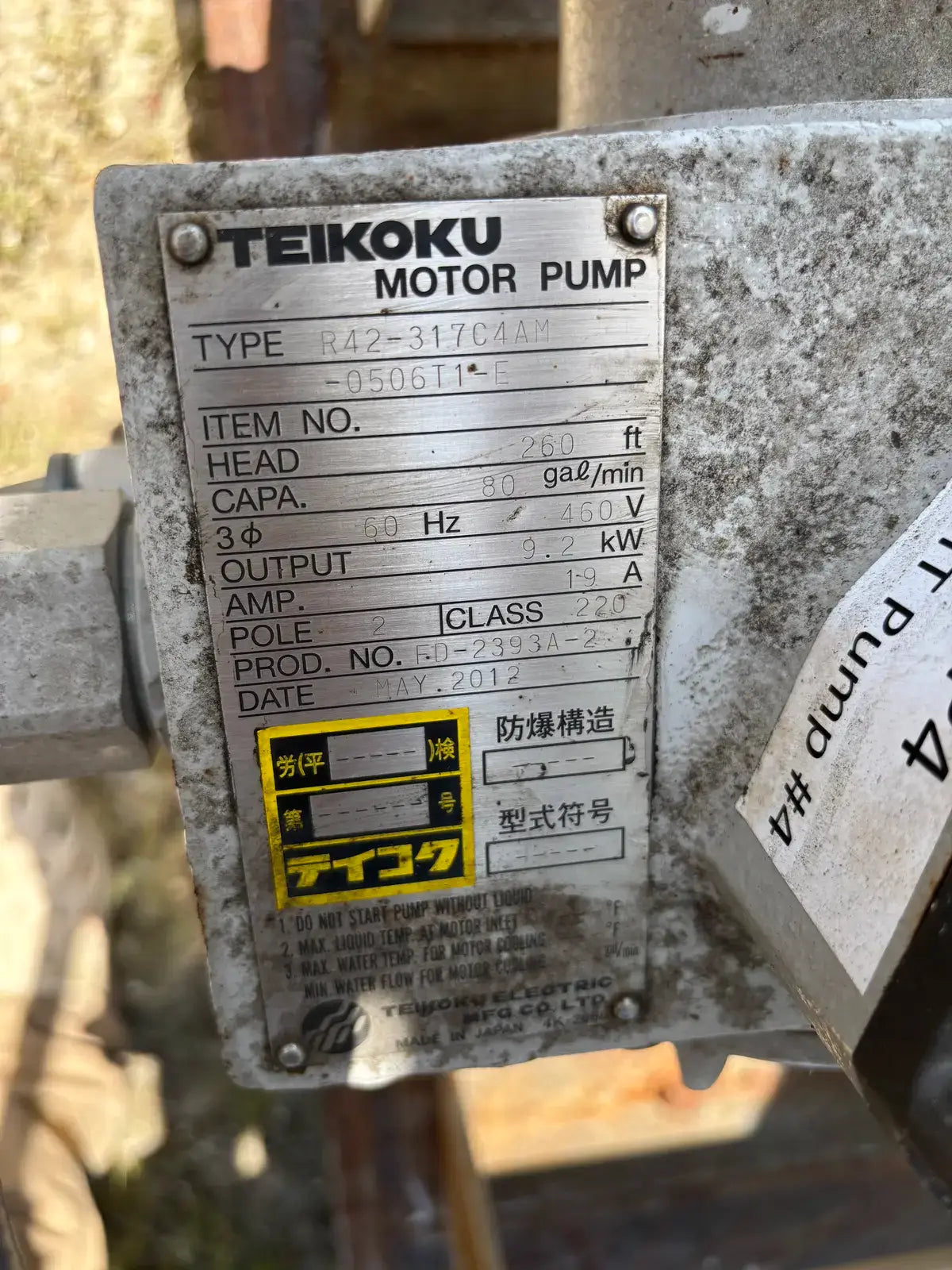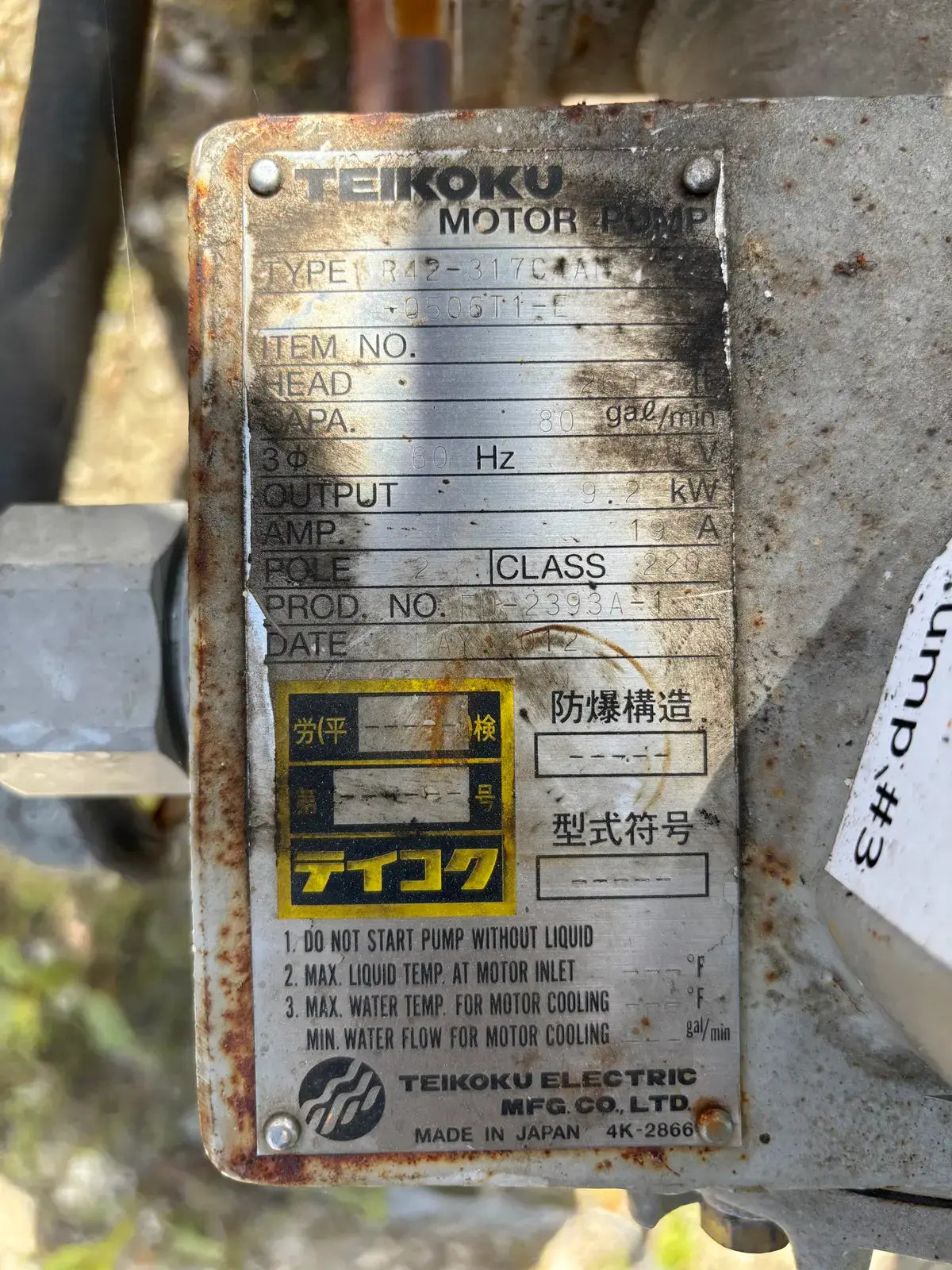 - Si hay varios motores, descripciones de motores frente a especificaciones: (2) Teikoku Motor's - 12.3 Hp, 60 Hz, 460 Volts, 3 Ph.