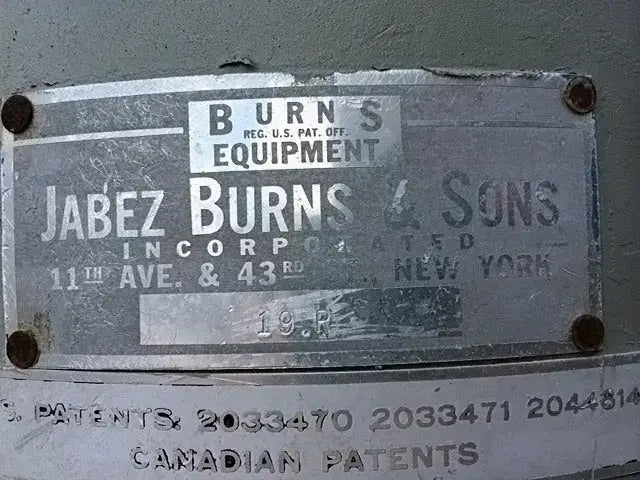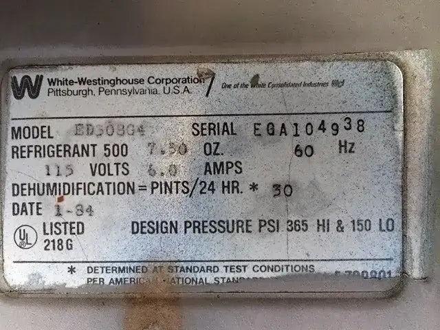 Jabez Burns & Sons incorporados. Nueva York, Estados Unidos. Equipo de Burn número 19.R. Burns No. 8 Blanqueador de nueces partidas. White-Westinghouse Corp. modelo ED30BG4, serie EGA104938. Refrigerante 500, 7,5 oz. 115 V, 6,0 amperios, 60 Hz. Deshumidificación = pintas/24 hr x 30. Fecha: enero de 1984. Motor eléctrico GE 2 HP, 208/416V, trifásico, 60 Hz. (MI)