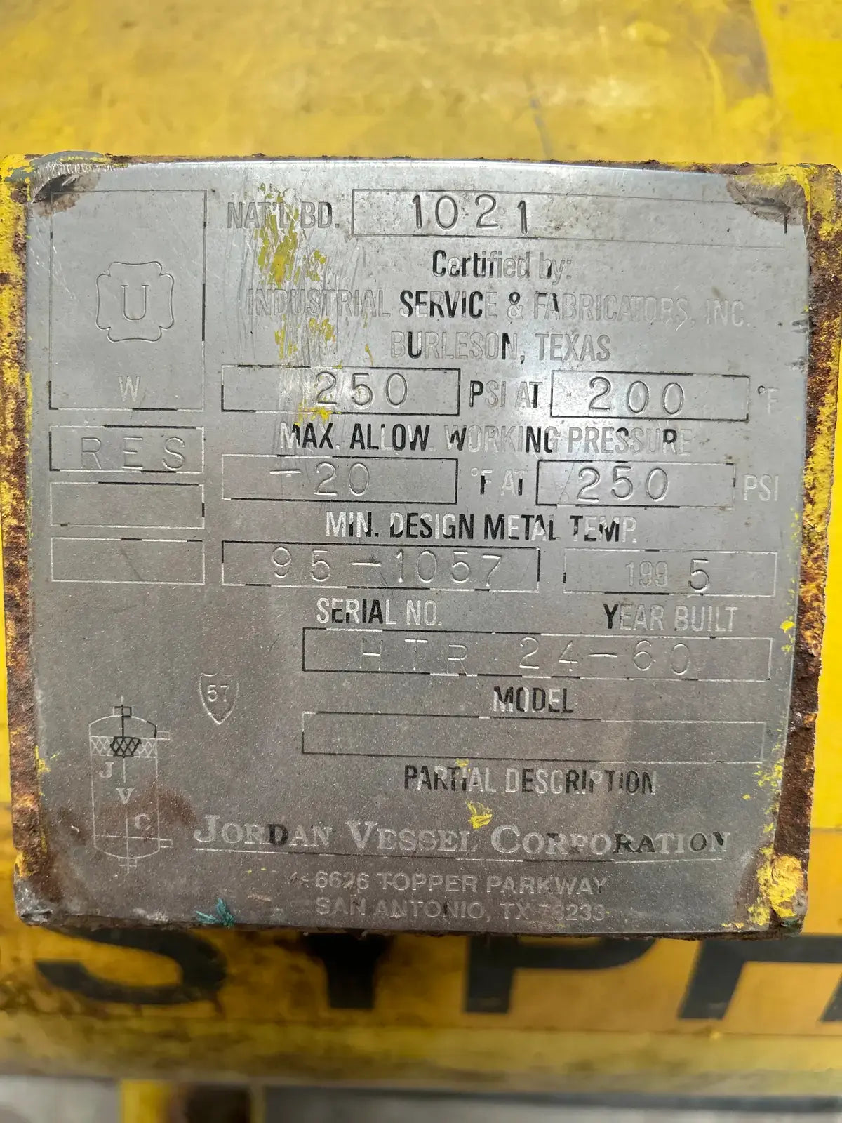 Receptor termosifón horizontal de Jordan Vessel Corporation. National Board: 1021. N.º de serie: 95-1057. Modelo: HTR 24-60. Presión máxima de trabajo (MAWP): 250 PSI a 200 F. Presión mínima de trabajo (MDMT): -20 F a 250 PSI. Año de construcción: 1995. Dimensiones del recipiente: 24" X 60". Capacidad de almacenamiento estimada: 150 galones.