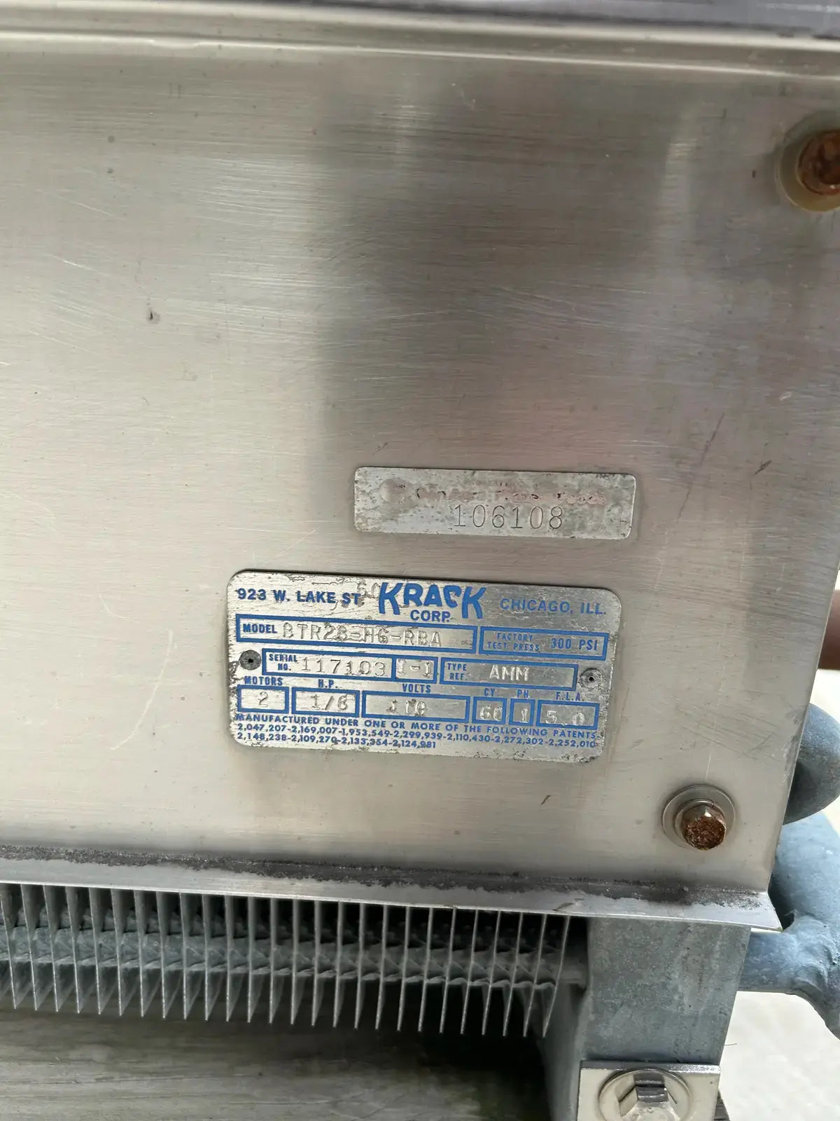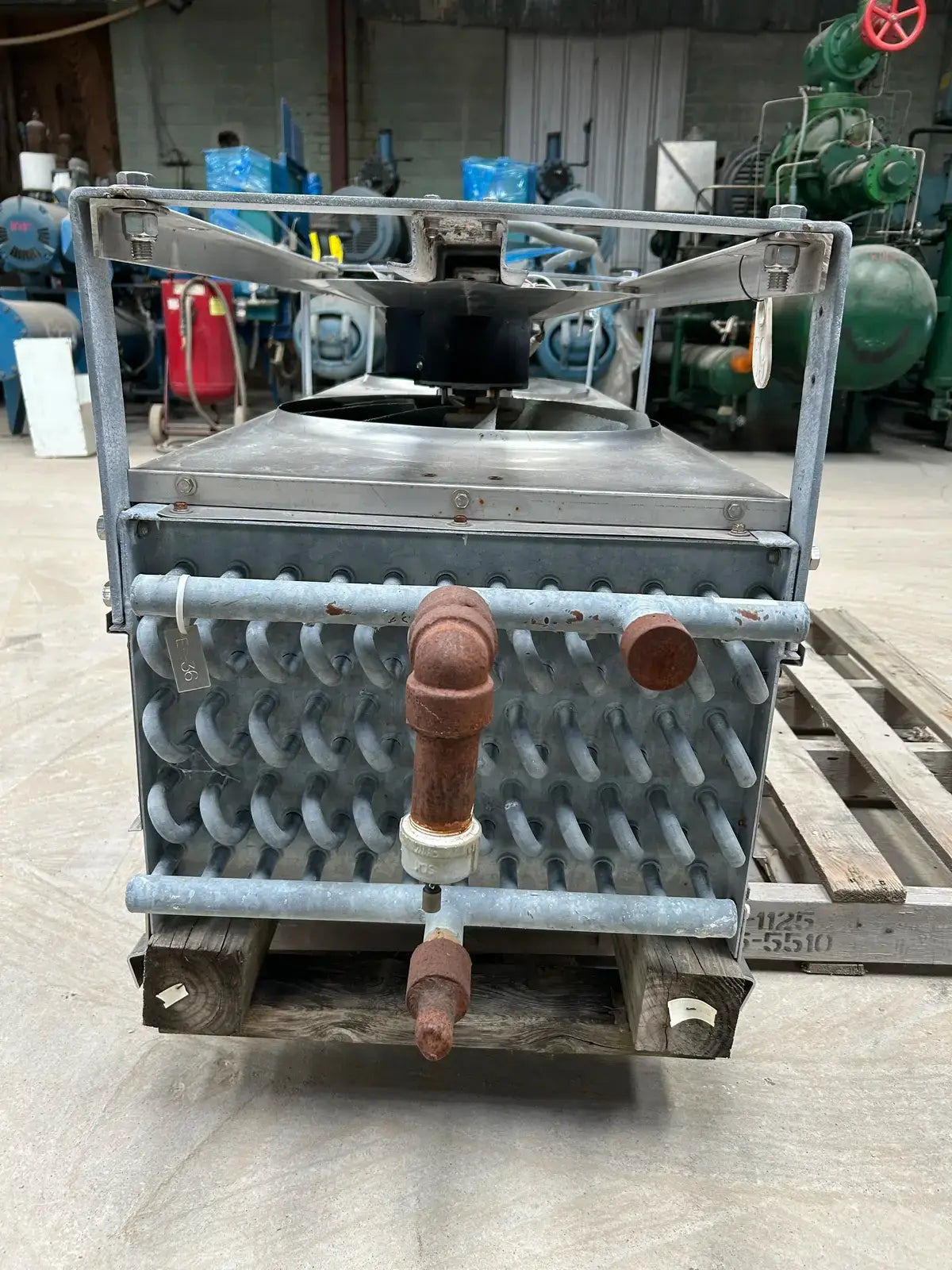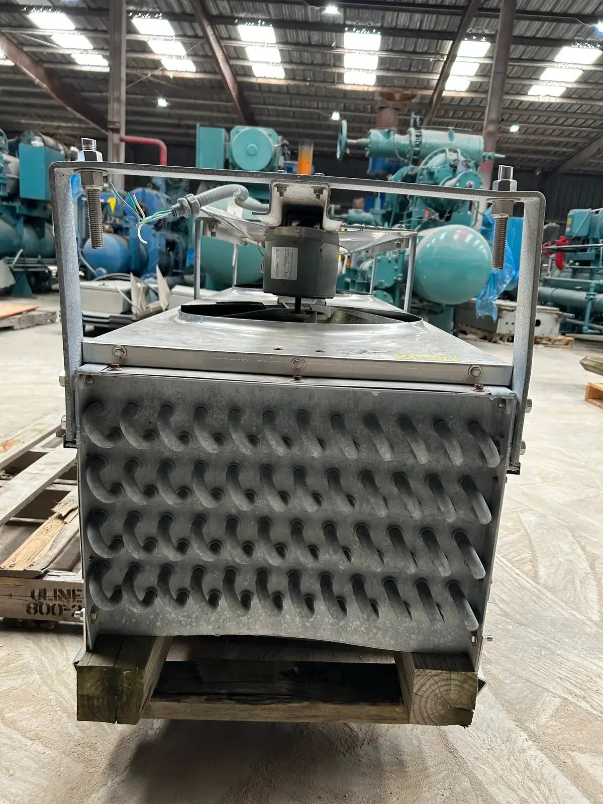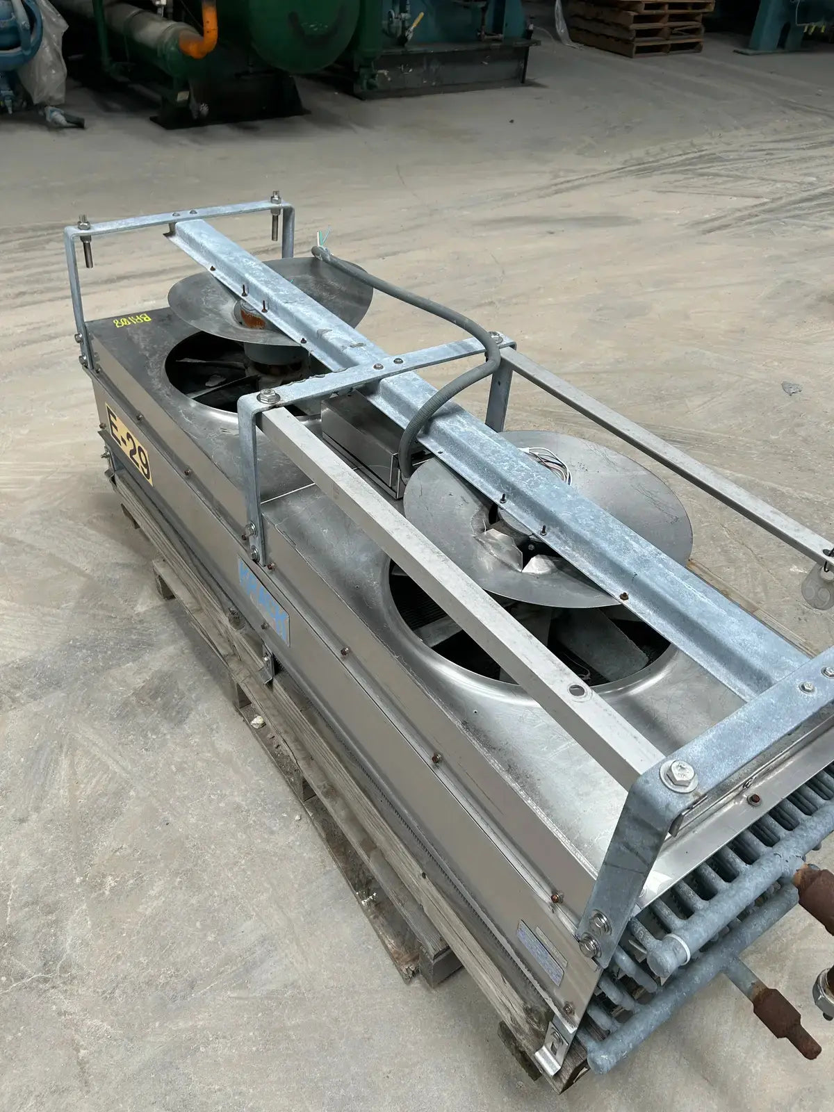 Evaporador enfriador Krack BTR28-HG-RBA. Motores de 1/6 hp y 3700 CFM. Gabinete y bandeja de drenaje de acero inoxidable. Unidad diseñada para alimentación inferior recirculada (amoníaco). 2,75 toneladas (33 000 BTU/h a 10 °C).