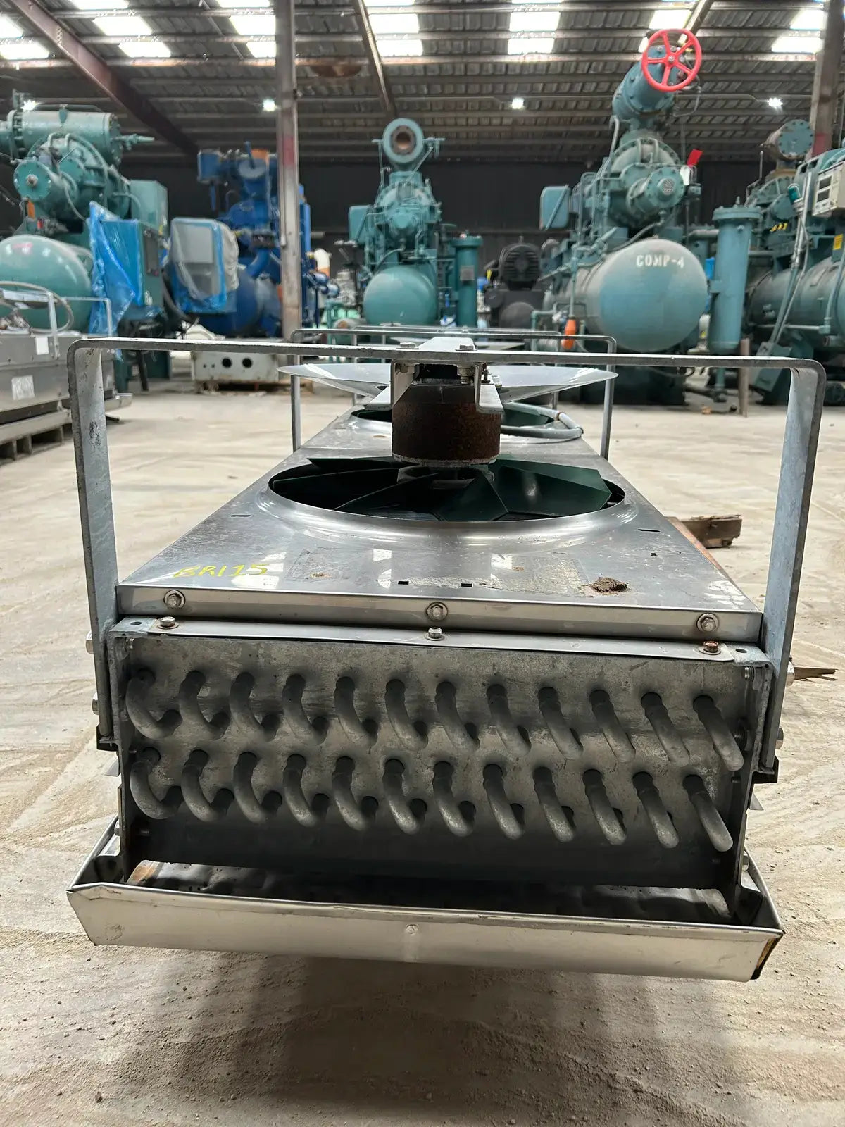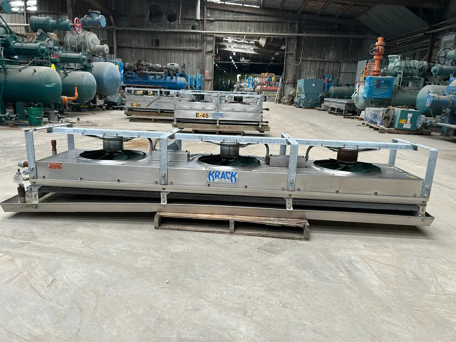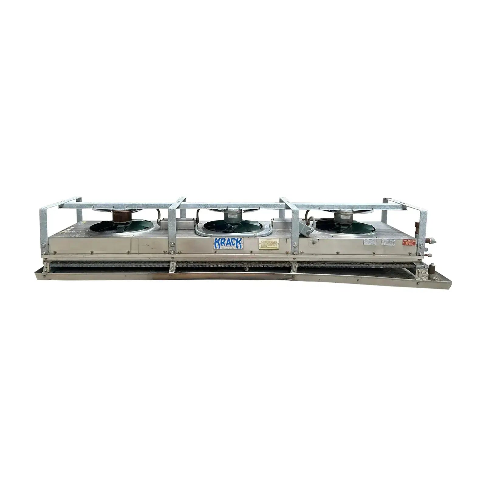 Evaporador enfriador Krack BTRS-34-RBA-HGU. 3 ventiladores, motores de 1/6 hp y 6000 CFM. Gabinete y bandeja de drenaje de acero inoxidable. Unidad diseñada para alimentación por expansión directa (amoníaco). 2.95 toneladas (35,400 Btuh a 10 grados de temperatura ambiente).
